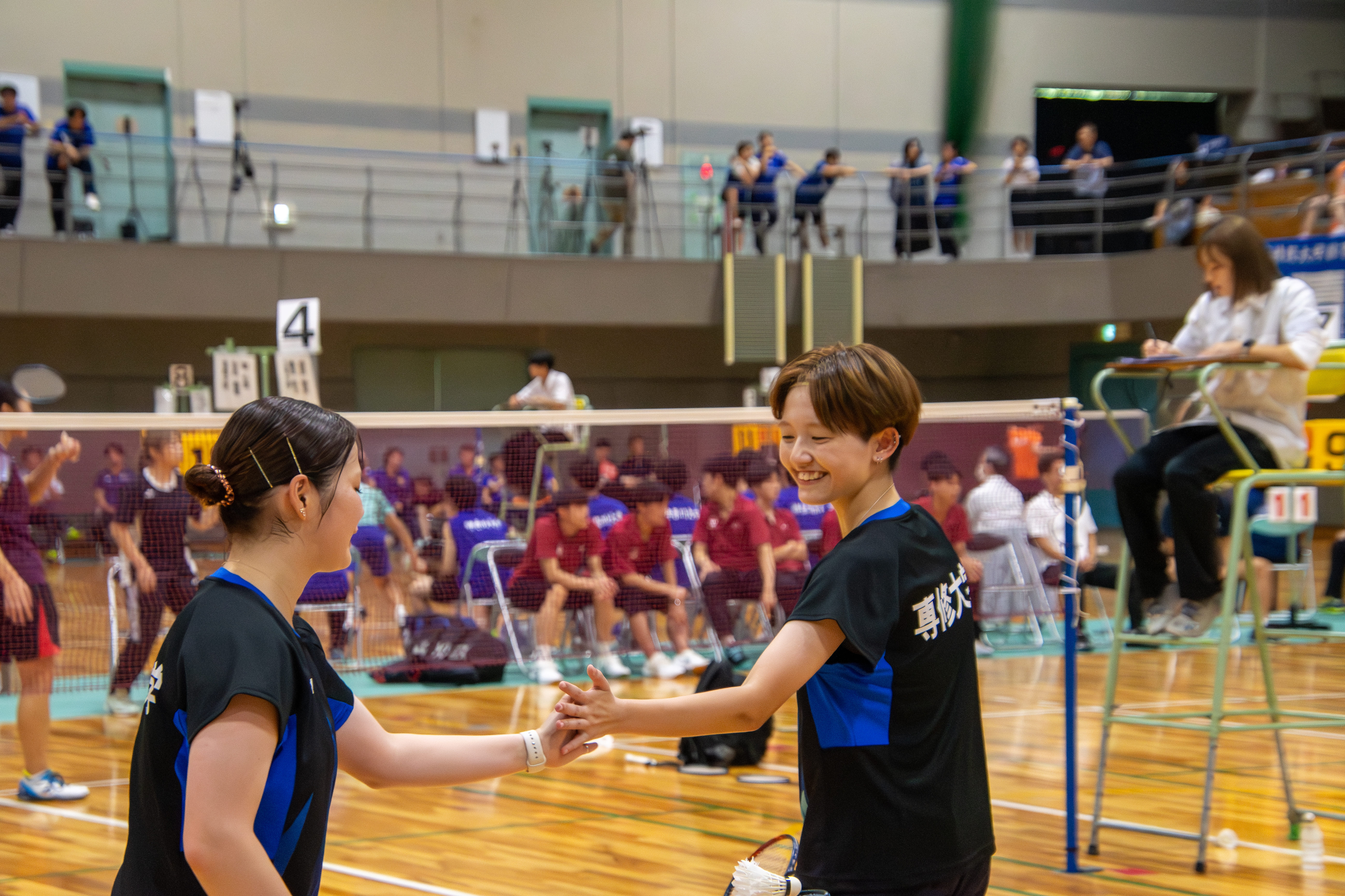 今年度の専大体育会における嬉しいニュースの一つが、女子バドミントン部の1部リーグ復帰です。この写真は秋季リーグ戦で撮影したもの。試合中、笑顔でハイタッチする瞬間をうまく切り取ることができました。嬉しいことに、この写真は先輩が学内で主催した写真展にも採用していただきました。写真に写っているのは、左が来年度の部長・吉田陽萌(文3・金沢向陽高)選手、右が副部長・堀心海(文2・聖ウルスラ学院英智高)選手です。1部の舞台で戦う彼女たちの活躍に、ぜひご注目ください!