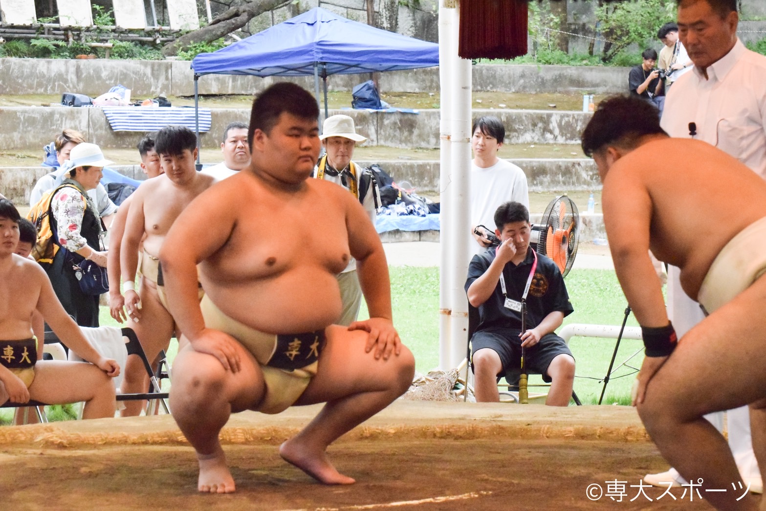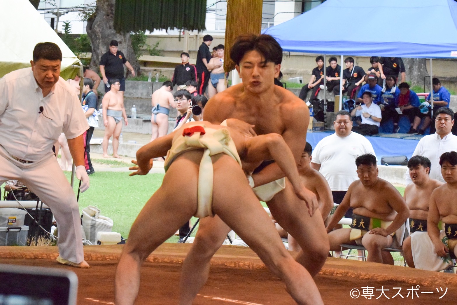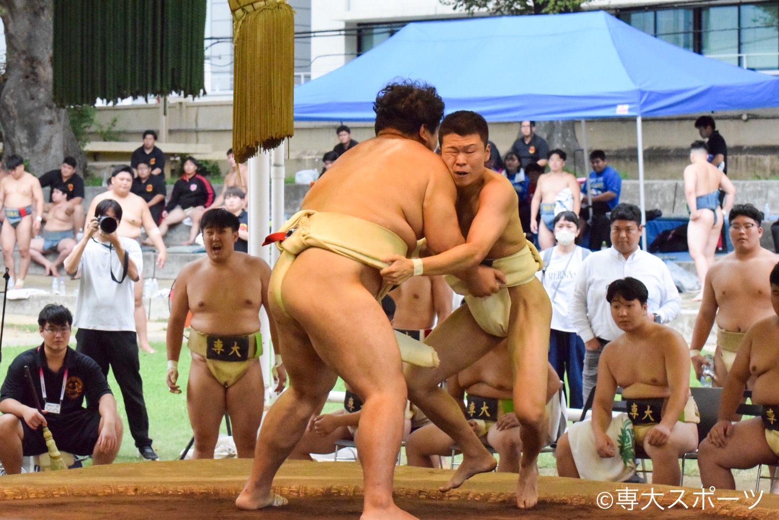 先鋒は山田。いきなりまわしを取られそうになるが、上手くかわし上手返しで点を挙げ、後陣の仲間を大きな声で鼓舞した。しかし、二陣の新阜から流れに乗れず3連敗。追い込まれた専大だったが、中堅の鈴木が相手の粘り強いつかみに耐え、押し倒しで得点を挙げるなど息を吹き返した。だが、六鋒の水野、七鋒の門傅が相手を押し返すことができずに連敗。スコアを2-5として1部残留とはならなかった。