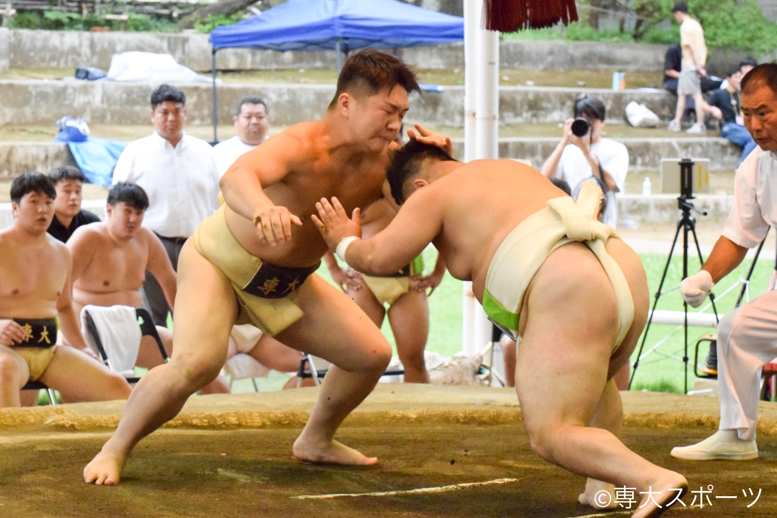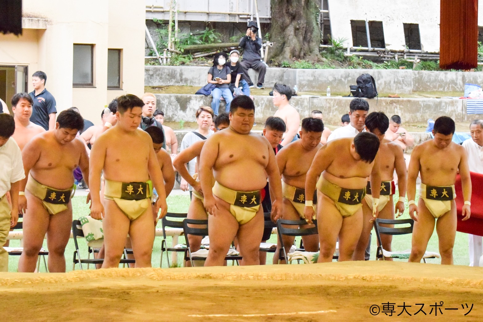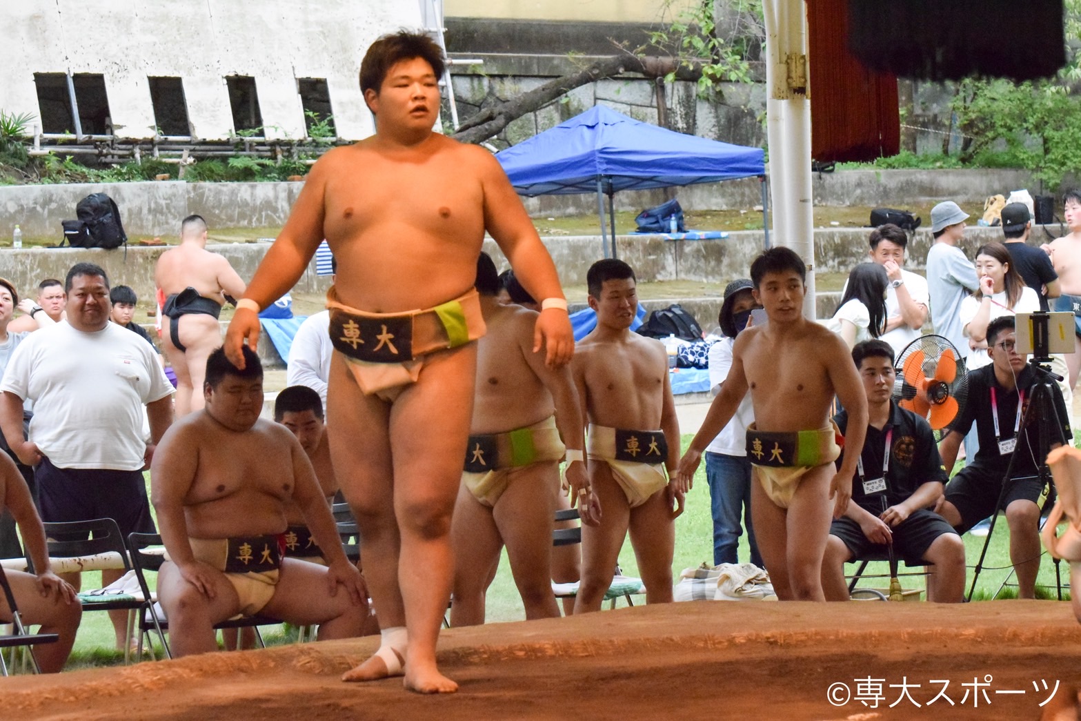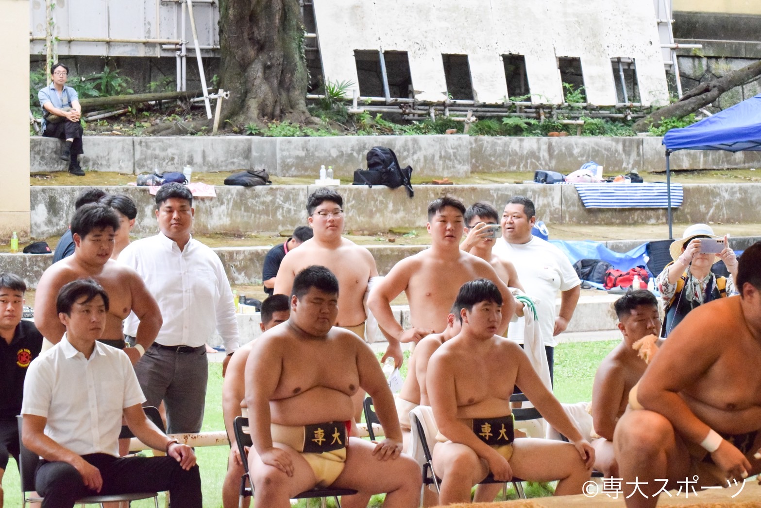 先鋒は山田。いきなりまわしを取られそうになるが、上手くかわし上手返しで点を挙げ、後陣の仲間を大きな声で鼓舞した。しかし、二陣の新阜から流れに乗れず3連敗。追い込まれた専大だったが、中堅の鈴木が相手の粘り強いつかみに耐え、押し倒しで得点を挙げるなど息を吹き返した。だが、六鋒の水野、七鋒の門傅が相手を押し返すことができずに連敗。スコアを2-5として1部残留とはならなかった。