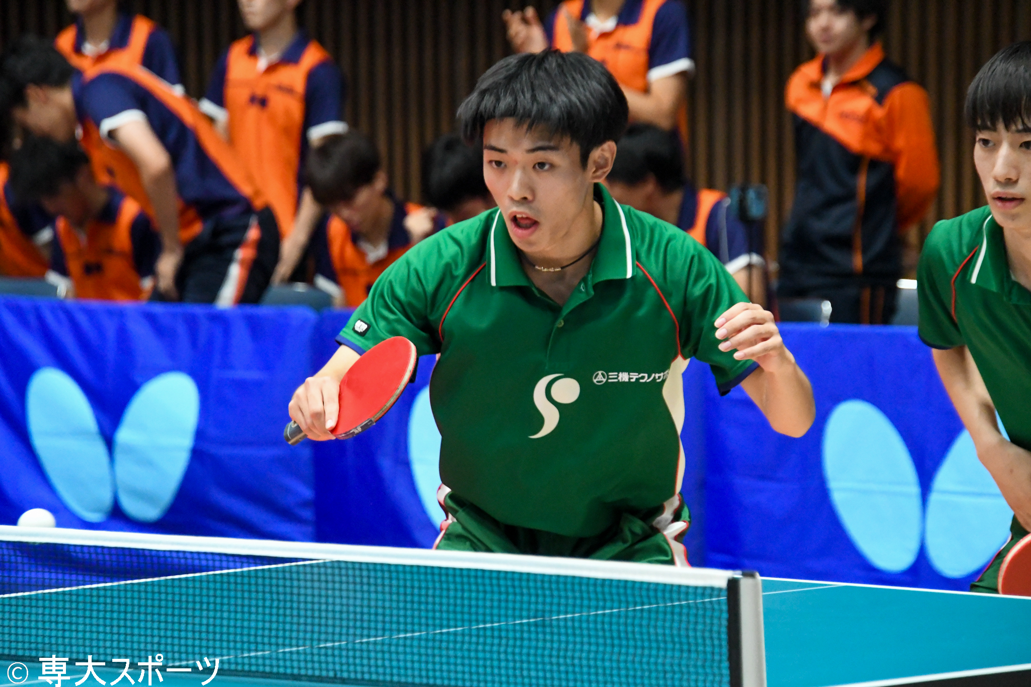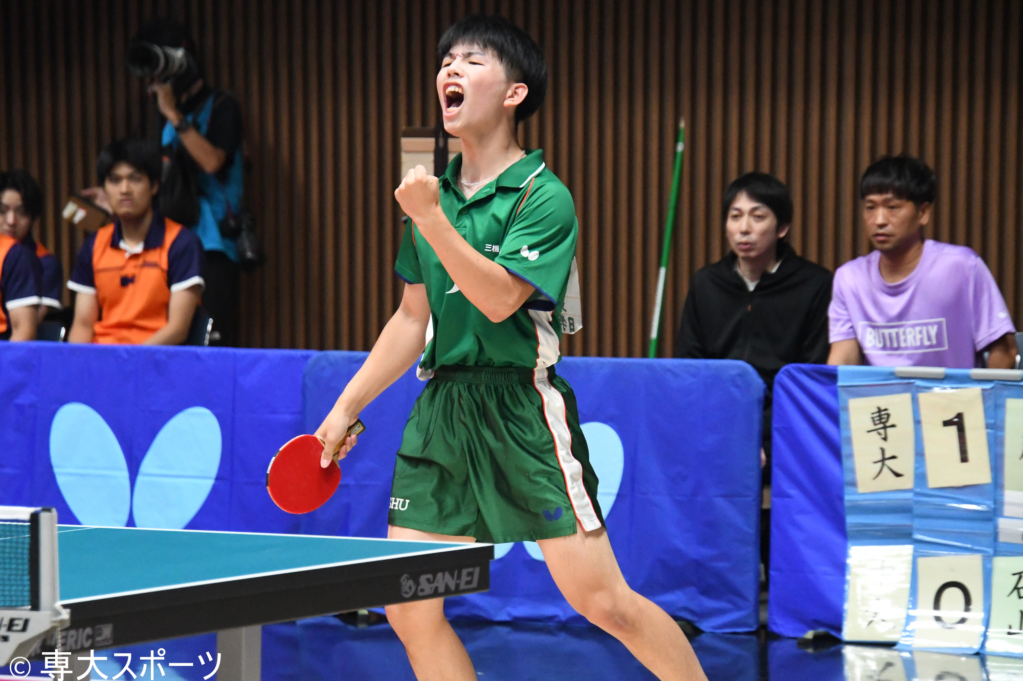 チームの勝利まであと1勝となったが、5番手の溜大河(経済2・静岡学園高)、6番手の二井原有真(文2・育英高)が共に敗れ、勝敗の行方は中島瞳輝(文2・新潟産大附高)に託された。リーグ戦最後の試合ということもあり、両チームの応援は次第に熱を帯びていった。1セット目は相手の強打に対して粘り強く返球し、8-7からポイントを3連取して1歩リードする。ここから流れを掴むとその後も11-8、11-6と連取しストレートで勝利。専大は4勝2敗となり3位入賞を決めた。