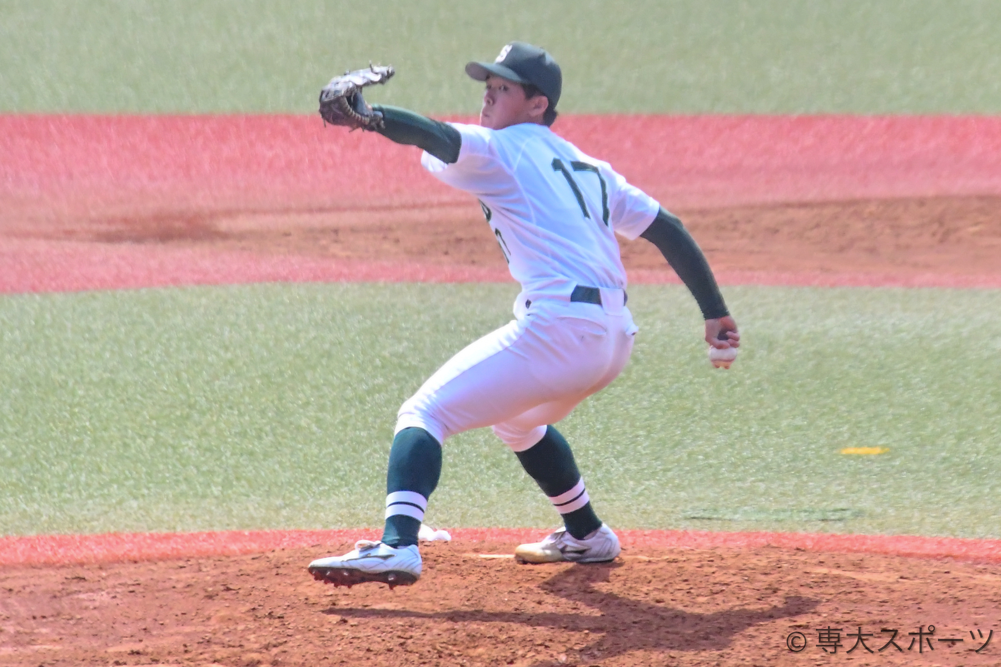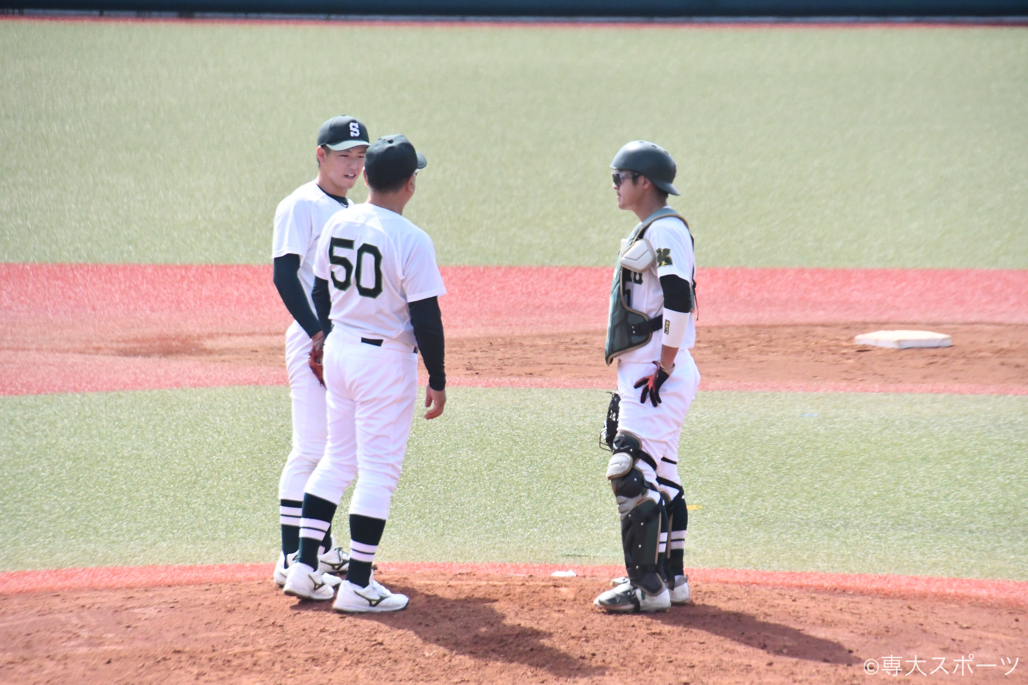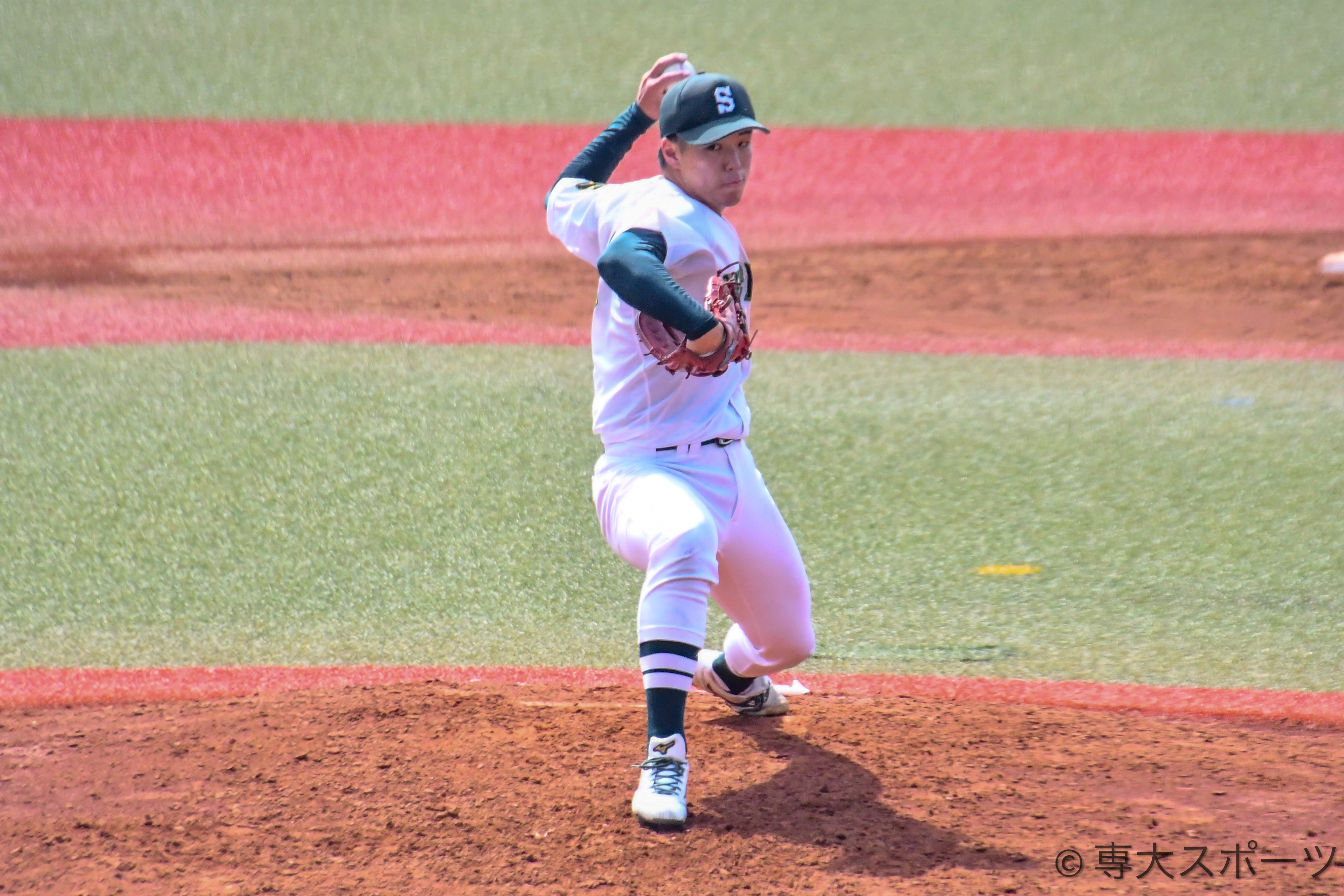 8回には廣崎漣(経営2・浜松開誠館高)、9回は梅澤翔大(経営1・専大松戸高)が登板し、前節からの勝ちパターンで試合を締め括った。