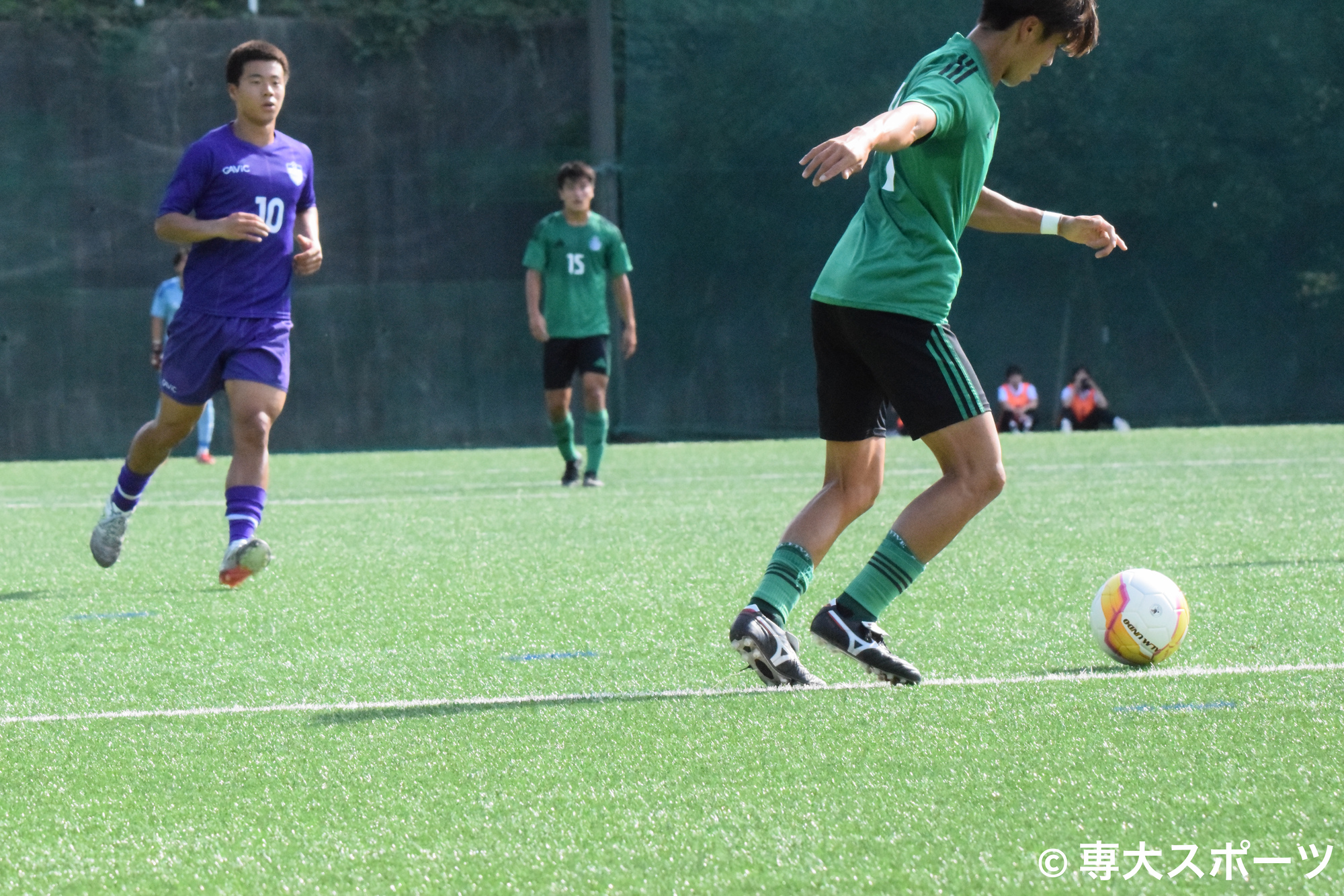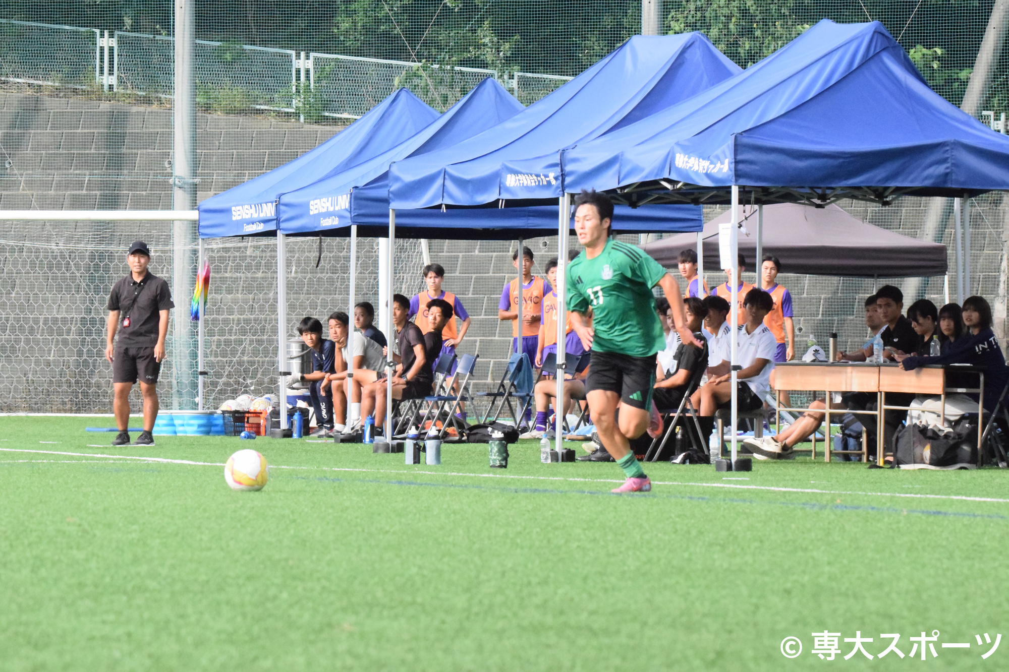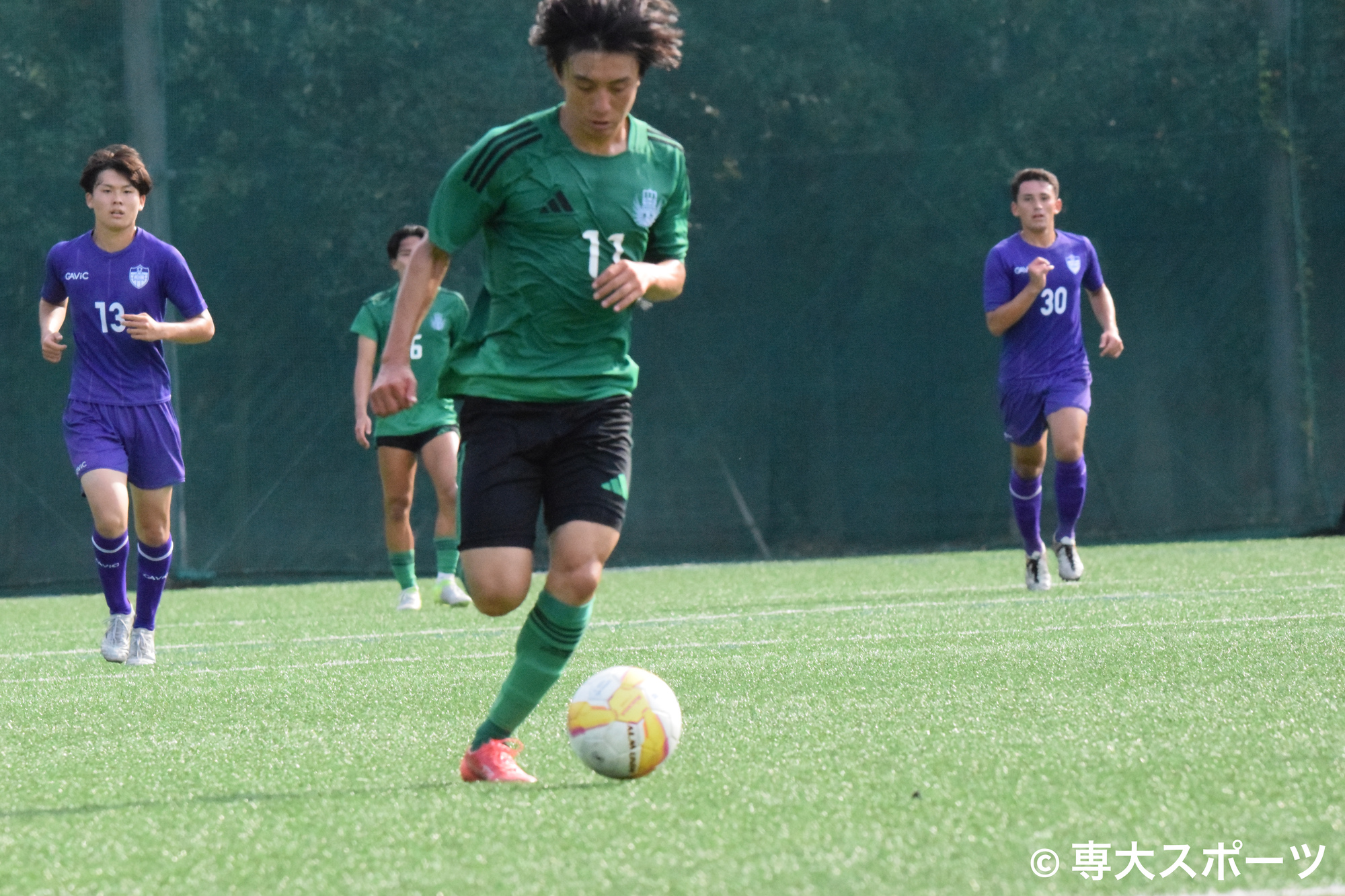 前半13分にはハイプレスが追加点に繋がる。GKからボールを繋ぐ立教大に対して、専大は前線からのハイプレスで圧力をかける。再び相手GKにボールが渡ると、松本と道白がパスミスを誘い、戸田はパスカットからミドルシュートを狙うも相手にブロックされる。こぼれ球を拾った河野からパスを受けた道白は、左足を振り抜くとゴール左上に決まり3-0。