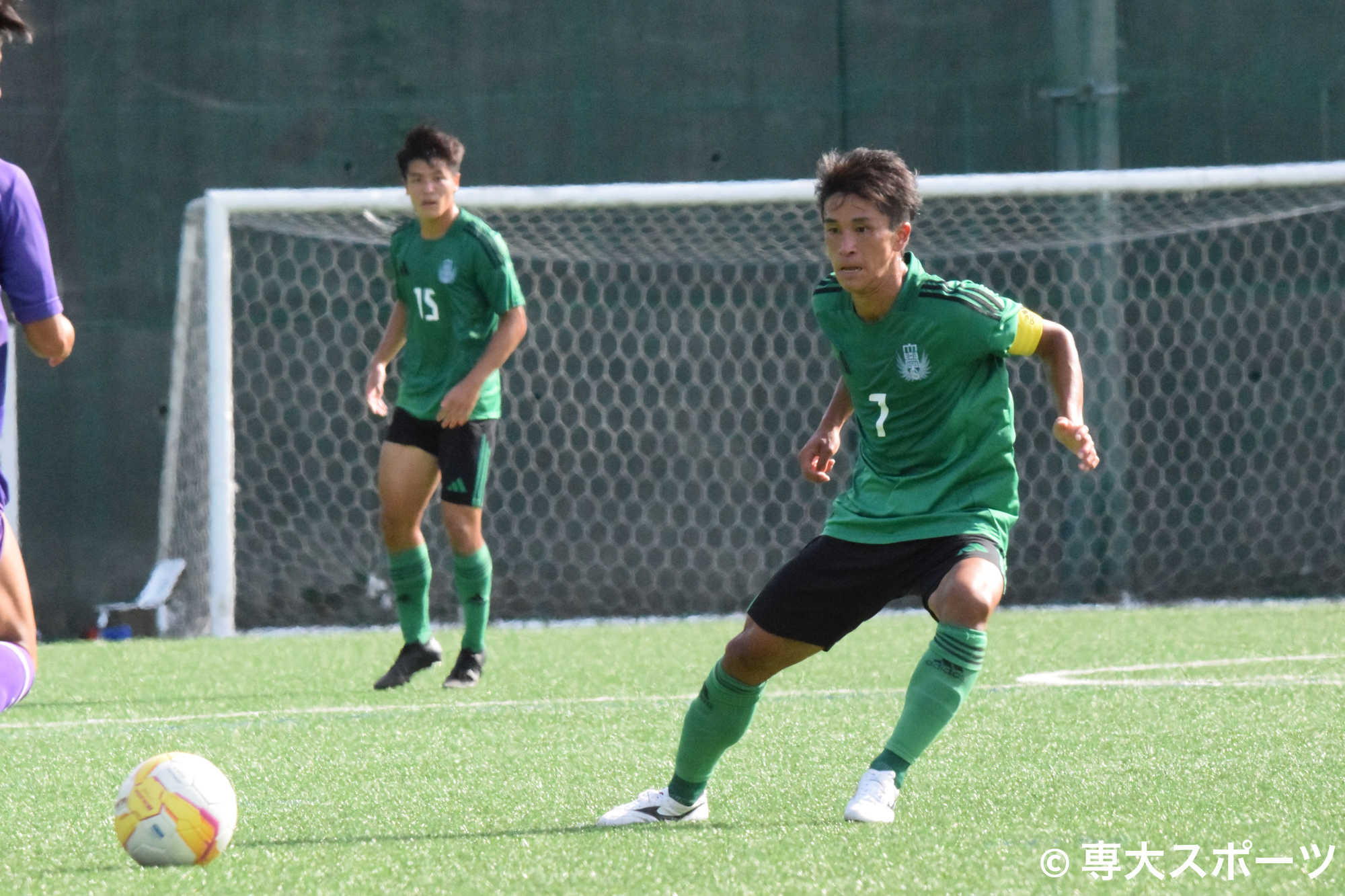 専大は試合序盤から攻勢を強めて先制に成功する。前半5分、佐藤漣のドリブルから河野と道白がパスワークで連携を見せる。河野のシュートはクロスバーに当たって跳ね返るも、松本のボレーシュートでゴールネットを揺らす。