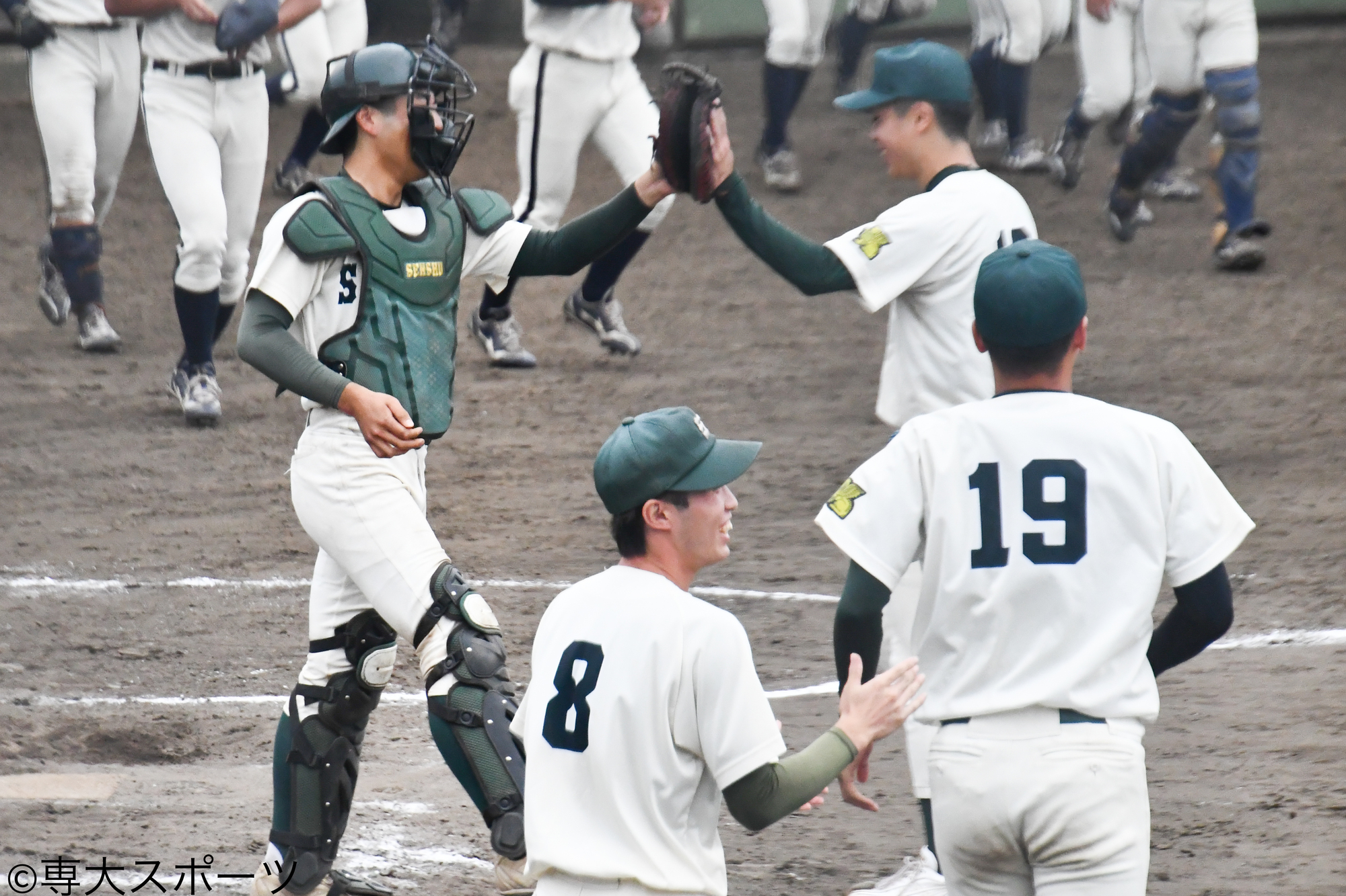 ▲試合終了直後、バッテリーを組んだ高橋秀昌(法4・専大松戸高)とハイタッチを交わした
