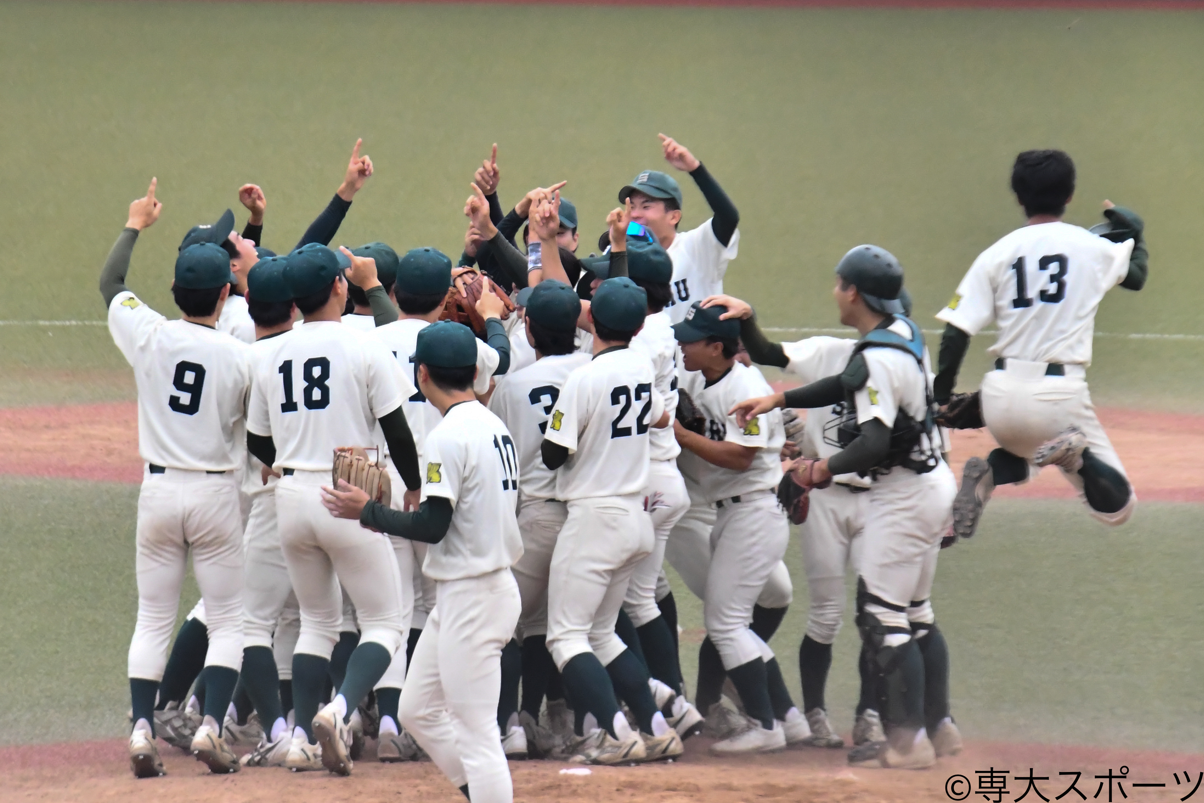 ▲マウンドに集まり空に向かって人差し指を掲げた