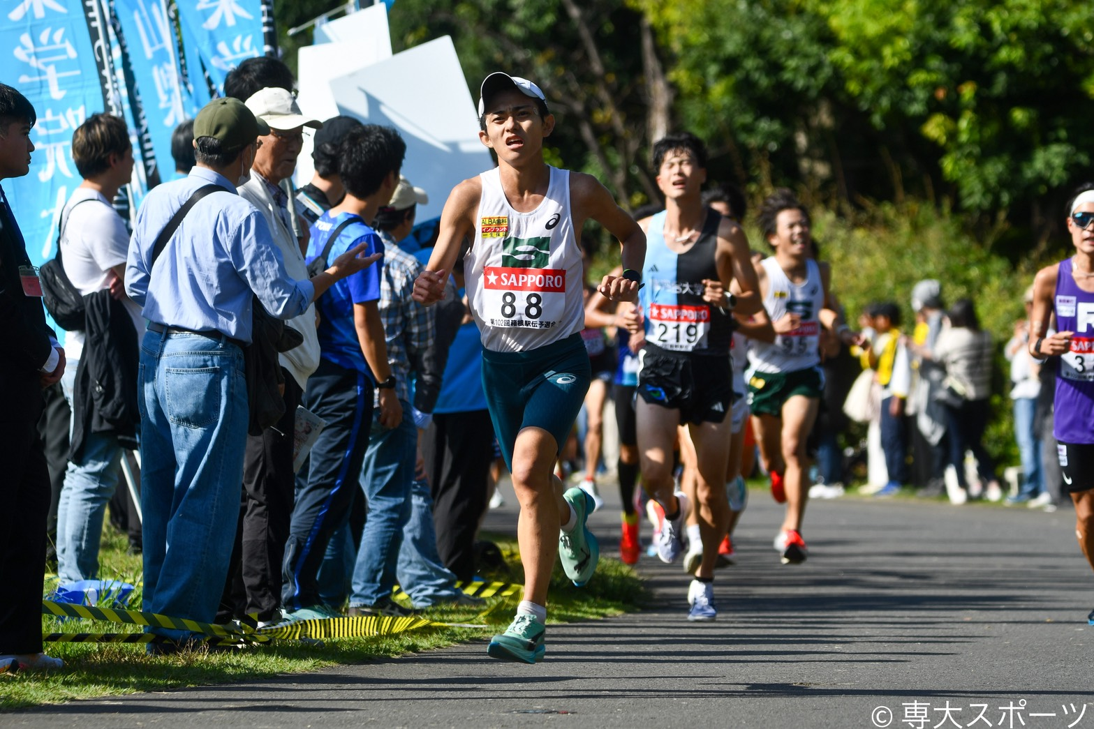 「ハーフマラソンという距離はこれまで箱根本選を入れるなら5回目くらいで、結構どのレースも後半一気に、バテてしまうレース展開が多かったのですが、今回しっかり20kmまではイーブンで集団に付いていけて、ラスト少しタイムは落ちてしまったんですけど、ほぼほぼイーブンで、良い感覚で行けたと思っています。レースプラン的には悪くはなかったんですけど、そもそもの力が足りてなかったので、これだけ後半に落ちていたりしなくても、順位は落ちてしまいました。来年に関しては、個人でしっかり最初から突っ込んで、最後も上げることを目指していきたいです。今の自分に関しては、最低限であったかなと思います」