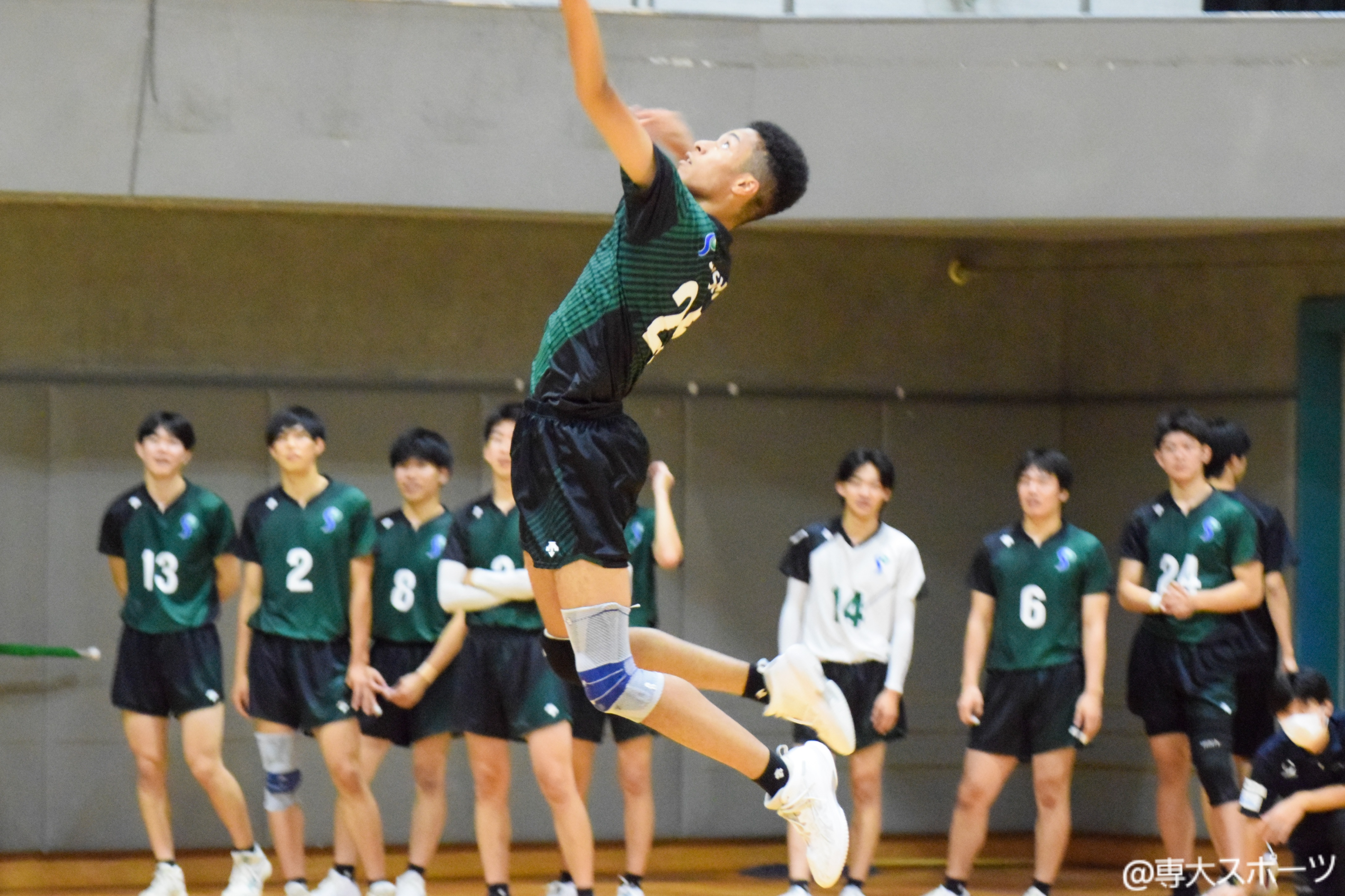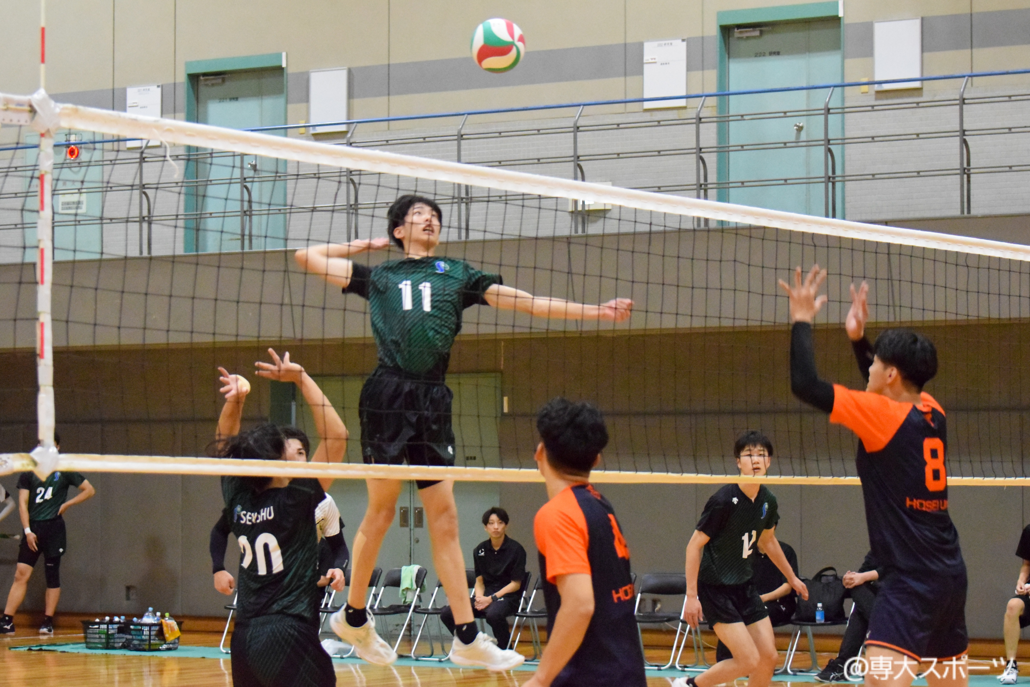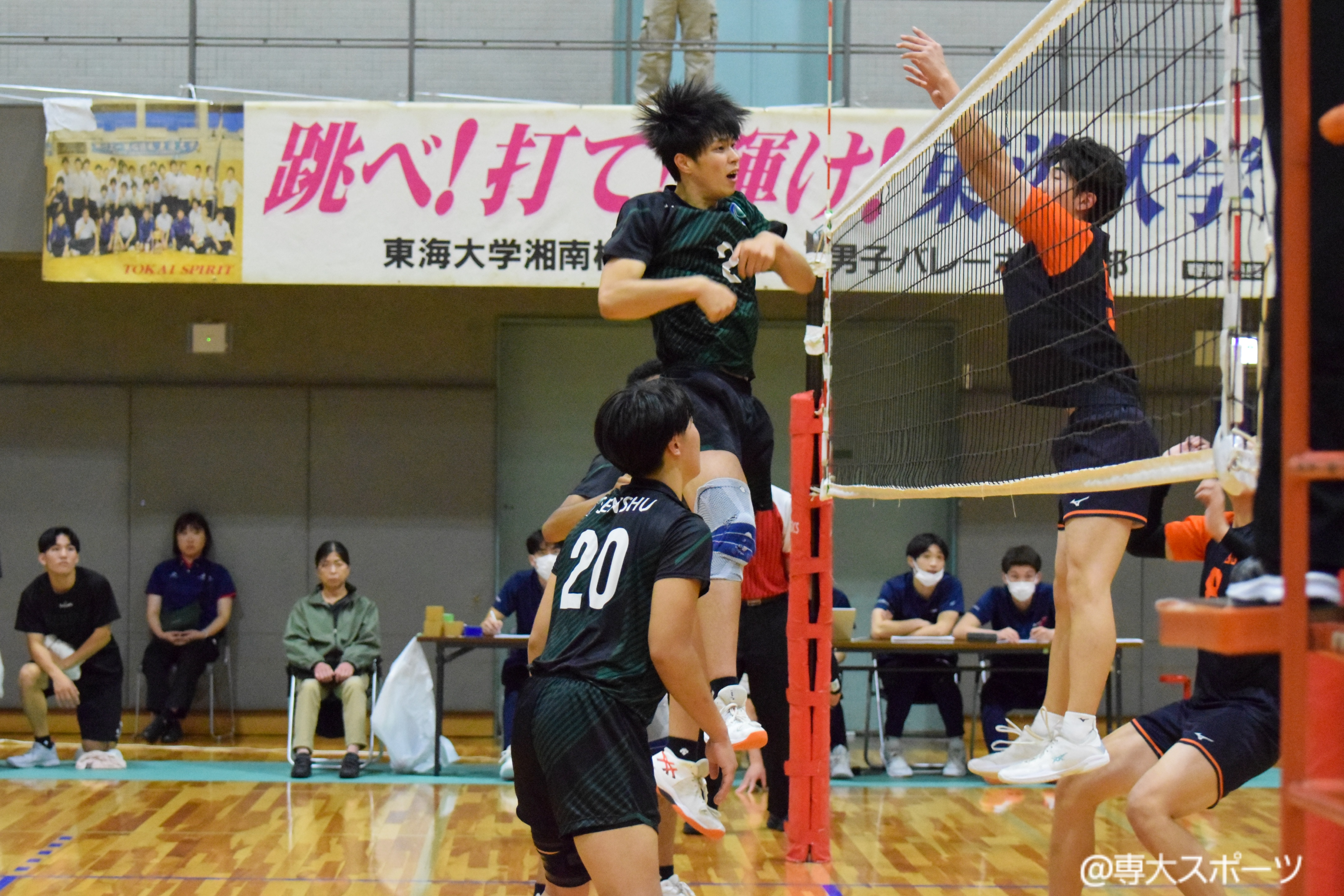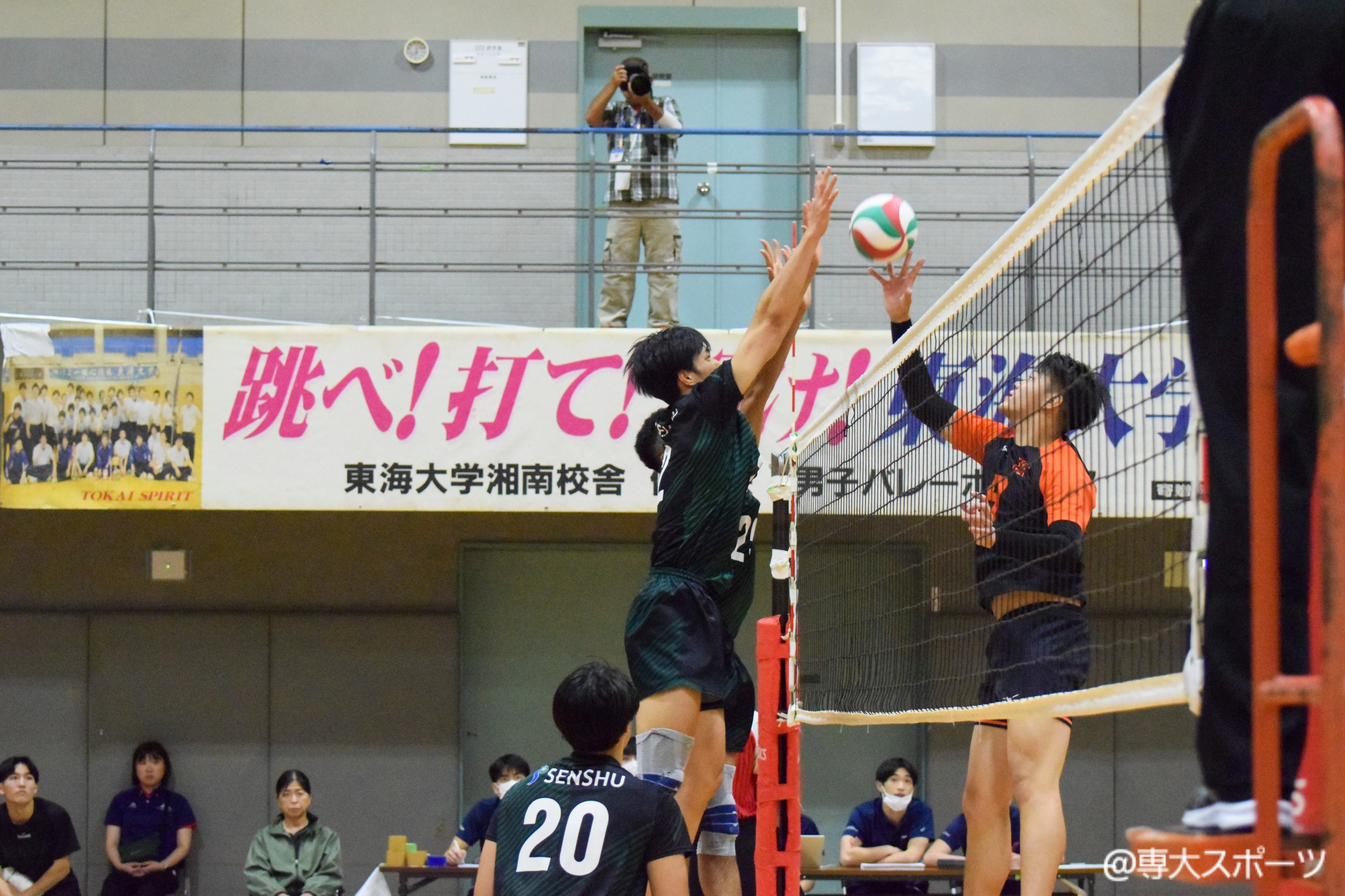 秋季リーグも残すところ3試合となり、専大は法政大と対戦した。第1セット序盤から新居良太(経済3・開智高)とマサジェディ翔蓮(文1・福大大濠高)を中心にスパイクで果敢に得点を重ねていく。だが、相手のスパイクやブロックに阻まれ連続失点する場面も見られた。そして、第1セットは23-25と僅差で相手に奪われ、第2セットは開始早々相手のサービスエースやアタックのミスで6連続失点を許してしまう。しかし、佐藤ラニ海(経営1・北海道科学大高)やマサジェディを中心に鋭いスパイクで得点し、同点に追い付く。第2セット終盤は両者一歩も譲らずマッチポイントを交互に取り合い、接戦を制した専大が30-28でこのセットを獲得した。第3・4セットは拮抗した試合運びとなり、最後は専大の勢いが勝り、3-1で法政大に勝利。2連勝を決めた。
