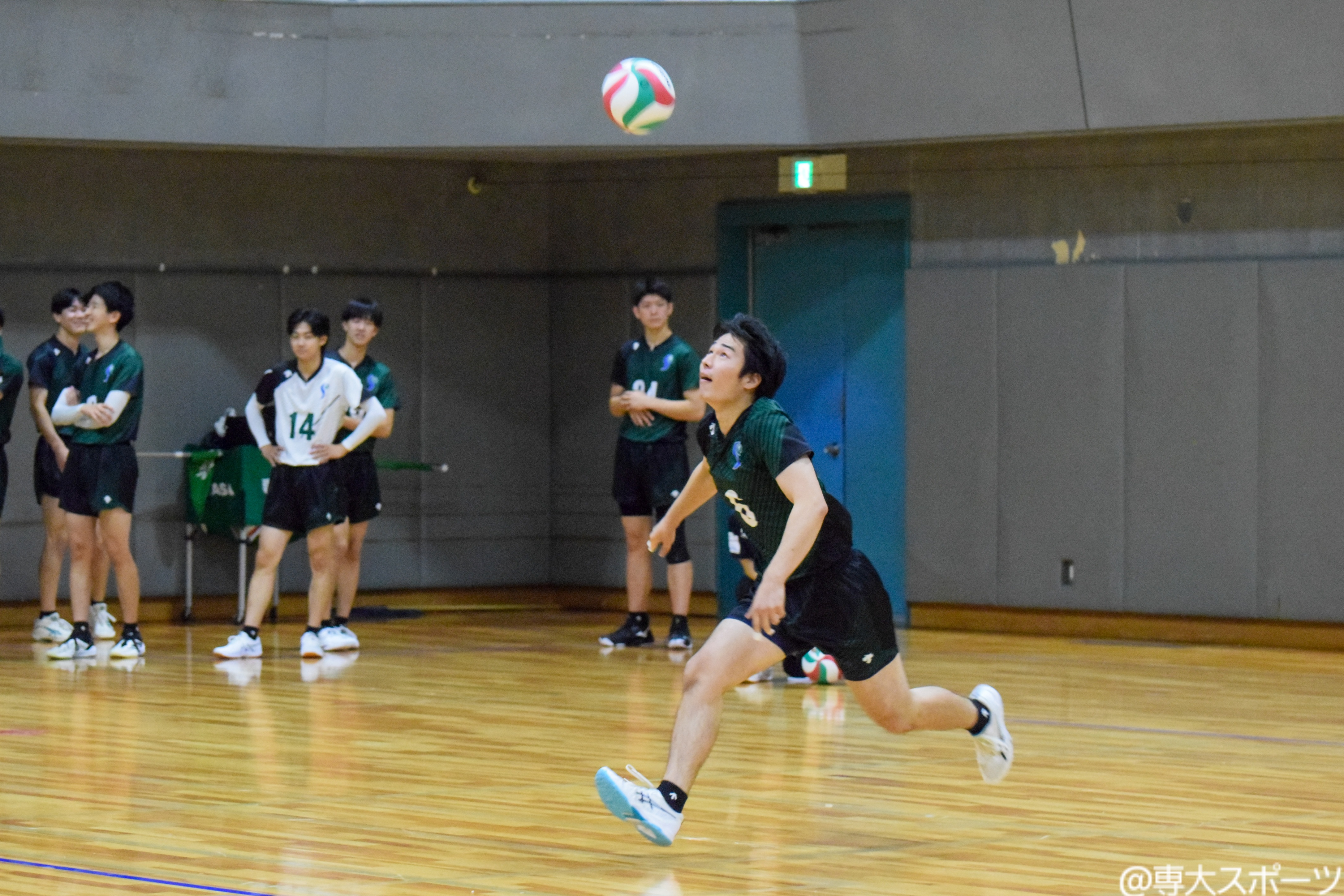 第1セットは序盤から新居のサービスエースやマサジェディの鋭いスパイク、さらにはブロックで畳み掛け、12-9と相手に3点差をつけた。しかし、相手の高いブロックに攻撃が阻まれ、さらにスパイクを決められ同点に追い付かれる。その後も新居と千葉貫世(経済4・東北高)が緩急のある攻撃で点差を詰めていく。だが最後は専大のレシーブミスで失点し、23-25と惜しくもこのセットを落とした。