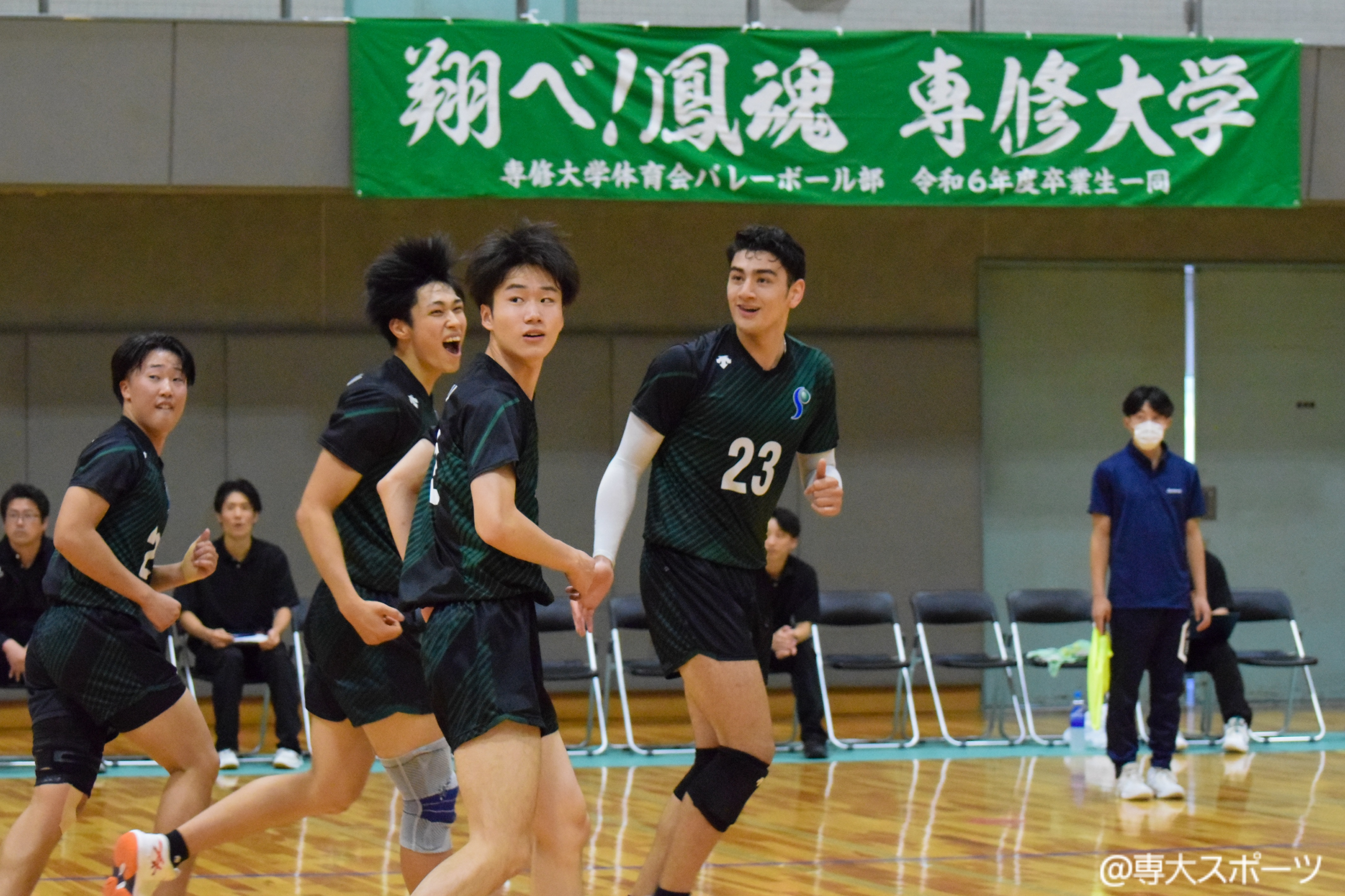 勝負の第4セットは、相手の強烈なアタックに守備で乱され、最大で4点差をつけられる。相手の強固なブロックに攻撃が阻まれるも新居や佐藤が好レシーブでチームを勢いづけた。マサジェディのスパイクで専大が先に20点台に突入し、佐藤の攻撃が連続で相手のブロックに阻まれる場面もあったが、マサジェディと新居が次々に得点した。最後は相手のブロックミスでこのセットを獲得し、3-1で勝負した。これで2連勝となった。今回の試合では課題として挙げていた20点目以降を取り切ることができた。佐藤は「まずはサーブで崩して、崩れなかったとしてもブロックでタッチを取って、こちらから展開して連続得点をイメージしていた」と20点目以降を振り返った。