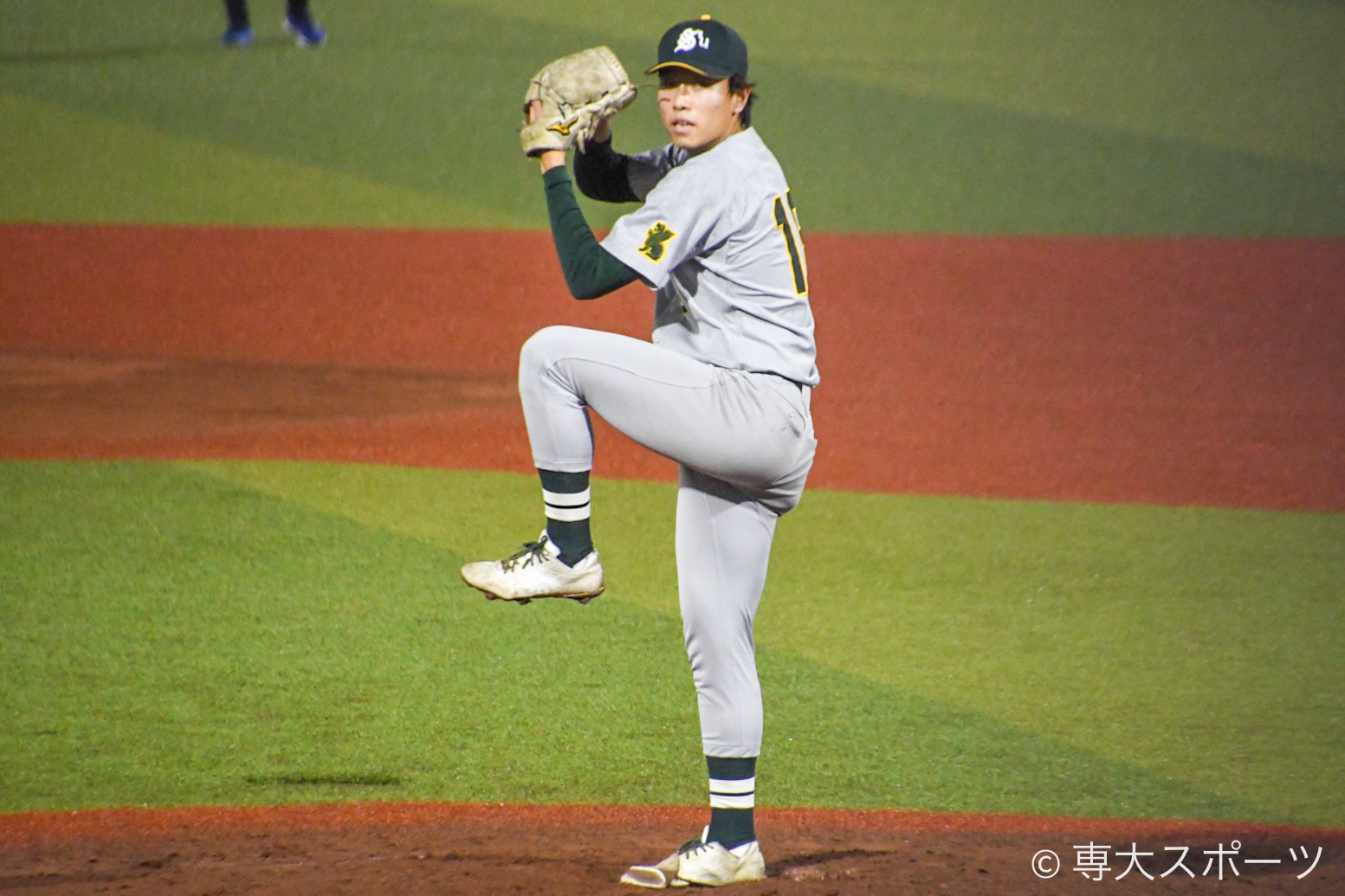 先発は平野大地(経営2・専大松戸高)が今季初登板。初回、初球で先頭打者本塁打を浴び、続く打者も安打で出塁。5番打者に対して四球を与え、押し出しで2点目を献上した。その後も適時打や犠打を許し、0-4に。8番打者に死球を与え、1/3回で降板。2番手の岡本陸(経済4・専大松戸高)がマウンドに立ち、相手の流れを断ち切った。しかし、その後は5回表までに2点を失い、0-6となった。