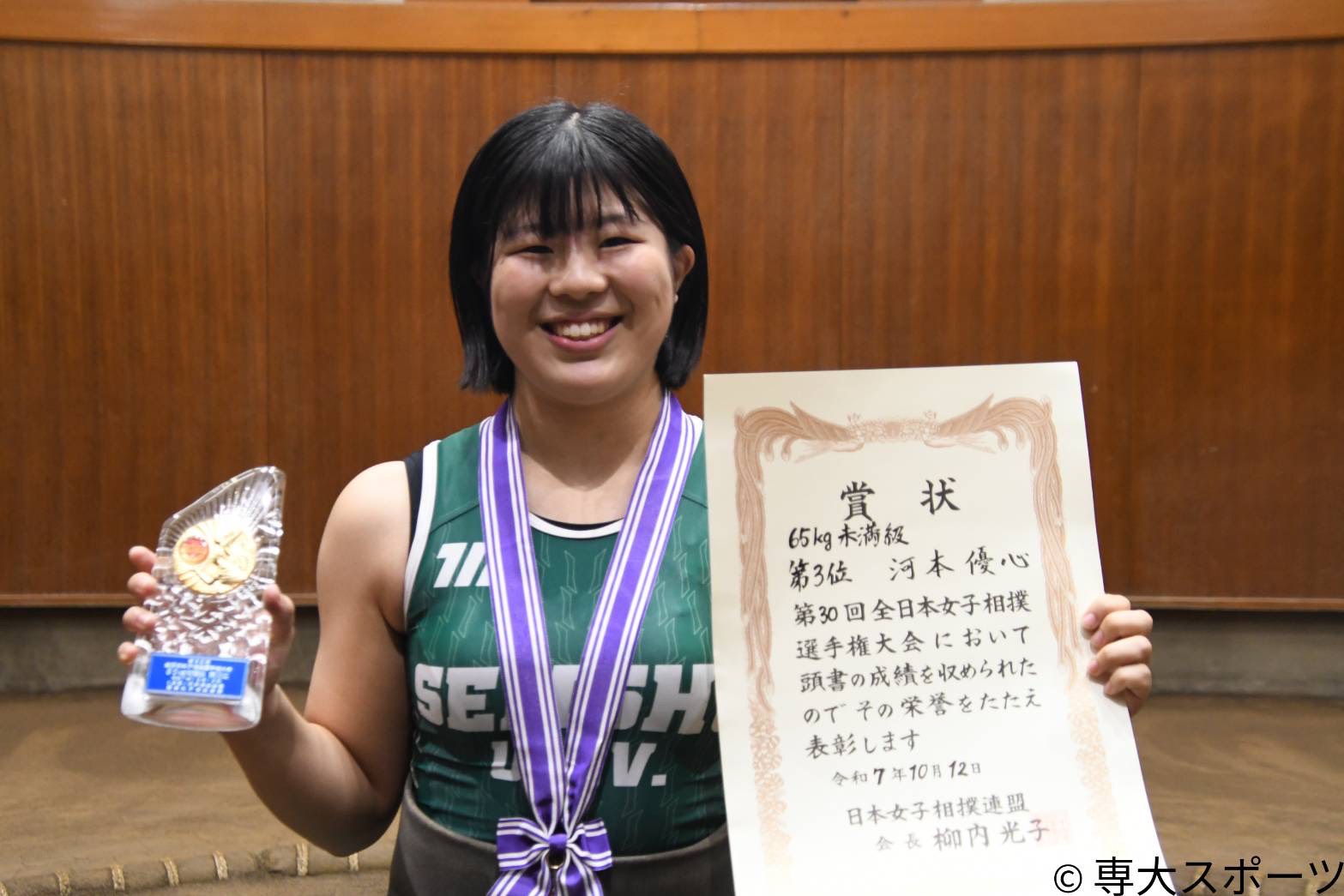 河本は「(大学入学直後は、)1回戦で負けてばかりで、悔しい思いをたくさんしてきた」と1年間を振り返った。それでも屈することなく稽古を続け、稽古の外でも試合中の動画を見返し、自身の動きを分析した。「大学に入ってから、動画を見て自分を客観的に見るようにしたら、立ち合いの速さが的確になった」と1年間の成長を実感。「負けても積み重ねてきたことは後になって出てくるとわかった。今後もこのまま続けてどんな相手でも自分らしい相撲をとって、もっと良い成績を残せるように頑張りたい」と闘志を燃やしている。