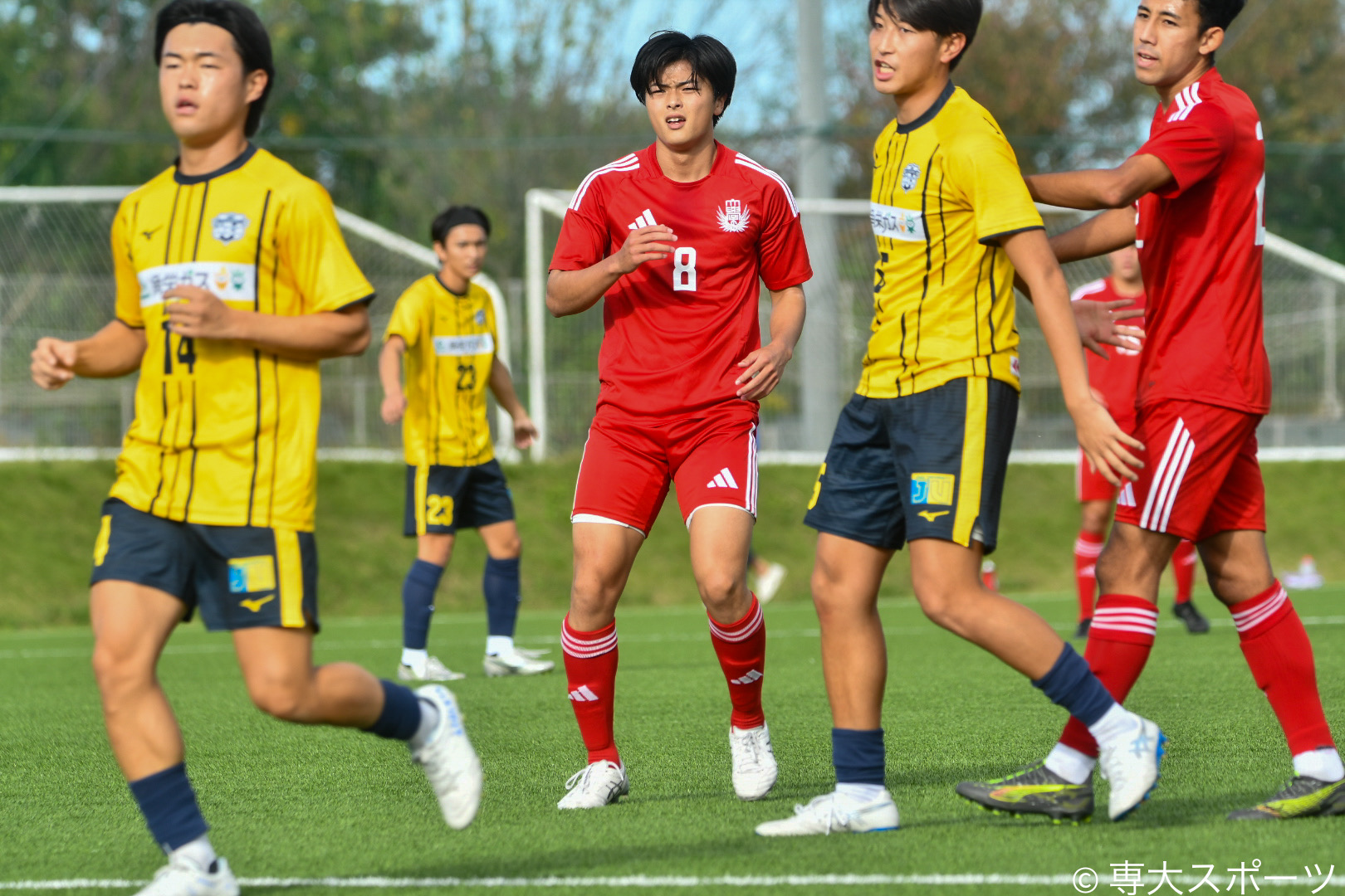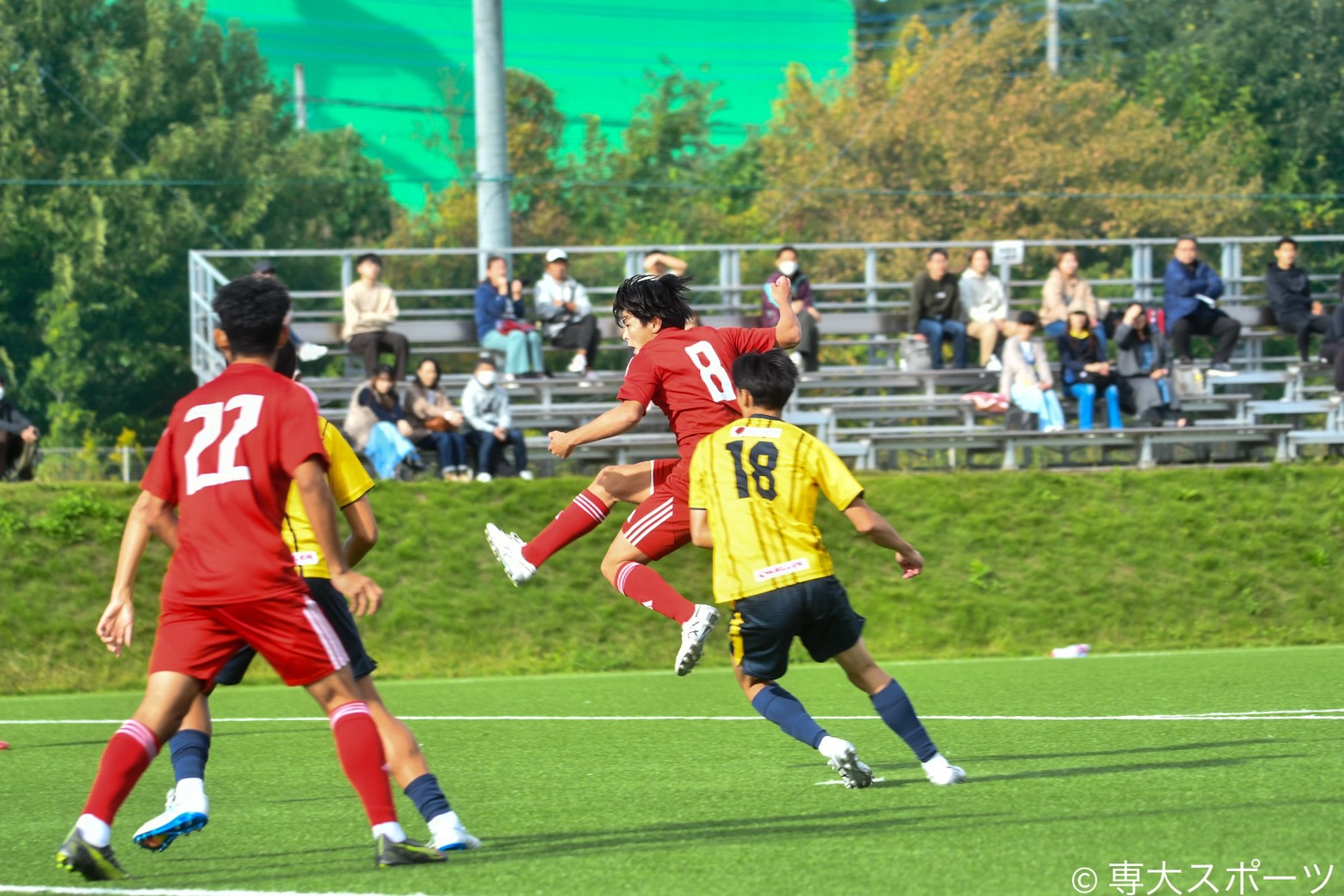 首位・城西大を相手に会心の勝利となった。2連敗中の専大は、立ち上がりからコンパクトな守備陣形を保ち、主導権を握る。前半8分に佐藤漣が左サイドを駆け上がり、左足でペナルティエリア中央にクロスを供給する。走り込んだ橋本がダイレクトで右足を振り抜くと、ゴール中央に決まり、先制に成功する。