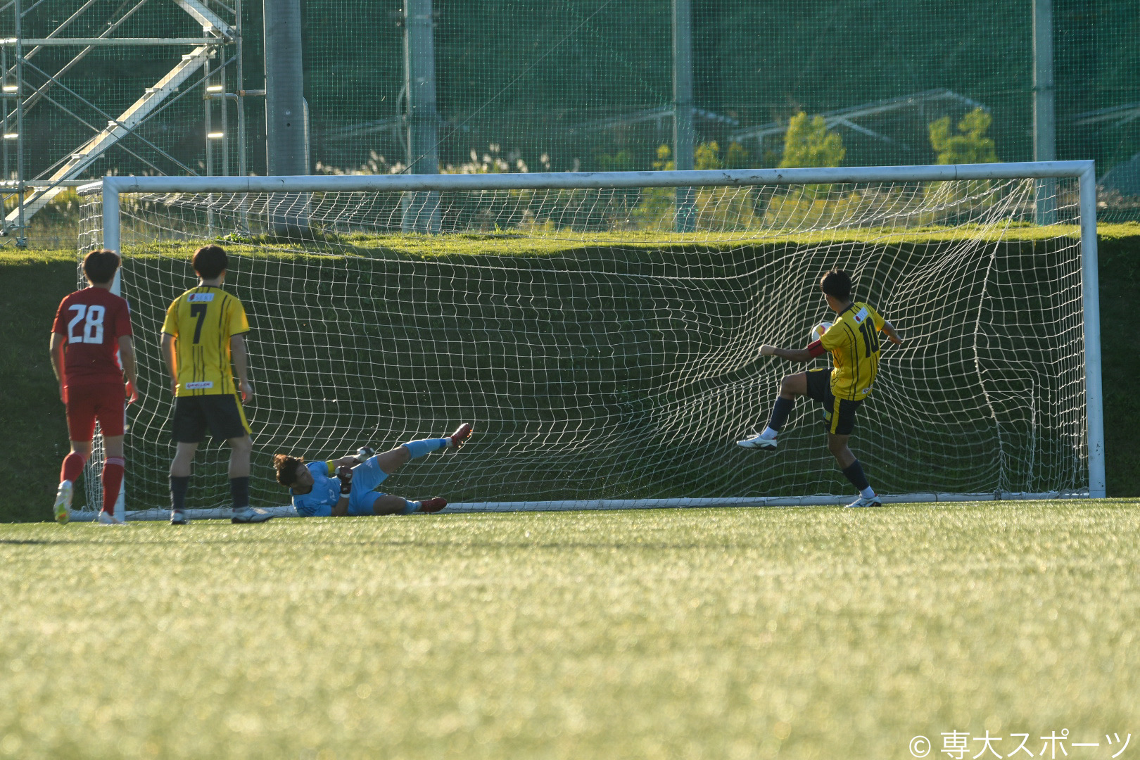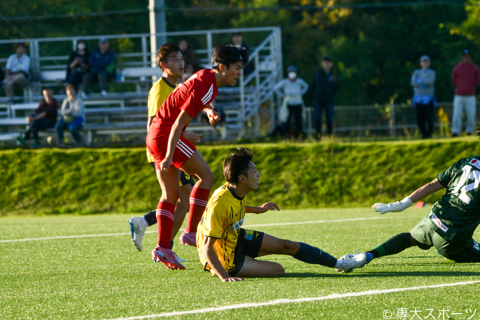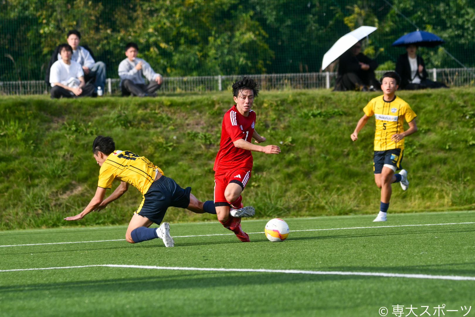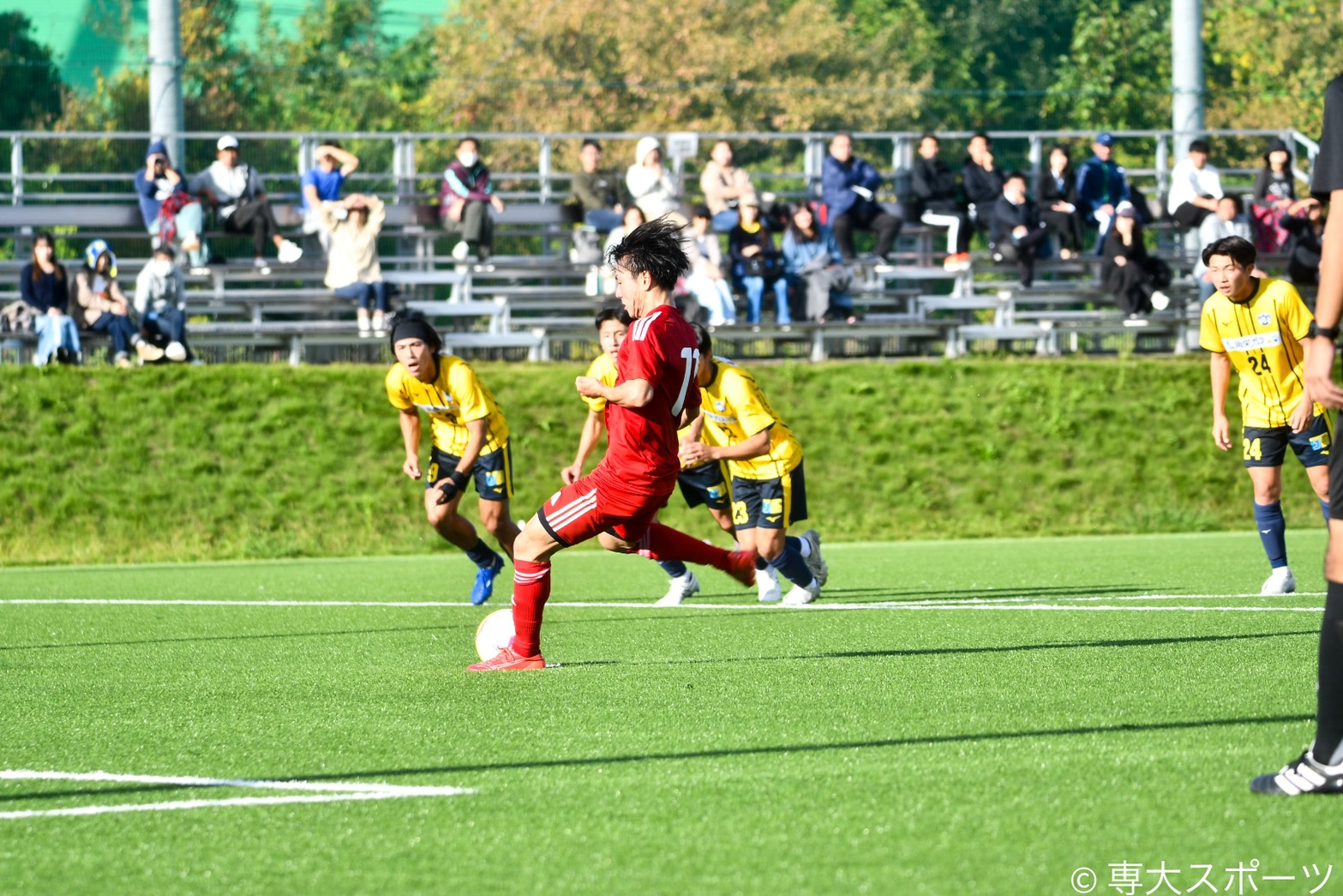 先制後もペースを握るのは専大。後方からパスをつなぐ相手に対し、最前線の寺島を筆頭に素早い寄せを見せて敵陣に押し込んでいく。東大樹監督から「丁寧に!」と指示が再三飛ぶと、相手から奪ったあとのパスを的確に回し、ゴールに迫る。