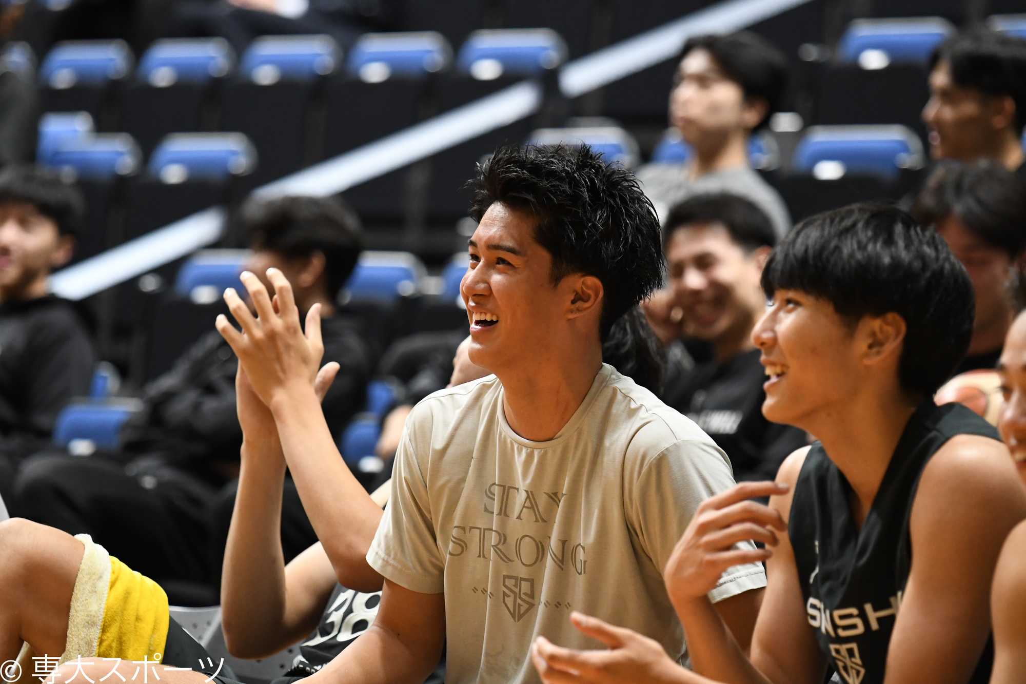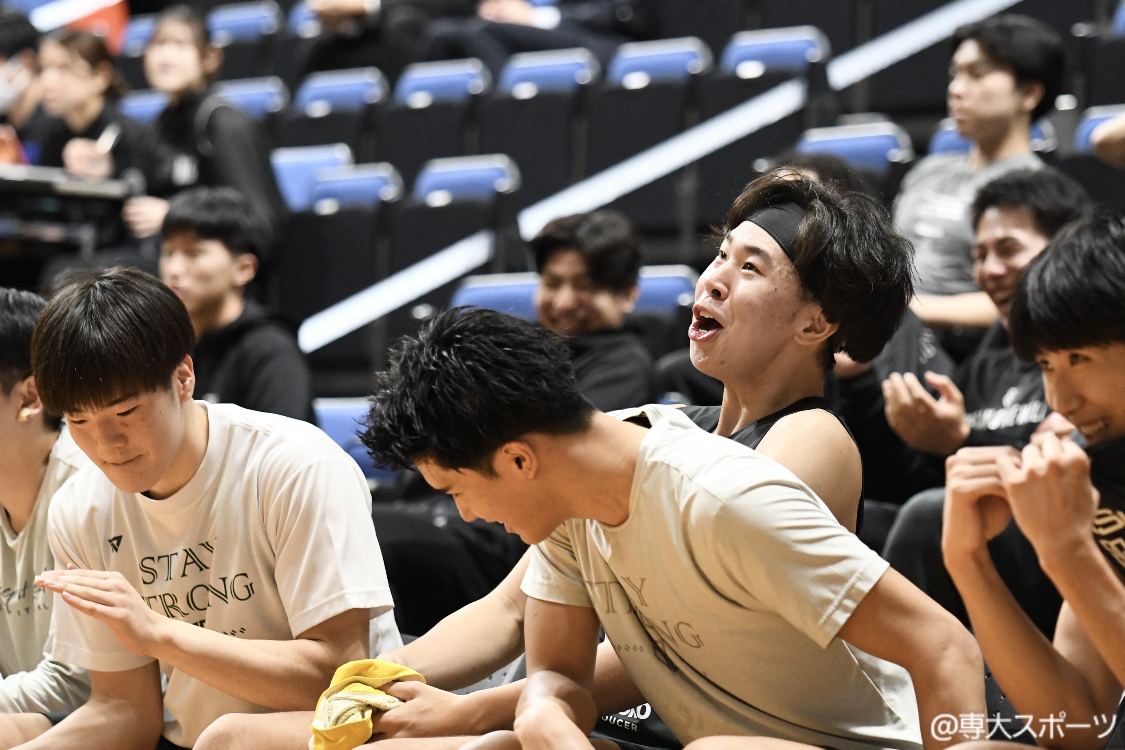 第4Qはルーキー達が躍動した。序盤から古山、後藤宙、黒島祥太(経済1・北陸学院高)が立て続けにシュートを決めた。さらに、途中出場の1年生・服部が3ポイントを連続で決め、中大に畳みかけていく。残り48秒で高橋がシュートを放ち、75-70と相手に5点差をつけた。残り14.8秒、75-72と逆転される危機もある場面で専大ボールとなり、最後は相手の連続ファウルから高橋がフリースローを2本とも決め、77-72で試合終了。22戦に及んだ激闘に幕を閉じた。