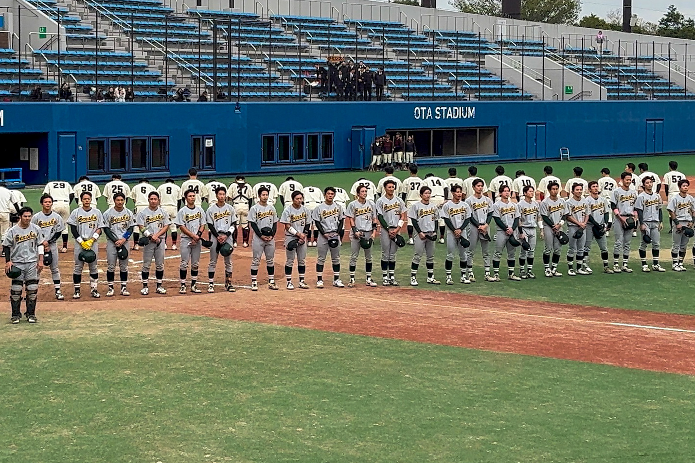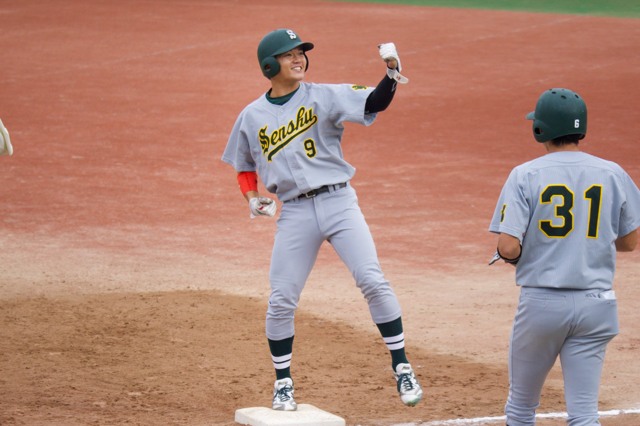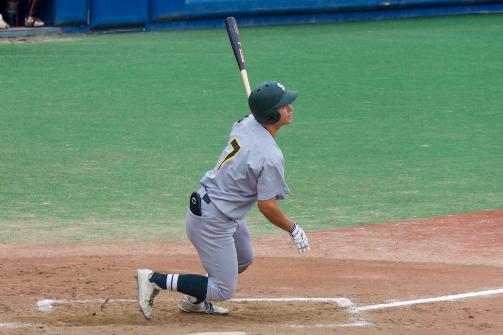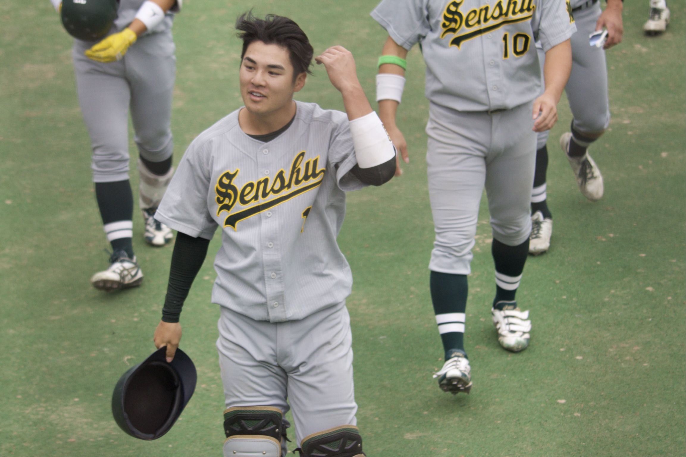 打線は1回に田村虎治郎(経営4・享栄高)、2回の宮﨑元哉(経営3・明豊高)にヒットが飛び出すも、8回まで相手投手陣を打ち崩すことができなかった。しかし、9回には途中守備から入った織茂秀喜(経営4・松商学園高)がセンター前にはじき返すと、続く谷頭太斗(経済3・日本航空石川高)がレフトへ二塁打を放ち、好機を作った。無死二、三塁の好機で回ってきた宮﨑は「かなり緊張していたけど、自分のスイングをするだけを考えていた」と外角低めの直球を流し、ライトへの犠飛で粘りを魅せた。1点を返したが、後続が続かずゲームセット。4年生のラストシーズンを7勝4敗で終えた。