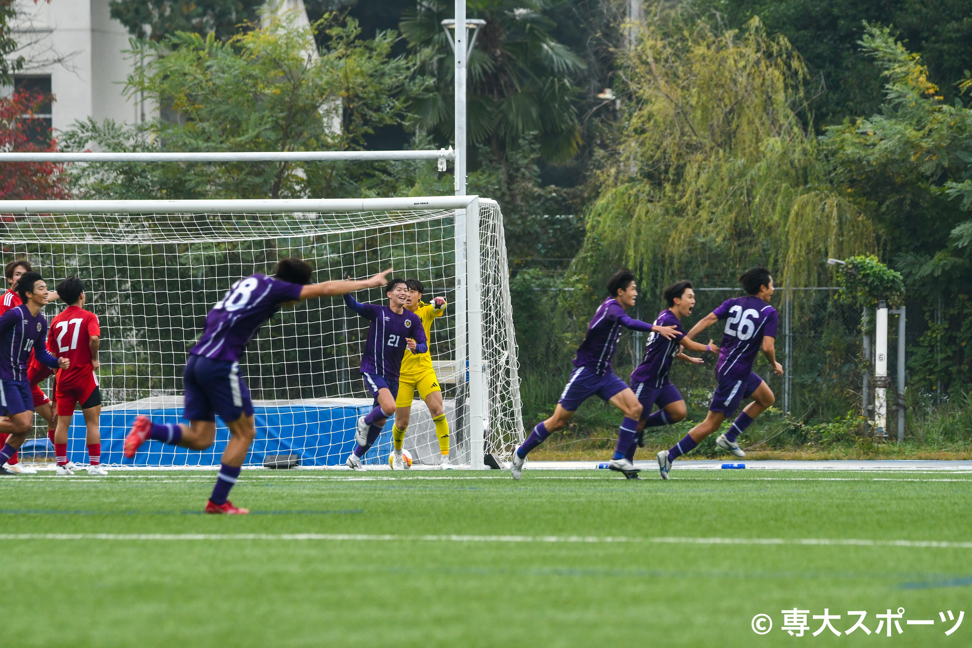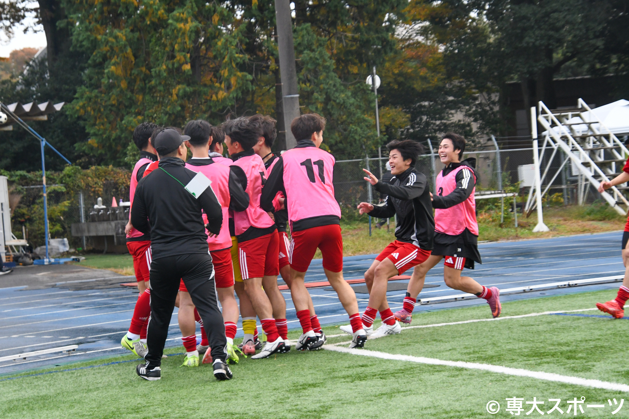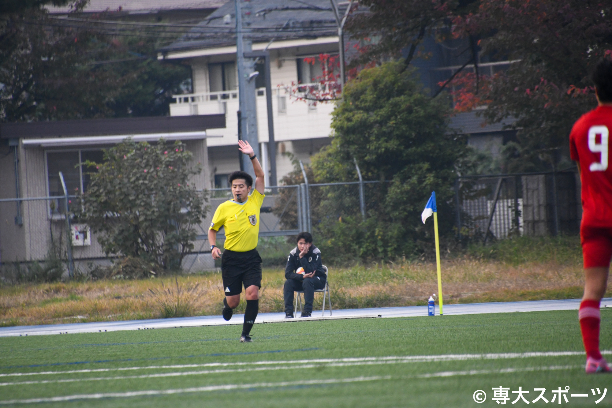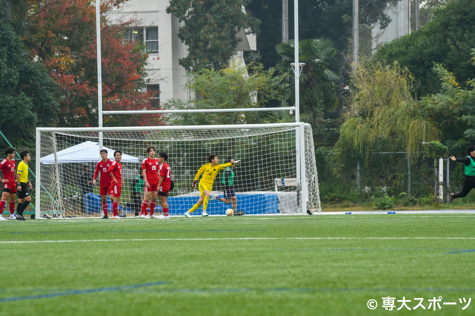 後半序盤には危ない場面を迎えたが、無失点で耐え凌ぐ。以降は選手交代が功を奏し、攻守で安定したプレーを見せる。攻撃に圧をかけていた矢先、後半50分には東学大にネットを揺らされ、万事休すかと思われた。だが、オフサイドポジションの選手がプレーに関与したことで得点は取り消しに。大ピンチを逃れた専大は、試合再開後のプレーから敵陣に攻め込み、最後は那須が劇的なゴールを決めた。