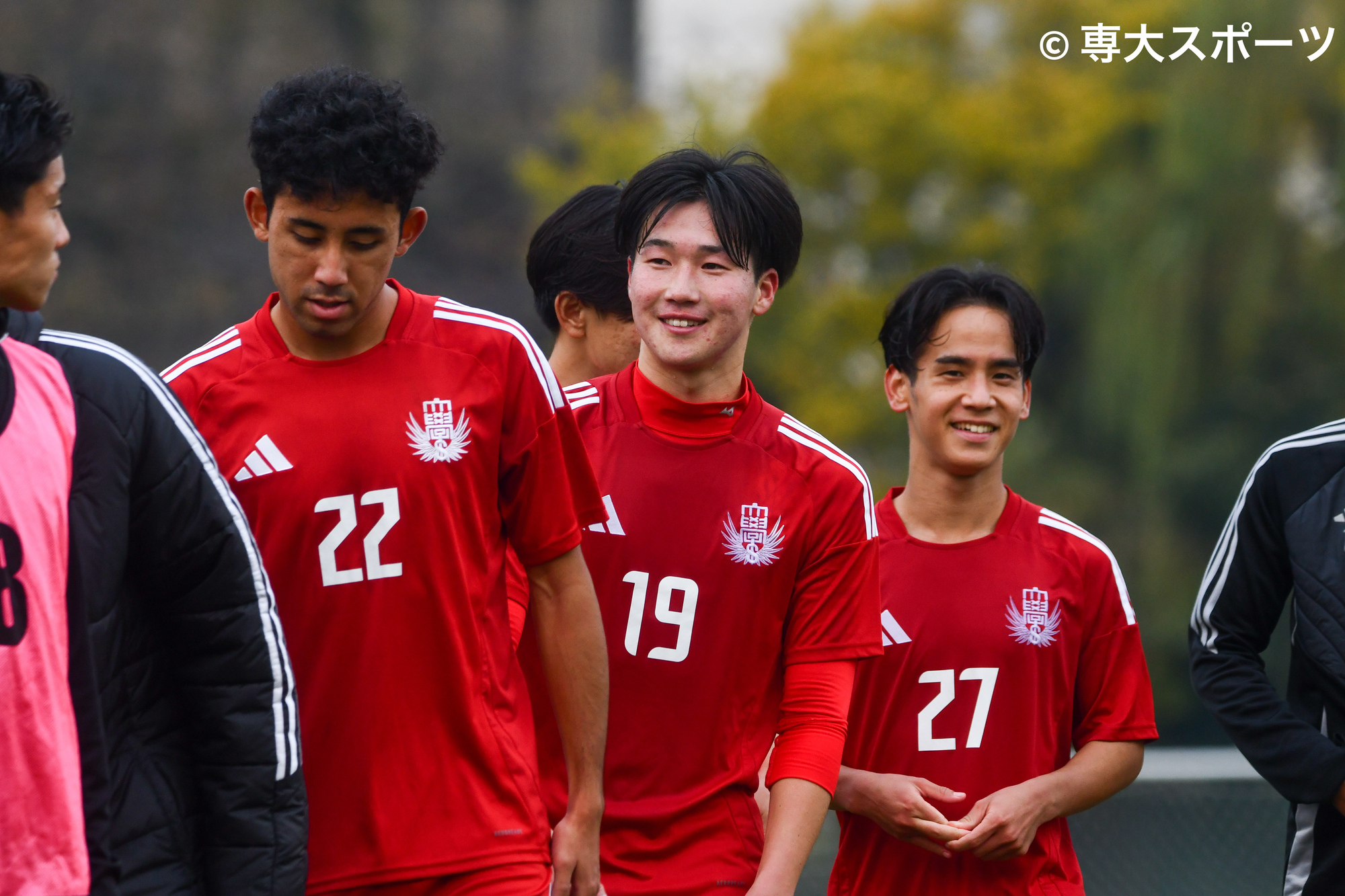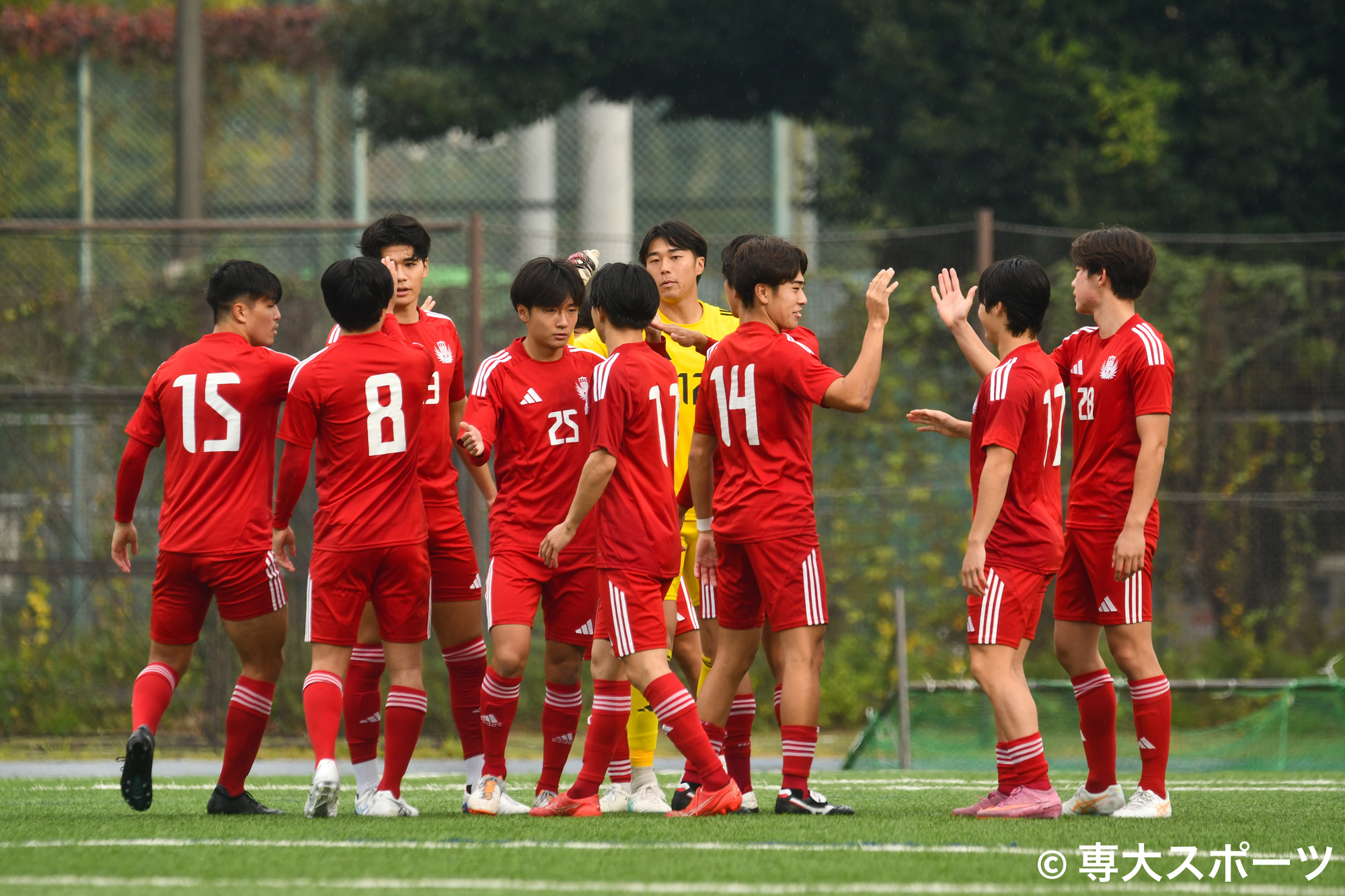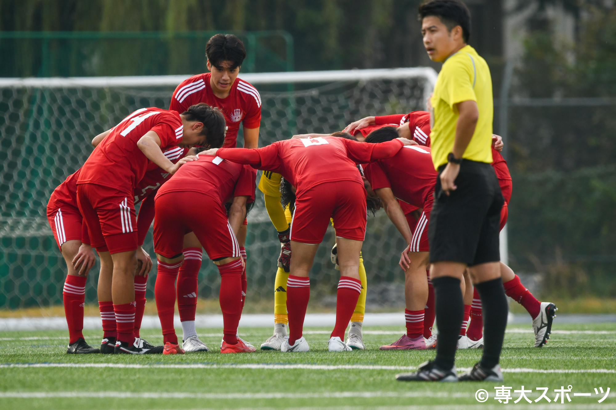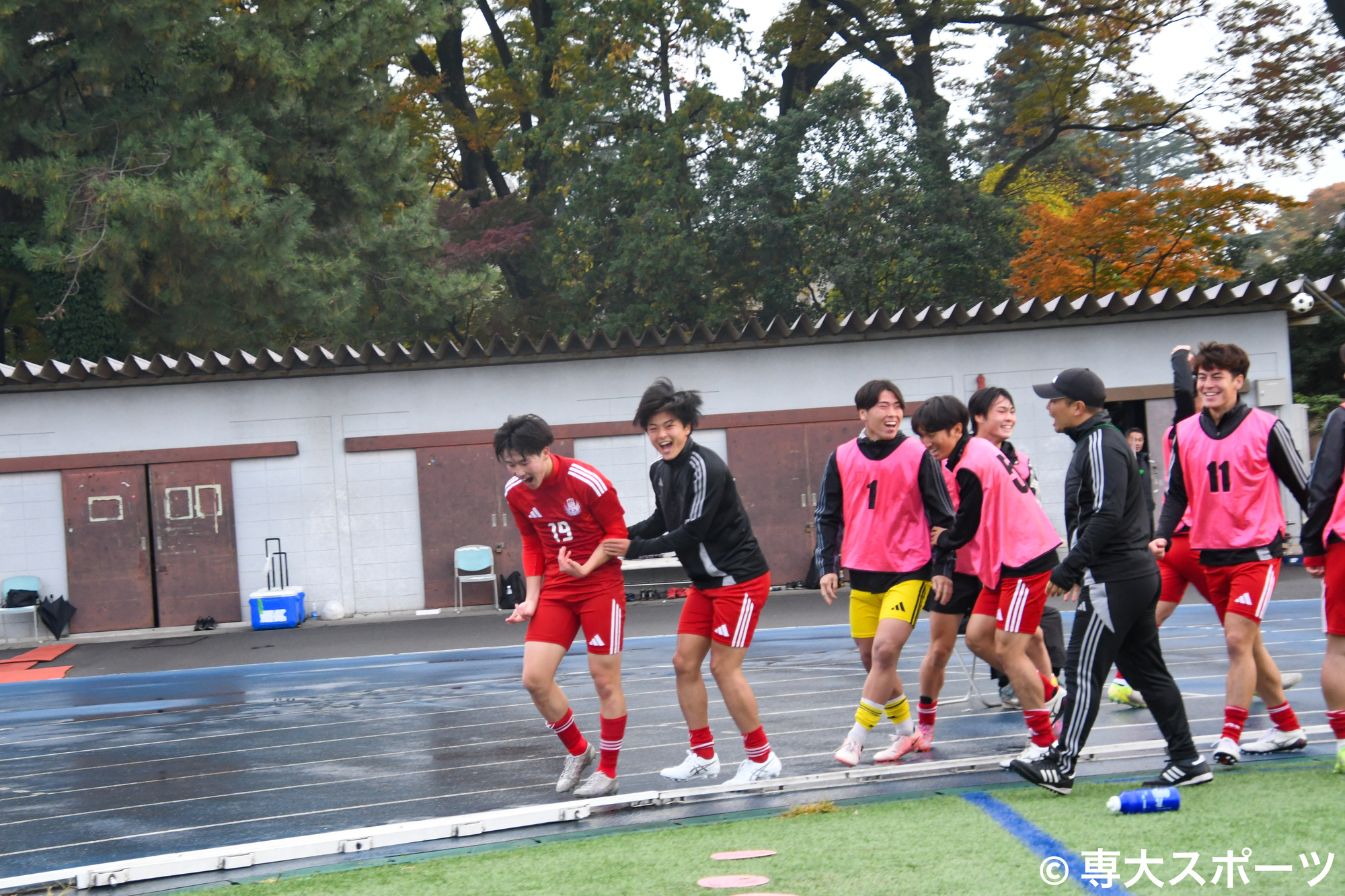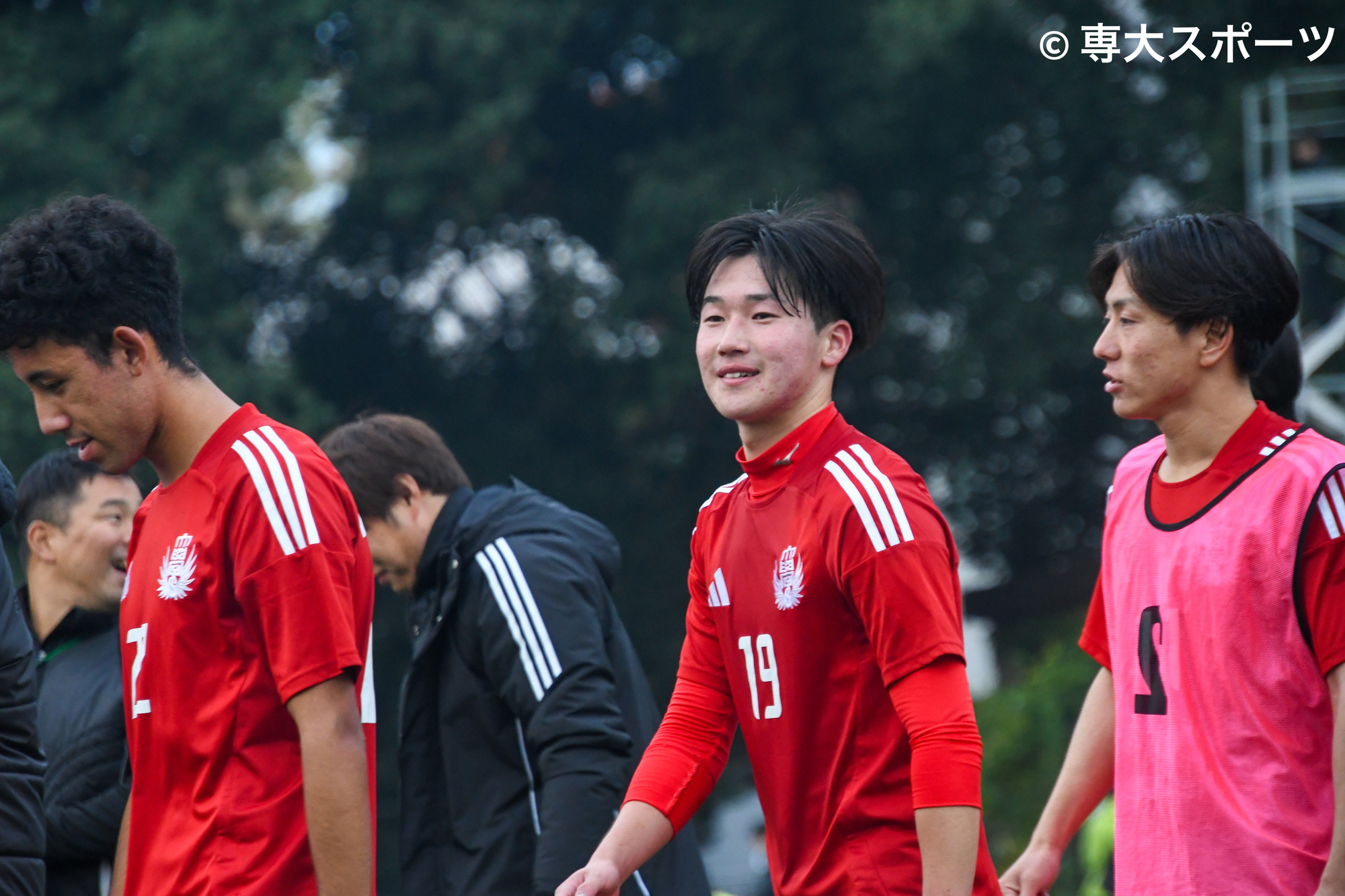 後半序盤には危ない場面を迎えたが、無失点で耐え凌ぐ。以降は選手交代が功を奏し、攻守で安定したプレーを見せる。攻撃に圧をかけていた矢先、後半50分には東学大にネットを揺らされ、万事休すかと思われた。だが、オフサイドポジションの選手がプレーに関与したことで得点は取り消しに。大ピンチを逃れた専大は、試合再開後のプレーから敵陣に攻め込み、最後は那須が劇的なゴールを決めた。
