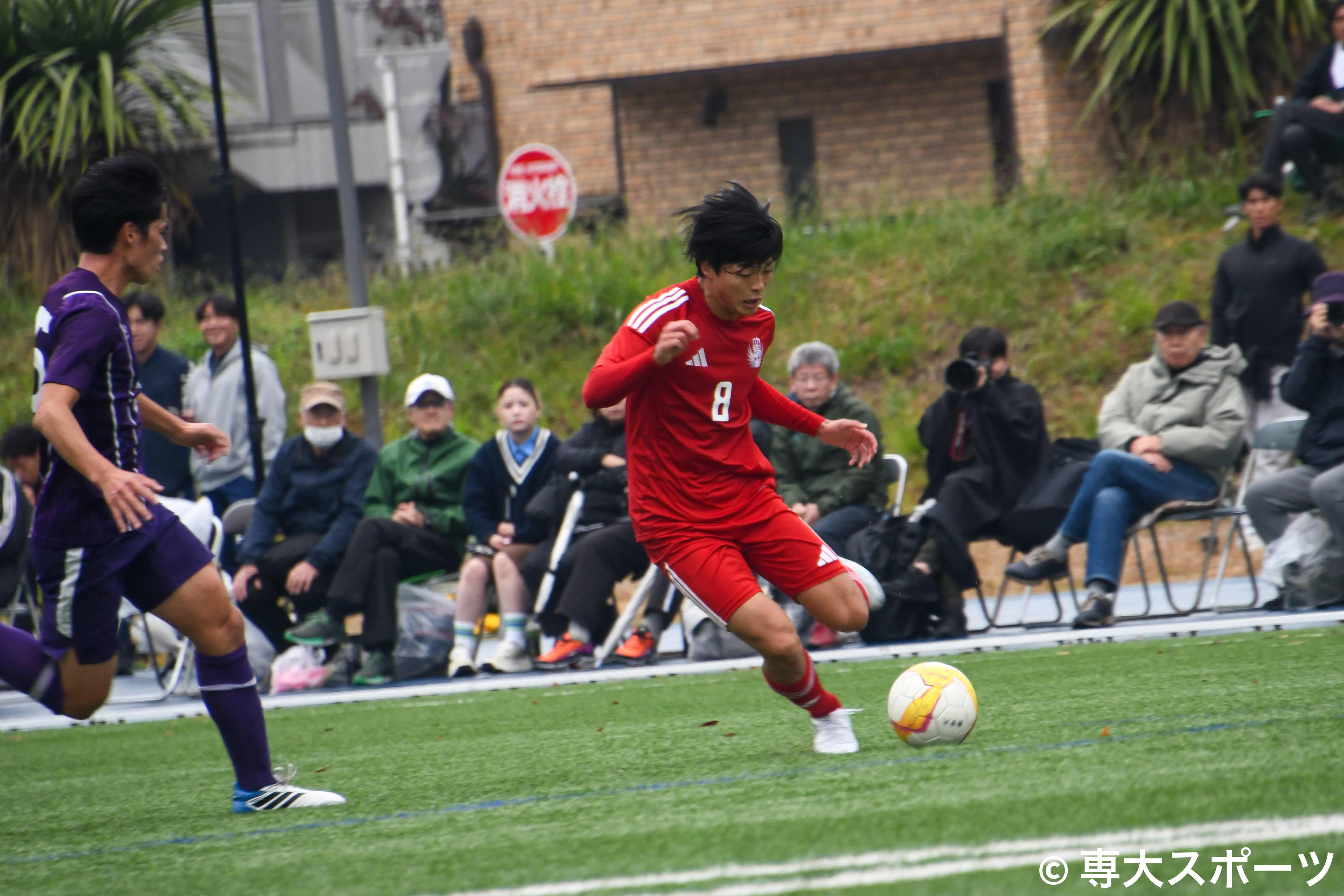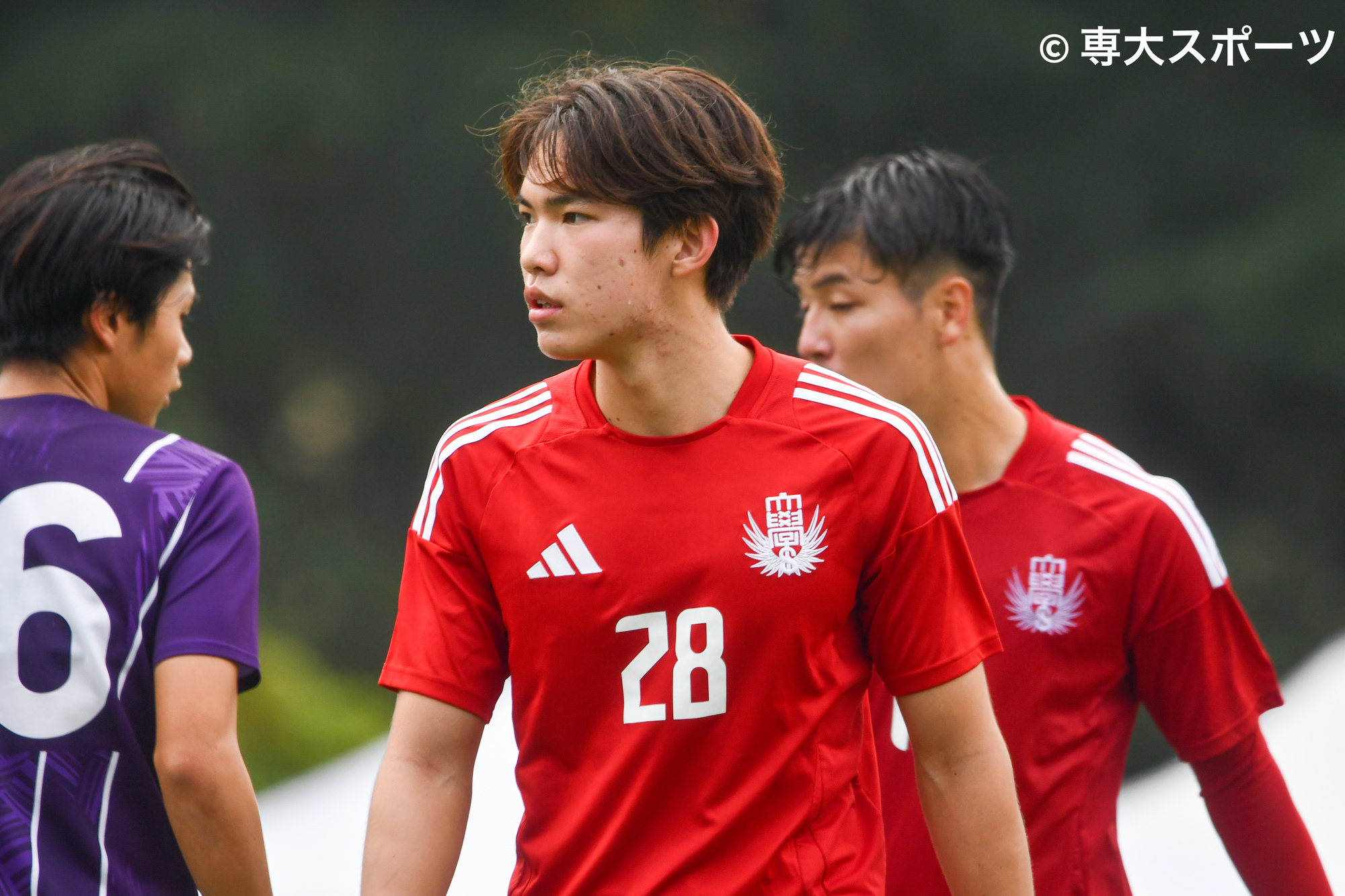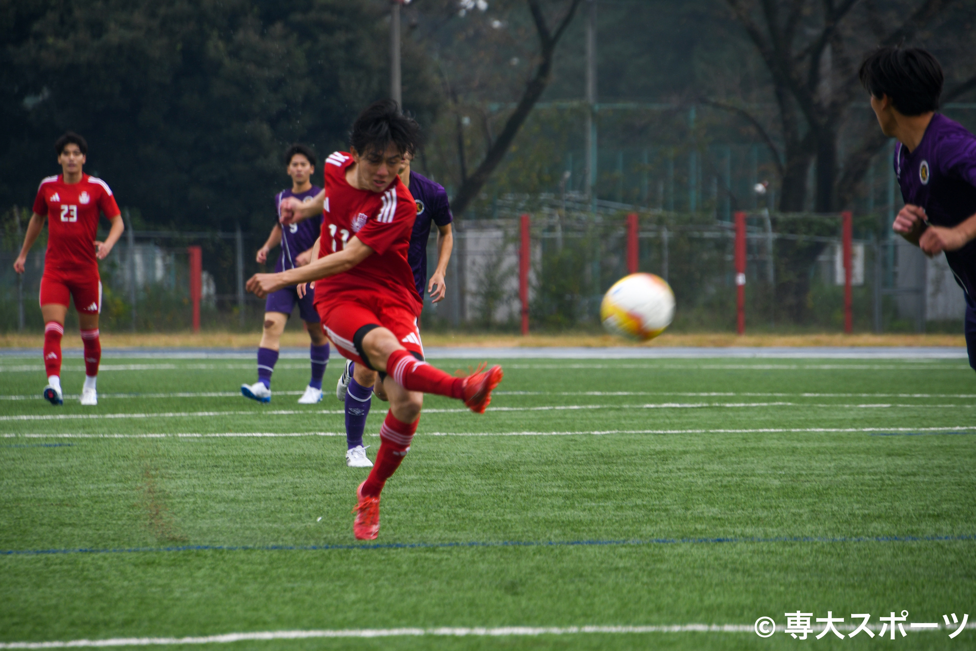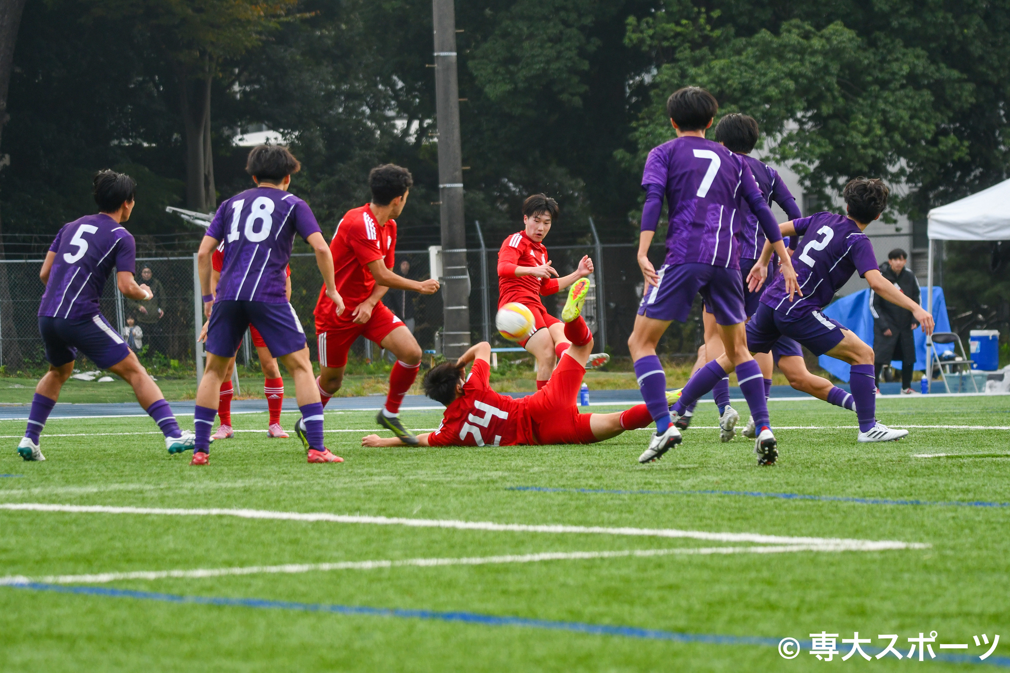 前半は両チームともに無得点で試合を折り返すと、専大が後半序盤から攻勢を強める。後半2分、相手の浮き球を鈴木が頭ではね返すと、こぼれ球を拾った松本は佐藤漣にスルーパスを送る。佐藤漣は3人に囲まれながらもドリブルを仕掛け、力強いシュートを打つが相手GKの好セーブに阻まれる。