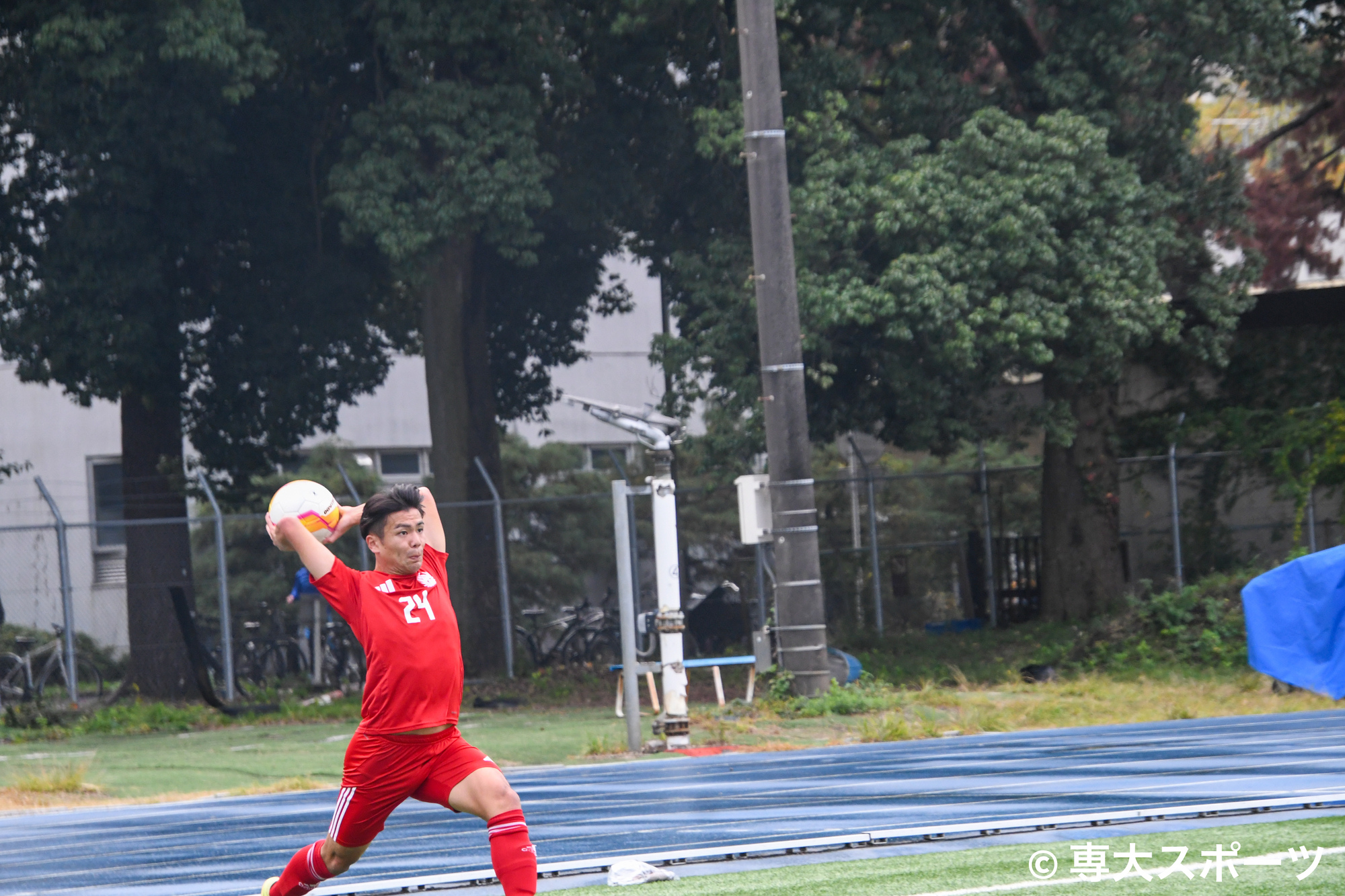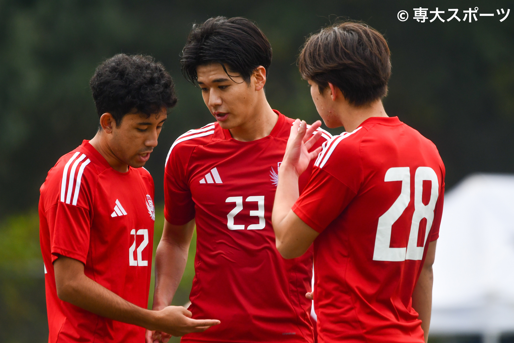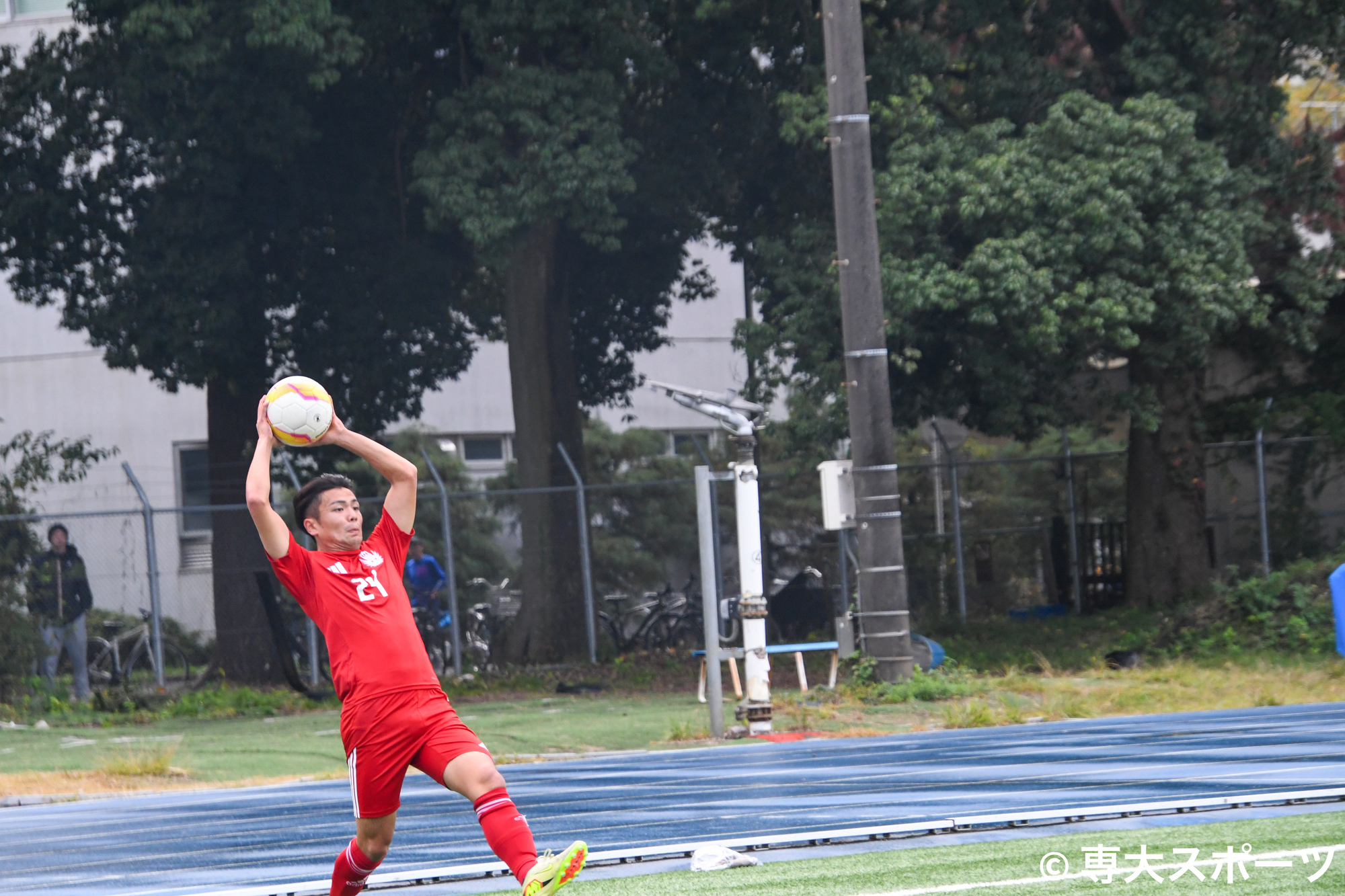 前半序盤から専大が試合を優位に進めていたものの、カウンターとセットプレーの流れから相手に押される場面が目立つ。前半8分には東学大がCKから低いライナー性のボールを供給すると、ゴール前でフリーになった相手がワンタッチで右足を振り抜く。しかし、橋本燦が身を挺してシュートを防ぎ、最初のピンチを凌ぐ。
