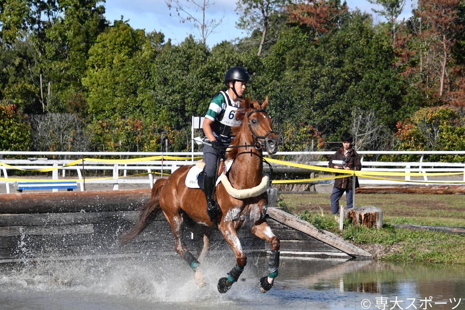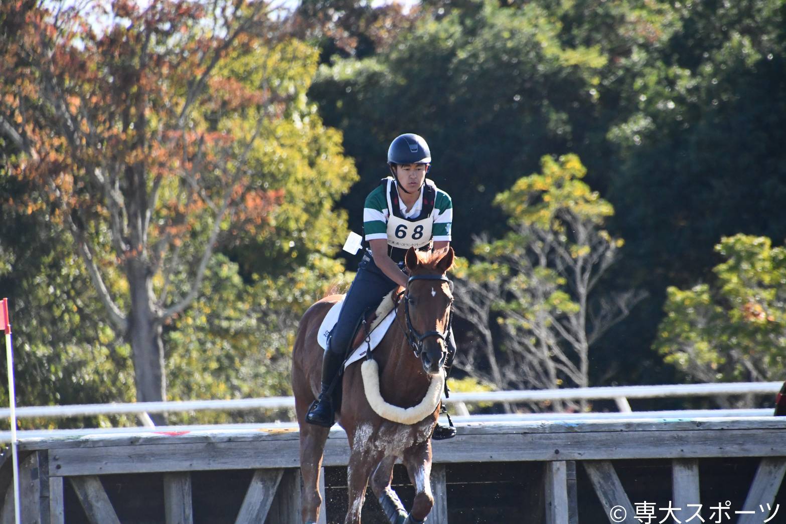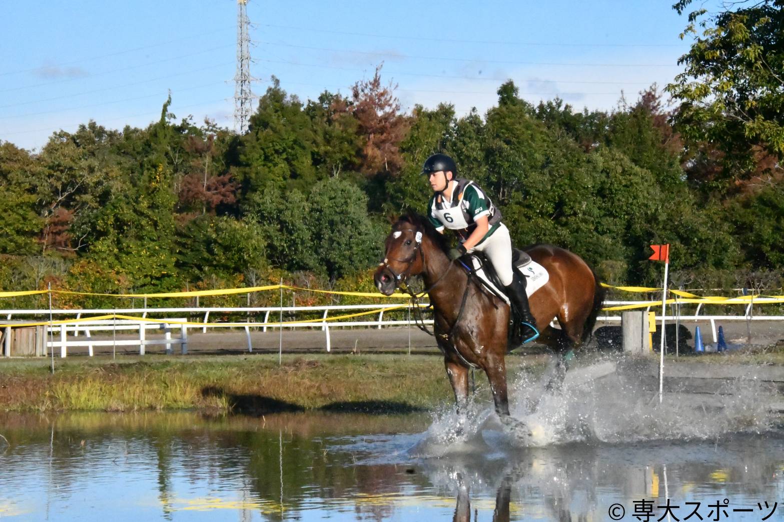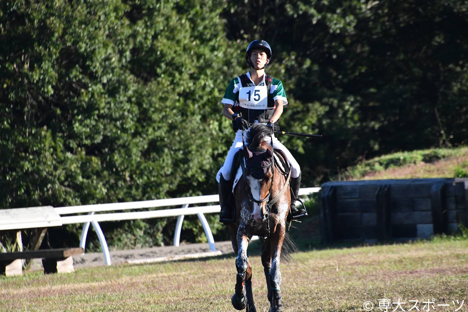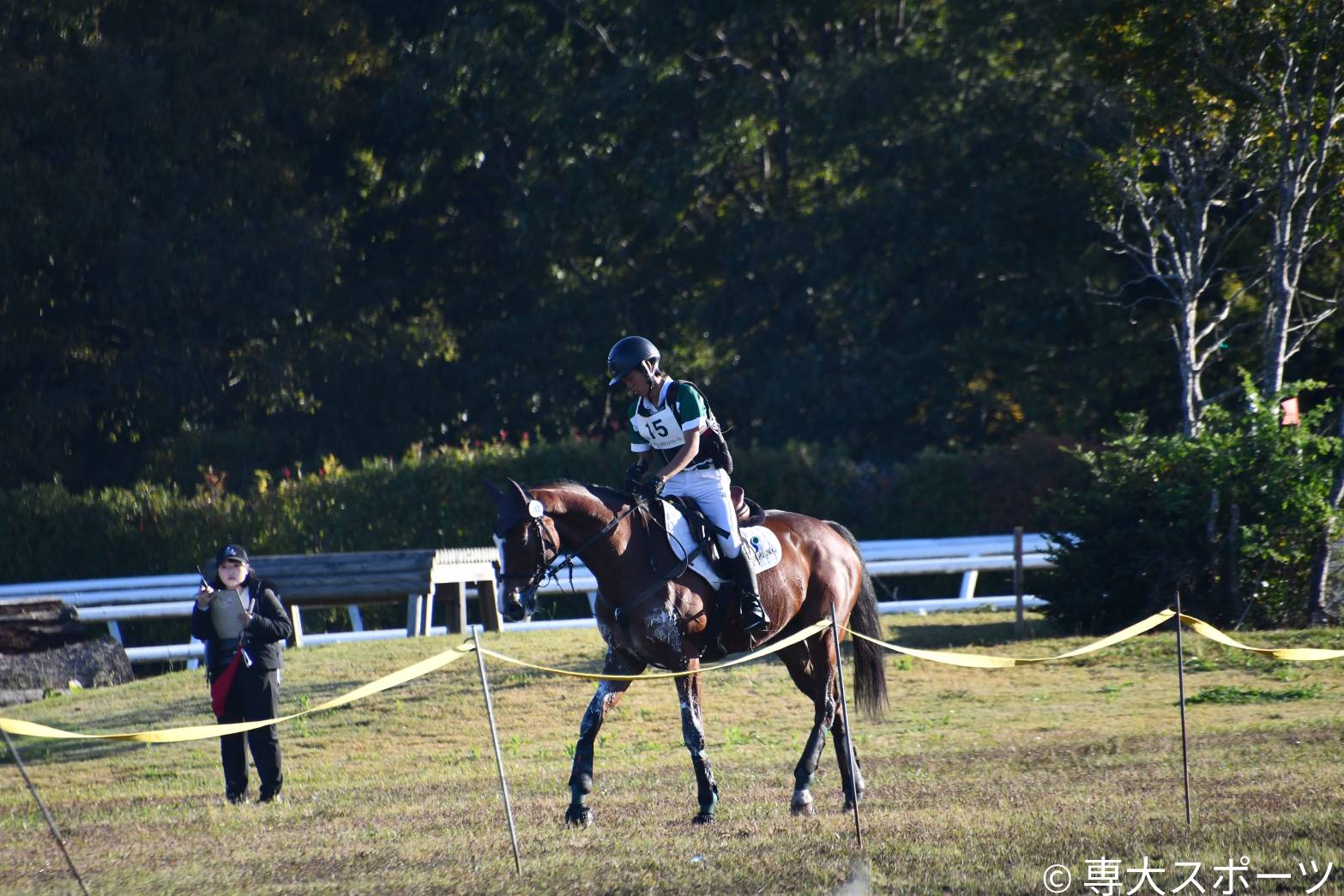 今大会最終日は、総合馬術競技(馬場馬術、クロスカントリー、障害飛越の3種目を同一人馬で行い、その減点合計を競う)のうちクロスカントリーと障害飛越の2競技が行われ、岡田将太郎(経済2・都立農芸高)・ホクソウアスセナ号が3位入賞を果たした。クロスカントリーをミスなく終えると、続く障害飛越でも減点無しの走りを見せて順位を上げた。