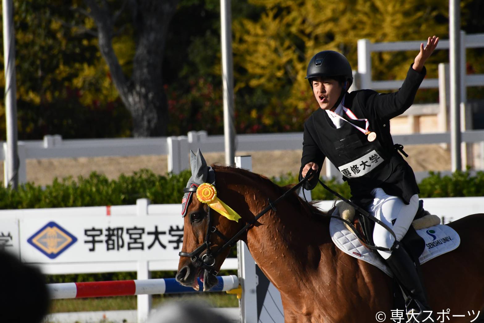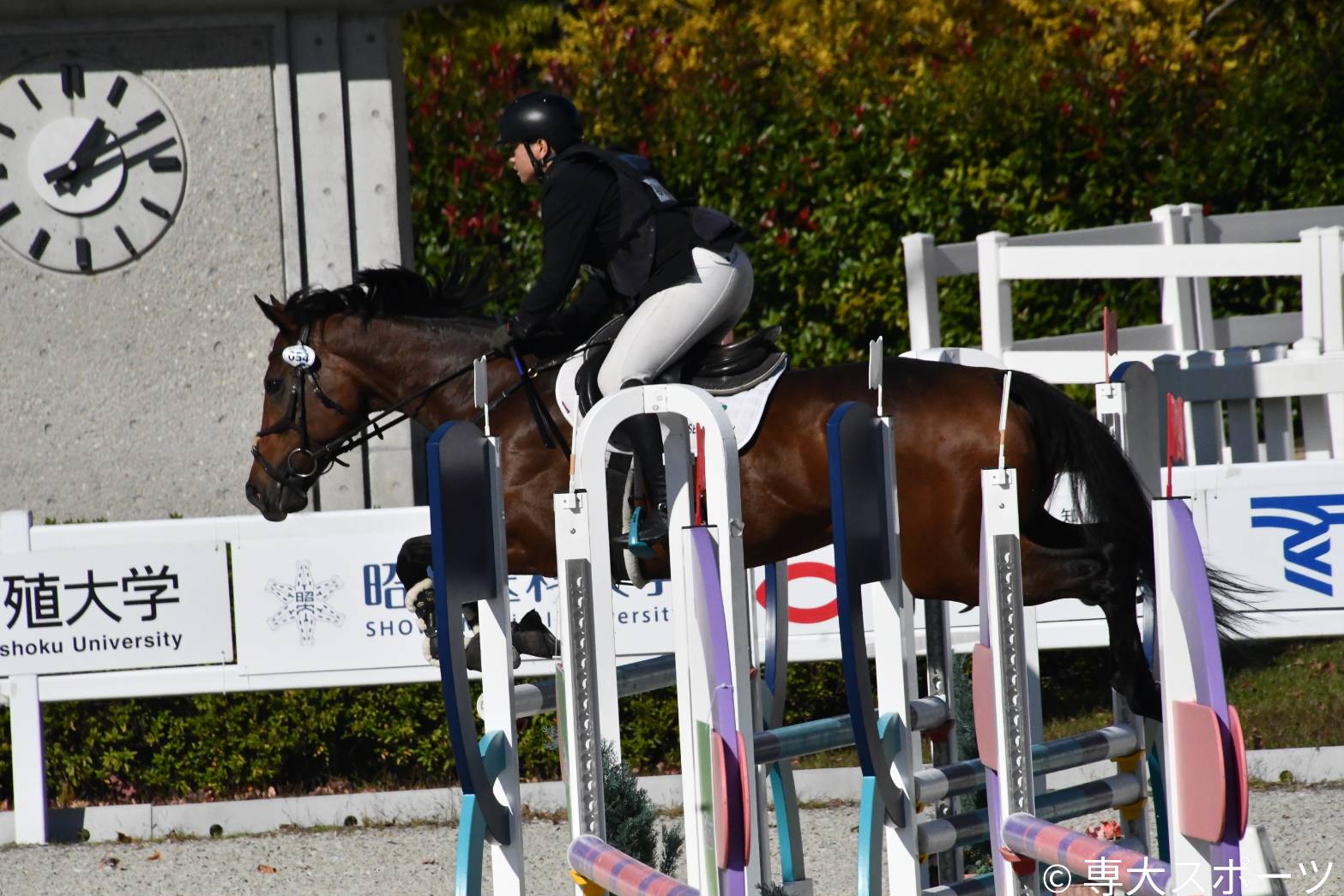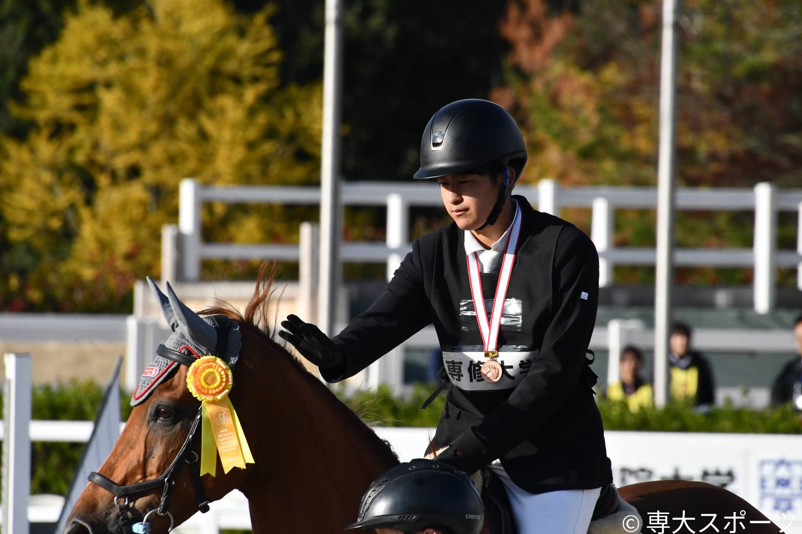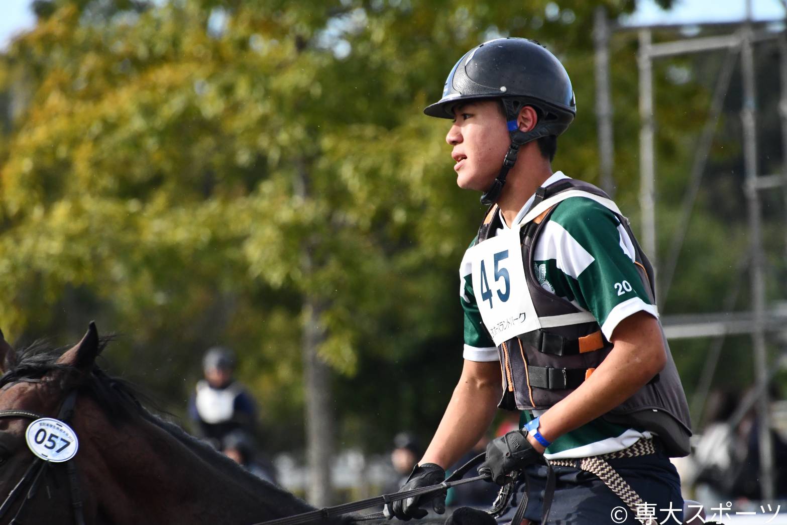 今大会最終日は、総合馬術競技(馬場馬術、クロスカントリー、障害飛越の3種目を同一人馬で行い、その減点合計を競う)のうちクロスカントリーと障害飛越の2競技が行われ、岡田将太郎(経済2・都立農芸高)・ホクソウアスセナ号が3位入賞を果たした。クロスカントリーをミスなく終えると、続く障害飛越でも減点無しの走りを見せて順位を上げた。