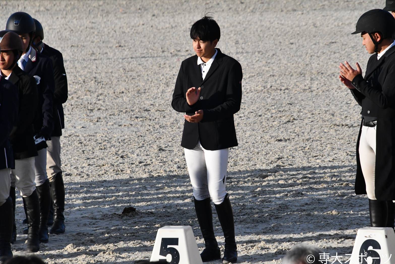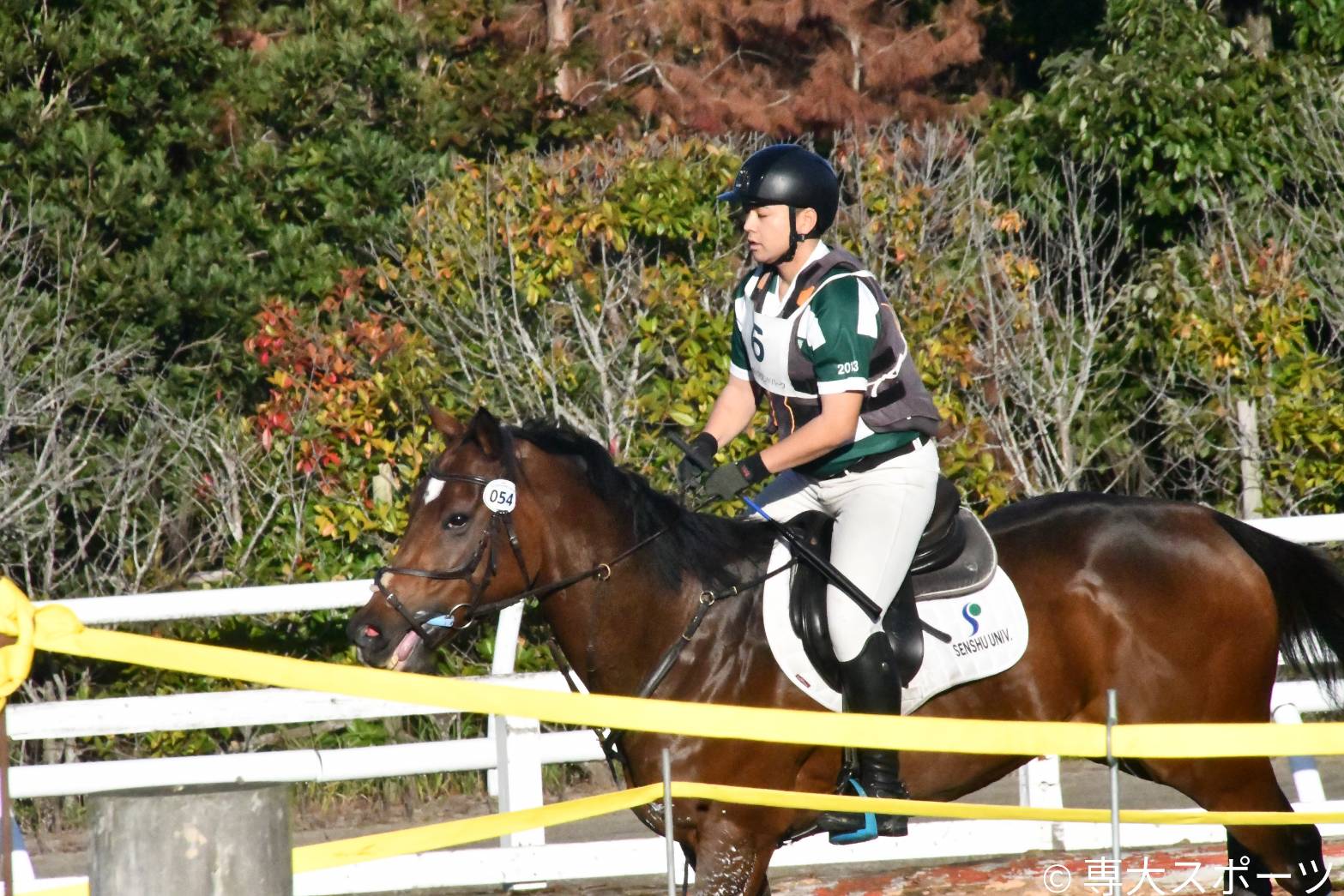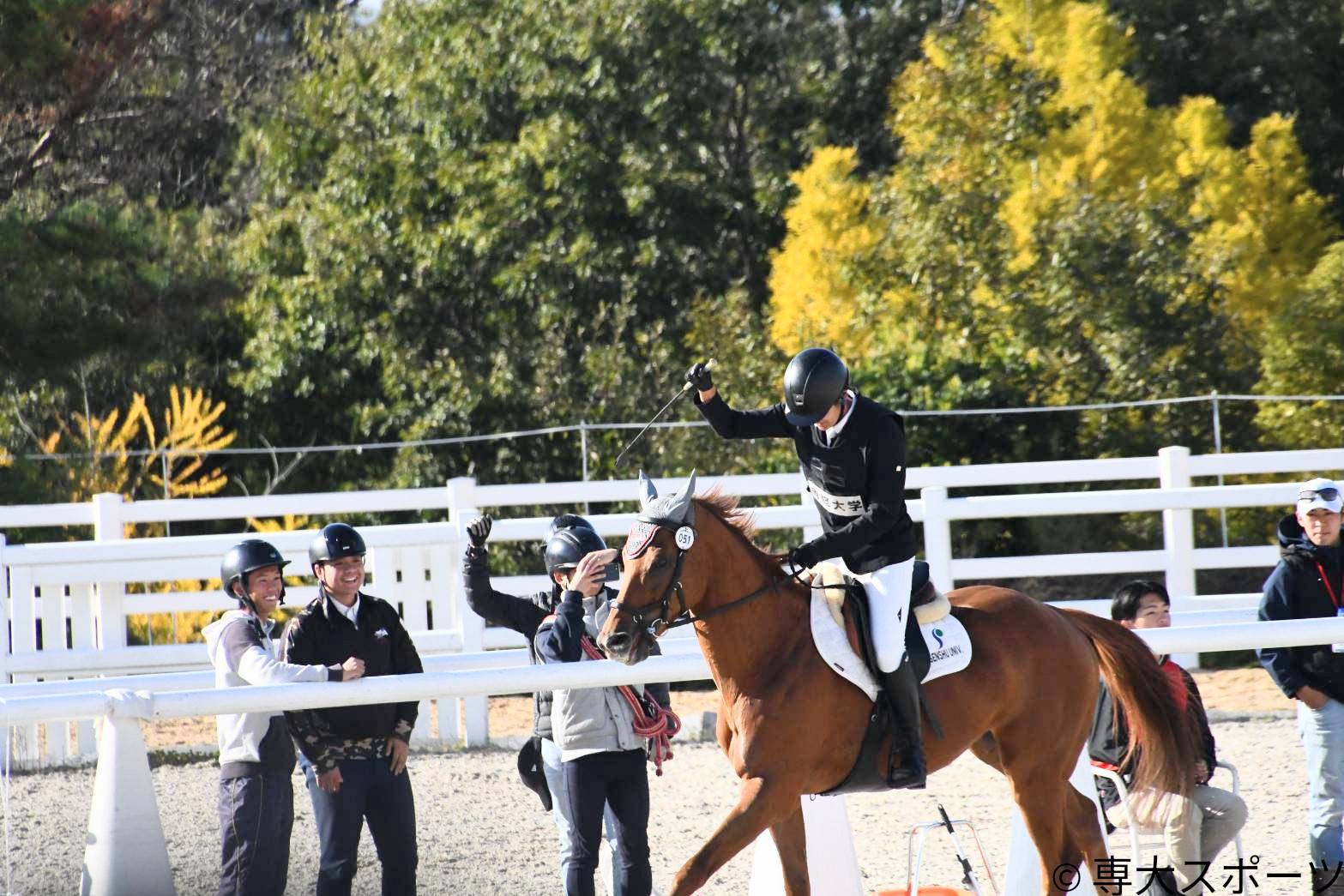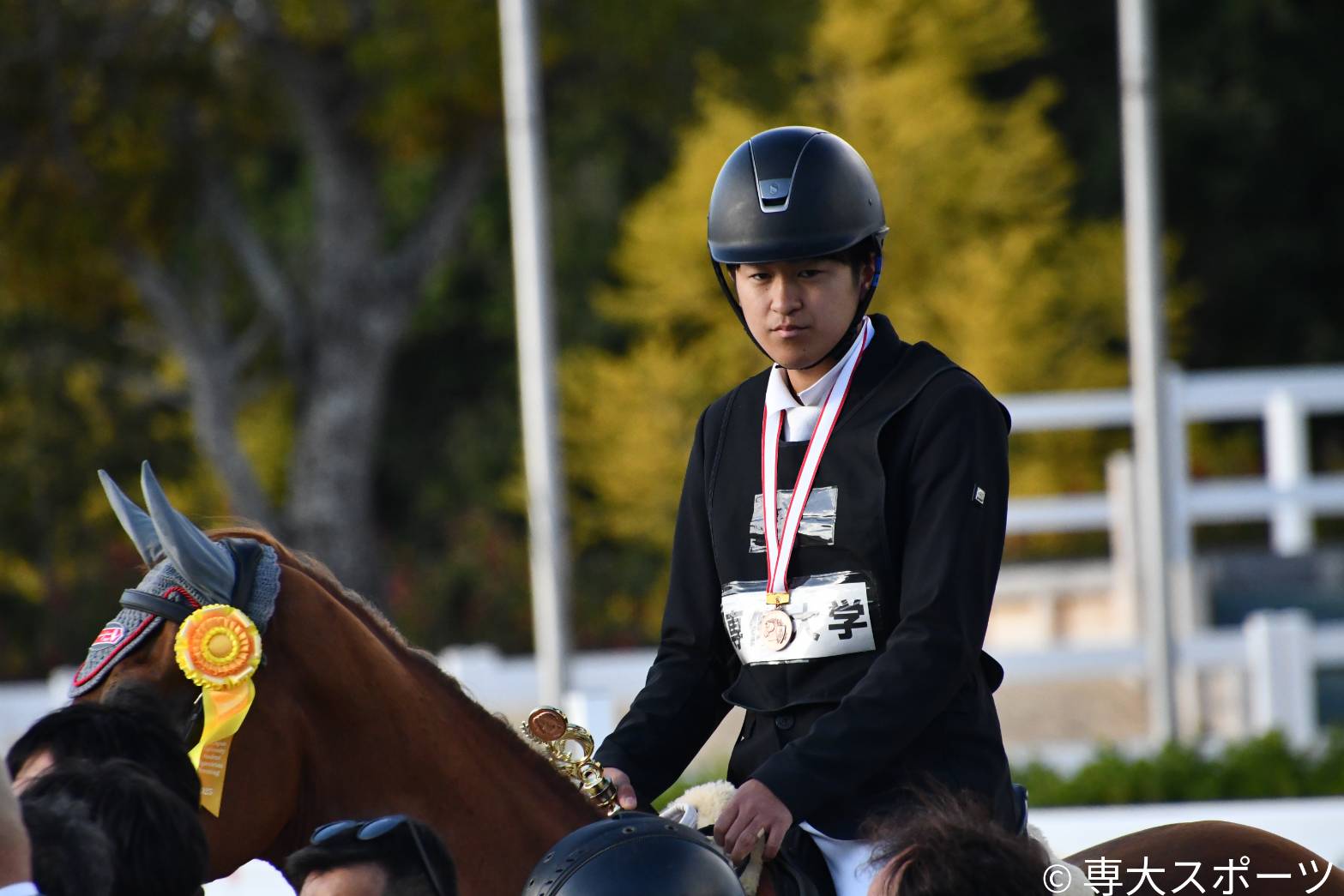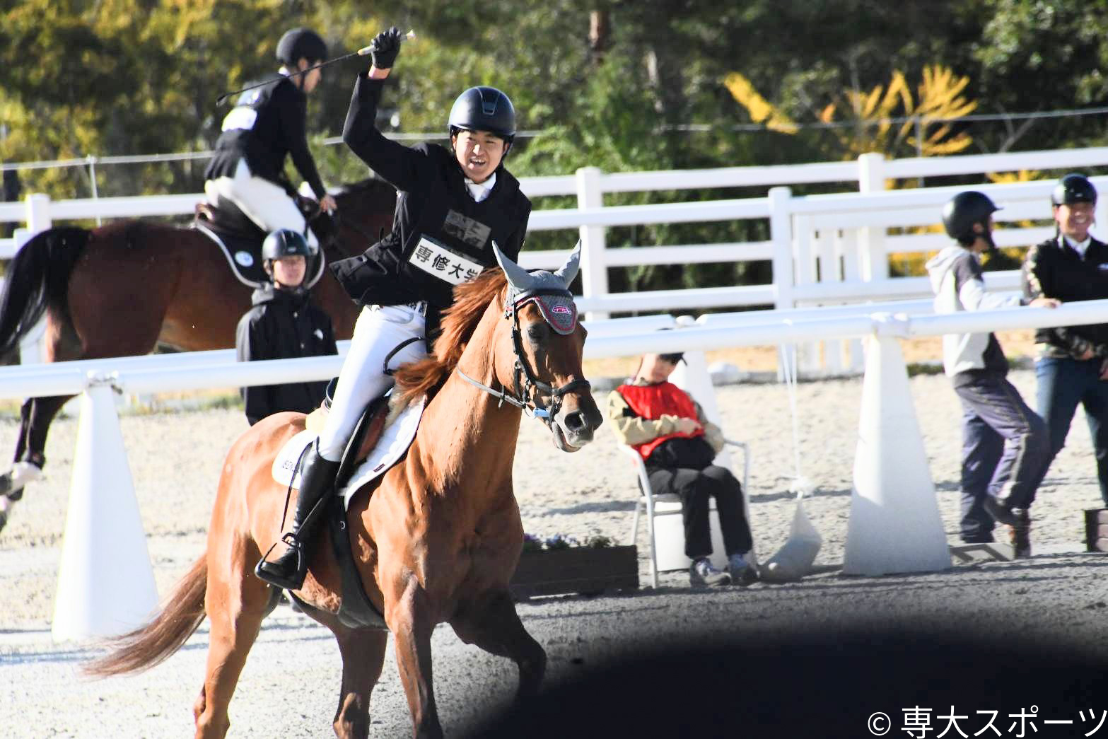 今大会最終日は、総合馬術競技(馬場馬術、クロスカントリー、障害飛越の3種目を同一人馬で行い、その減点合計を競う)のうちクロスカントリーと障害飛越の2競技が行われ、岡田将太郎(経済2・都立農芸高)・ホクソウアスセナ号が3位入賞を果たした。クロスカントリーをミスなく終えると、続く障害飛越でも減点無しの走りを見せて順位を上げた。