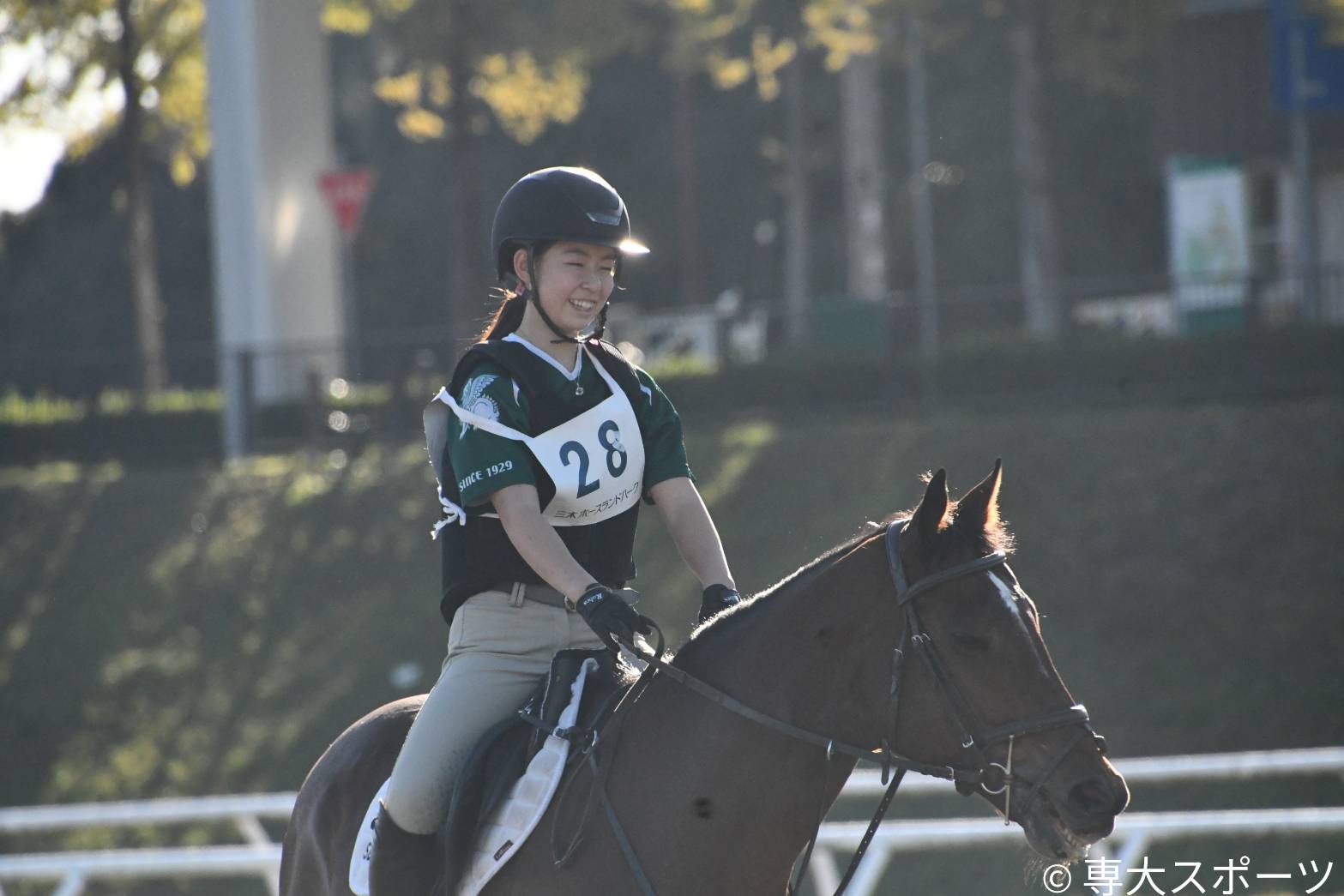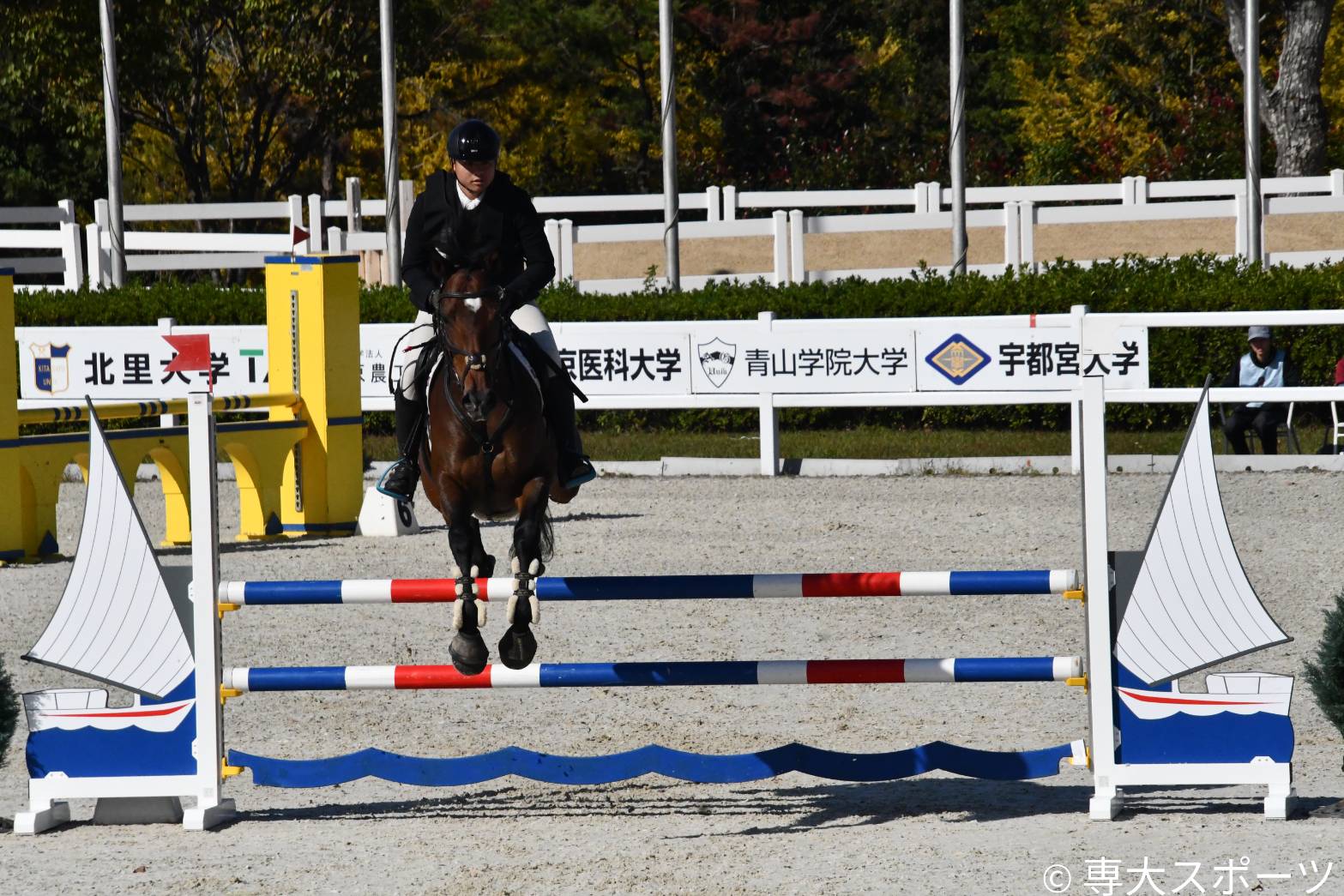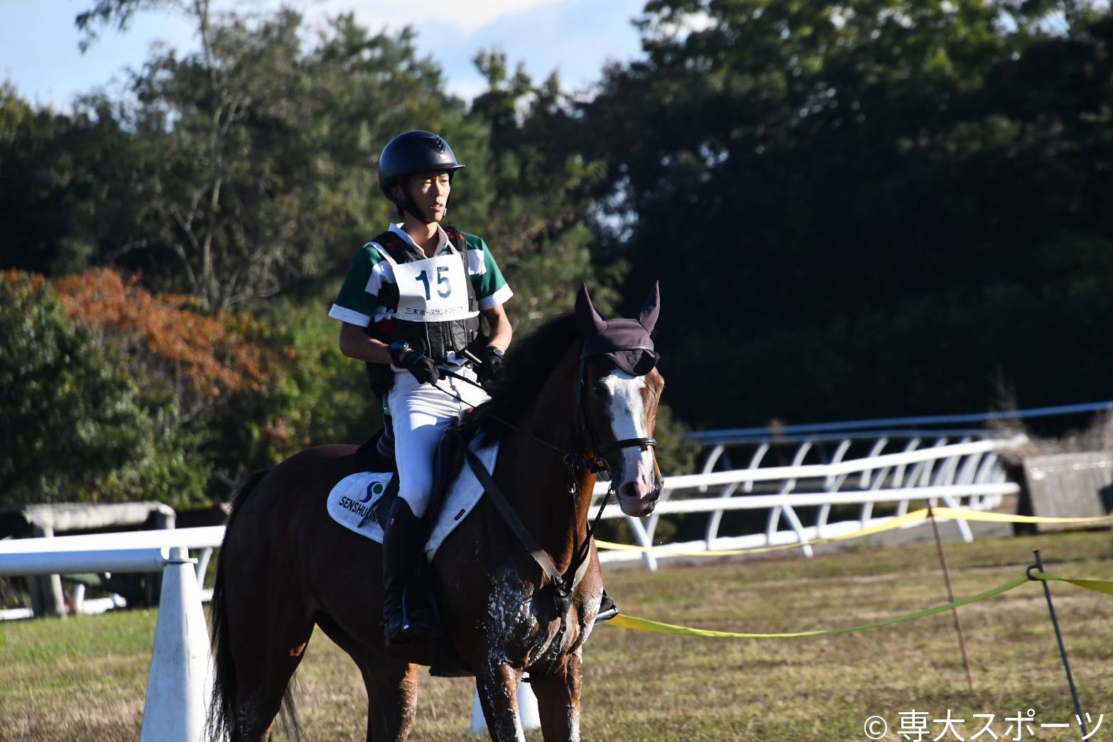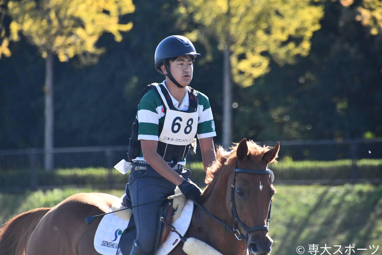 今大会最終日は、総合馬術競技(馬場馬術、クロスカントリー、障害飛越の3種目を同一人馬で行い、その減点合計を競う)のうちクロスカントリーと障害飛越の2競技が行われ、岡田将太郎(経済2・都立農芸高)・ホクソウアスセナ号が3位入賞を果たした。クロスカントリーをミスなく終えると、続く障害飛越でも減点無しの走りを見せて順位を上げた。
