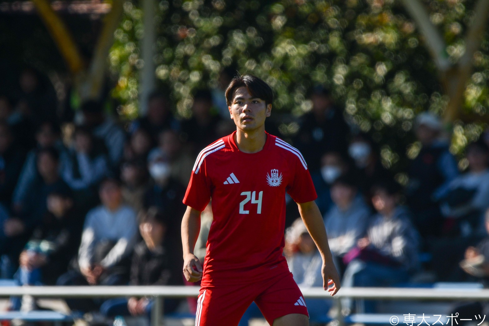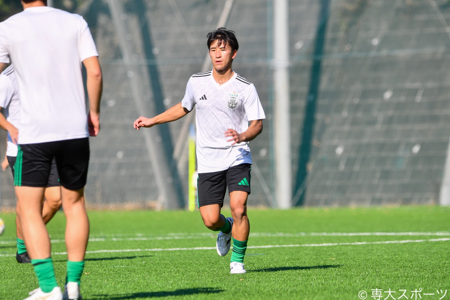 「私は、入学当初に腰椎分離症を経験したり、足首の怪我や膝の怪我などに苦しめられ、多くの時間を棒に振ってきてしまいました。その中で、サッカーができることやその環境により感謝の気持ちを持って向き合うことができたと思ってます。サッカーの技術はもちろんですが、人間性の部分や社会人としての心構えなど多くのことを学べました。大学サッカーは良い意味でも、悪い意味でも、自由度が高く、才能があってもやらない者、遊びに夢中になる者、サボる者、多くの人がいる中で、私自身、流されることなく直向きに努力することができたと思っています。それは、応援してくれる家族や親戚、友達の存在があったからです。多くの人に支えられ、多くの経験をさせてくれたこの4年間に感謝したいです」