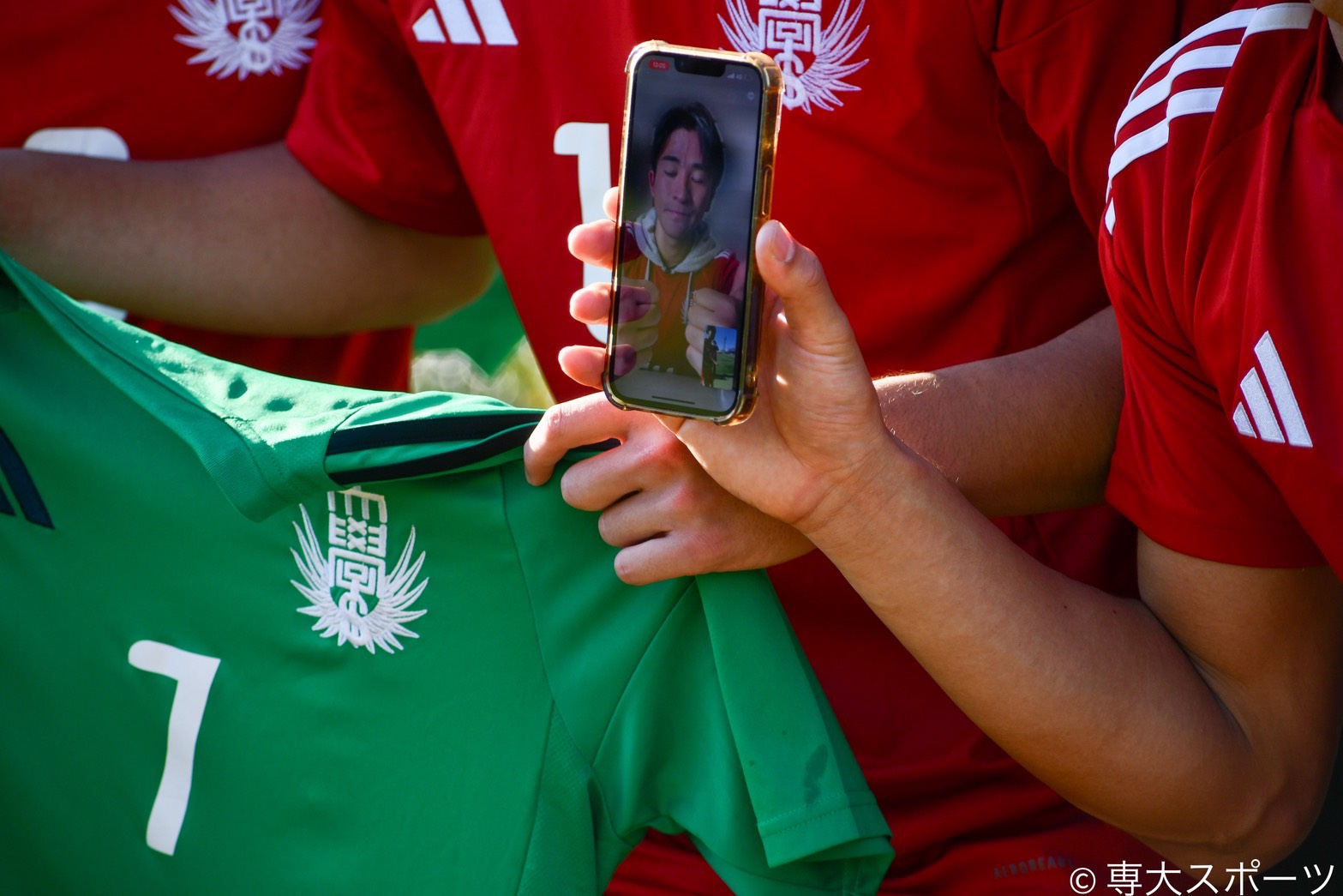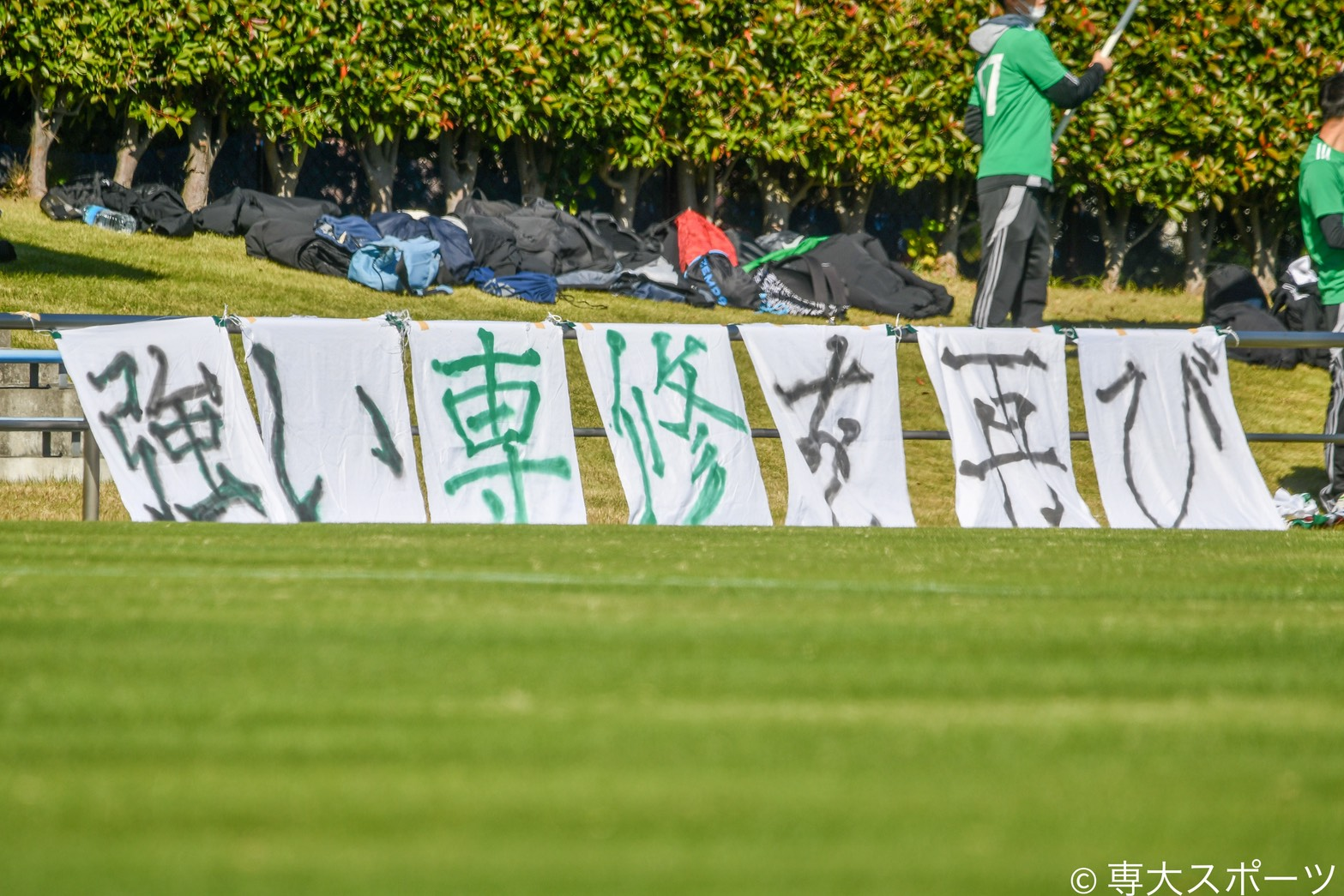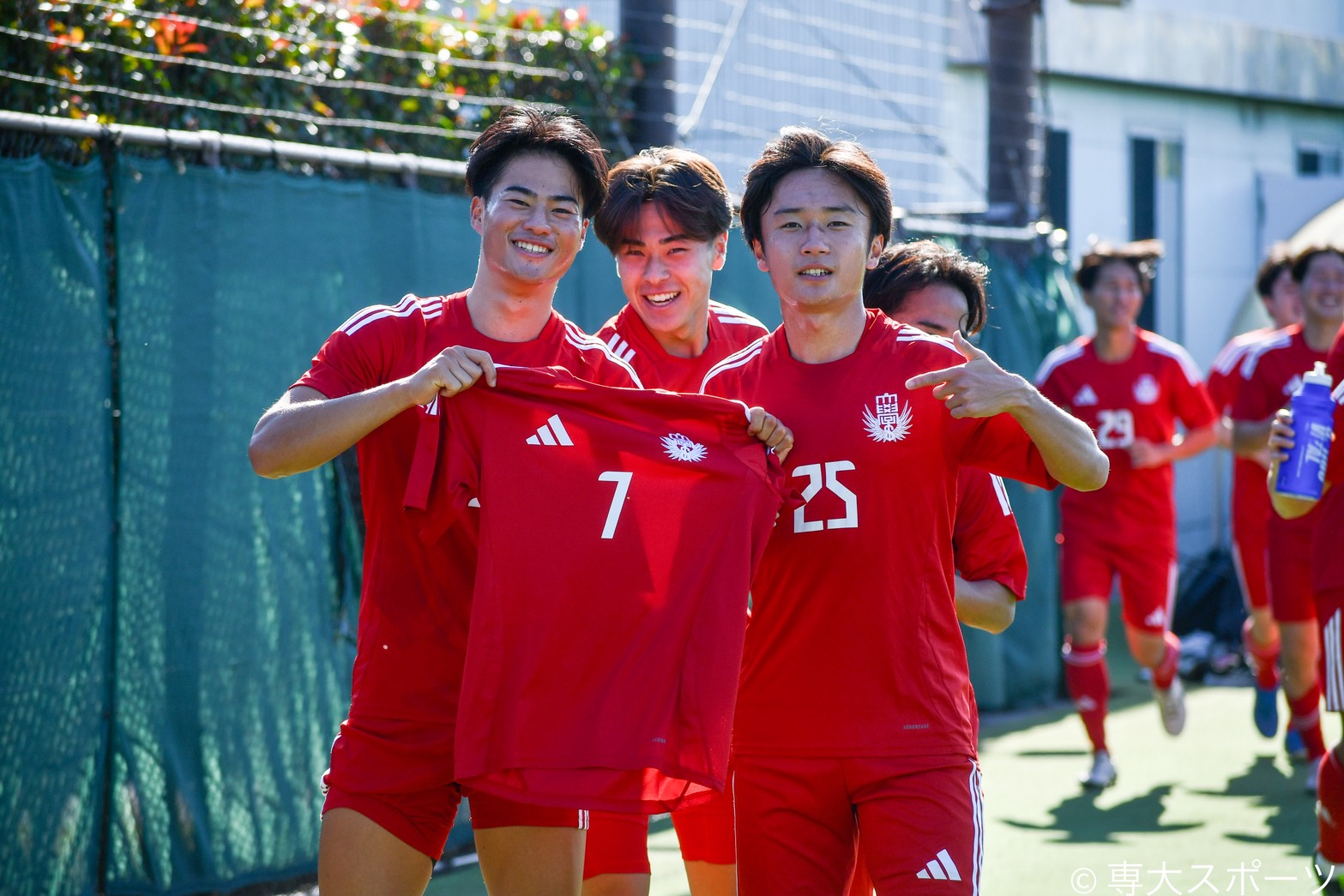 「私が入学してからずっと入替戦で負け続けてきて、専大どうしたのとか、昔は強かったのにと言われることが多く、悔しい思いをたくさんしてきました。しかし、今シーズンの目標であった、3部優勝は叶いませんでしたが、5年ぶりに2部昇格をすることができて、本当に嬉しく思います。私は最後、ピッチに立つことも会場にいることもできませんでしたが、ピッチに立って戦う者、その選手を後押しする者、サポートする者、全ての人の力が1つになった結果であり、本当に感謝の気持ちでいっぱいです」