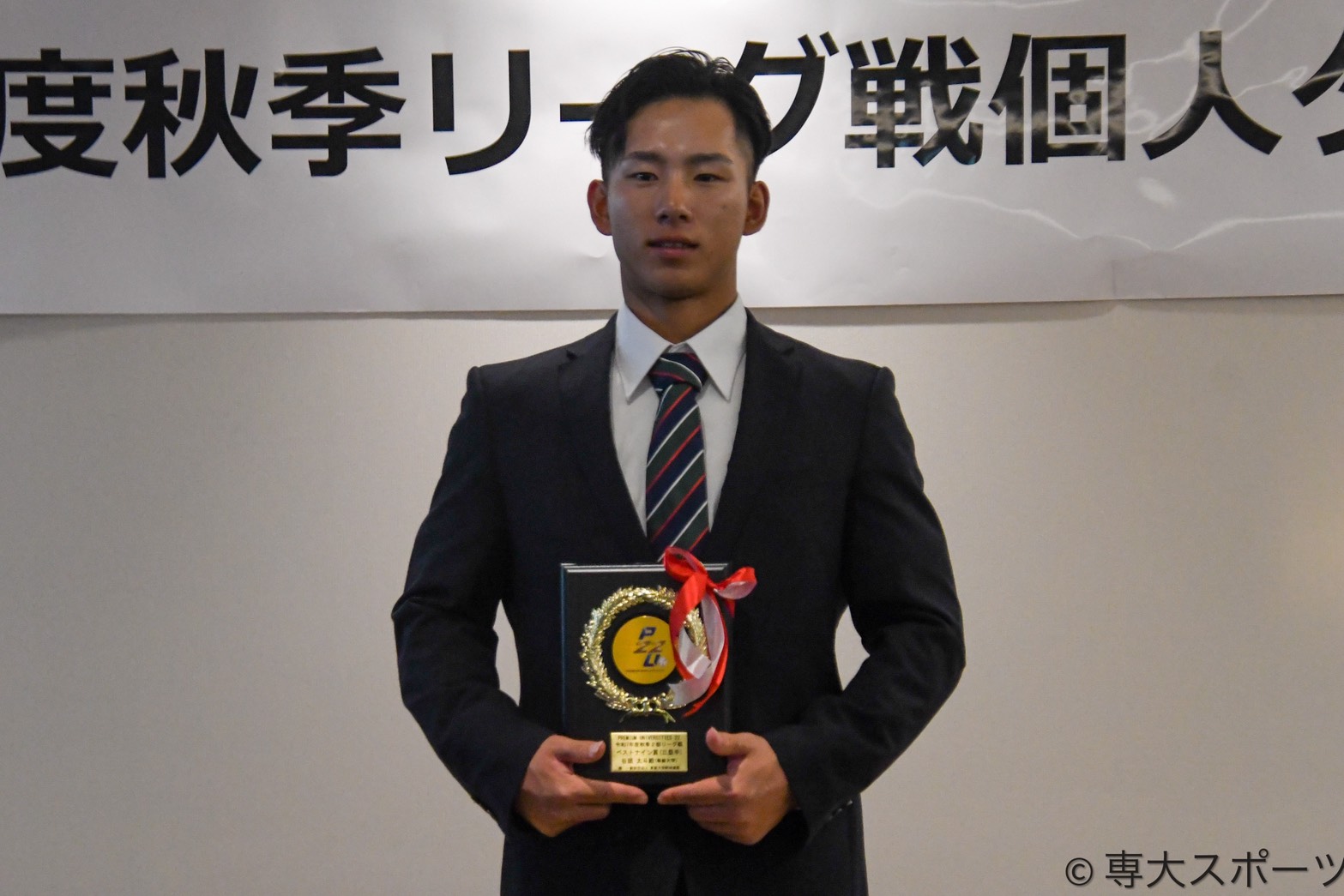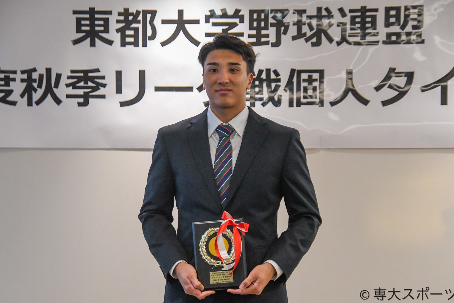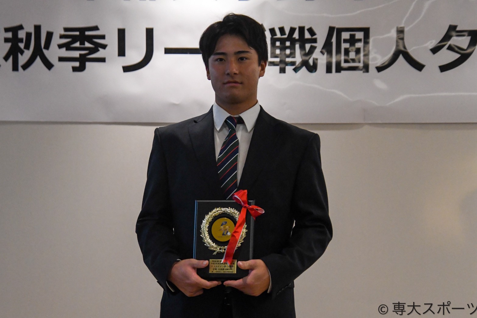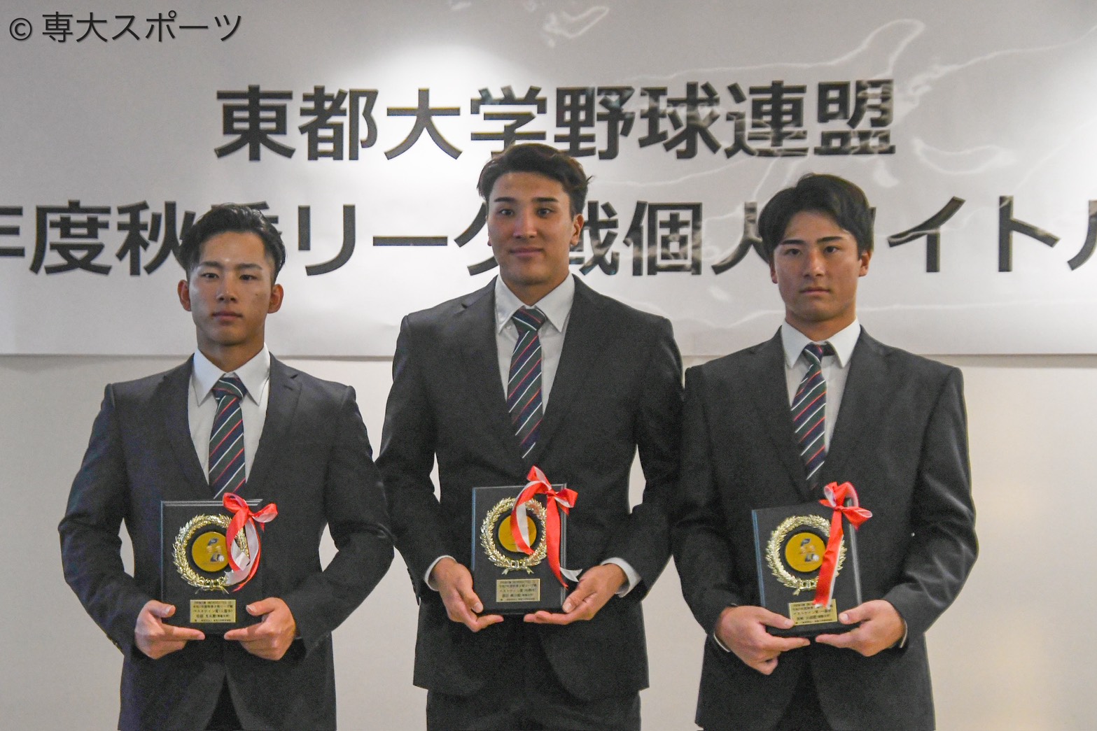 一部から四部まで、東都大学野球秋季リーグで個人タイトルを獲得した選手たちが集結した。ベストナインでは専大から一塁手部門に宮﨑元哉(経営3・明豊高)(6票)、※1三塁手部門で谷頭太斗(経済3・日本航空石川高)(8票)、外野手部門で渡辺維介(文2・松本国際高)(8票)が初受賞を果たした。また、※2指名打者部門では松永知大(経済4・創成館高)(11票)が2度目の受賞となった。