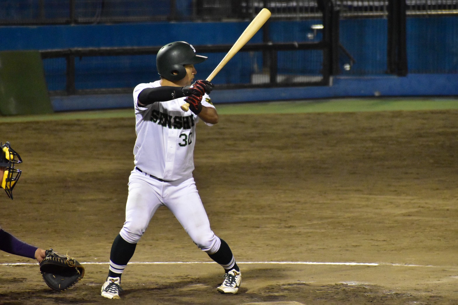 打線は3回に山本和輝(経済3・静岡高)が四球で出塁すると、続く藤原一輝(経済1・龍谷大平安高)が相手の失策で出塁し好機を作る。その後、1番・山田太成(経済2・大阪桐蔭高)のスクイズで1点を返した。4回にも山本が相手の失策で2点を追加し、逆転に成功。