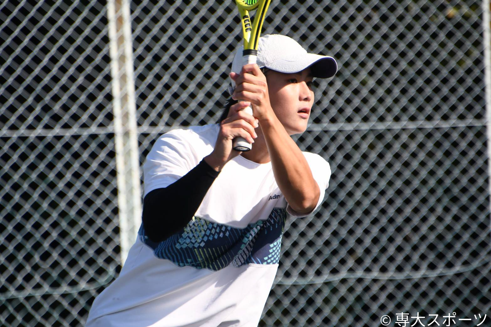リーグ戦を2連勝で迎えた専大はグループリーグ突破を懸けて同じく2連勝の東京国際大学と対戦した。大会当日、アクシデントも重なりシングルス3本で団体戦勝利を目指すことに。