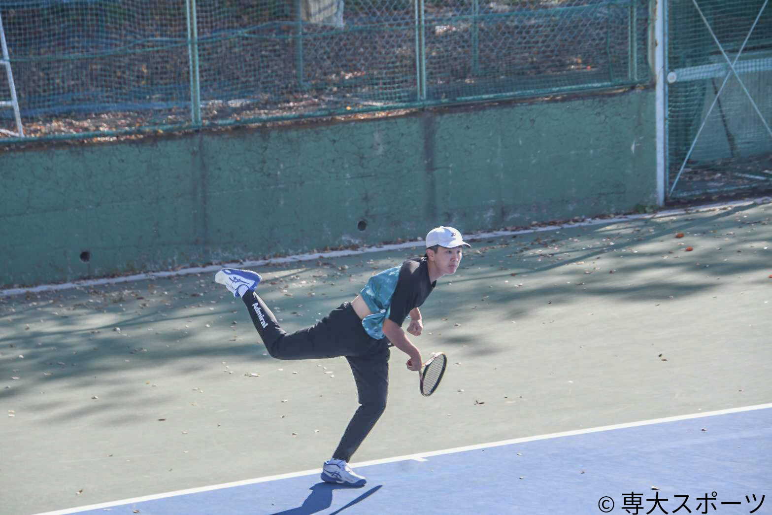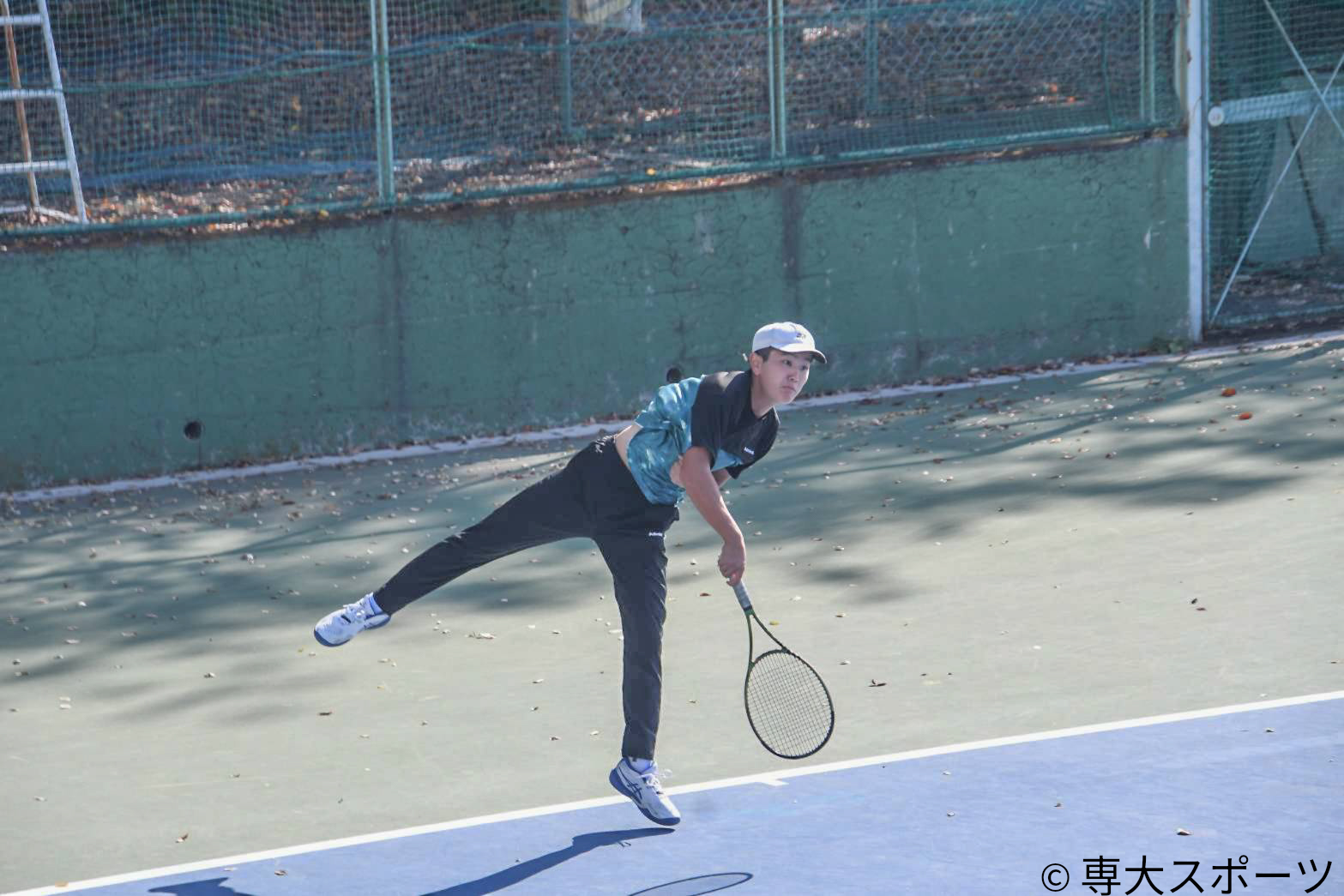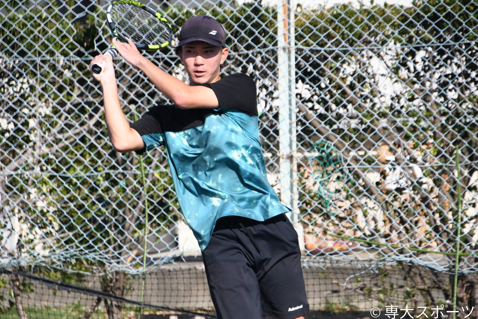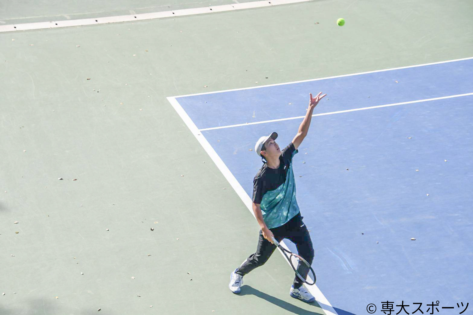 シングルス2番手の傳刀は「自分の課題としてるミスをしない球で、相手より先にコースを打ち分けて展開するというプレーができた。相手が崩れたタイミングでのネットプレーもポイント獲得率が高かったので良かった」と堂々としたプレーをみせて6-0で第1セットを折り返す。第2セットも「全然競ると思っていたが、相手の振られた時の守りがスライスメインだったので、ボレーでカットするのを心がけた。前に出てちゃんと決め切れば、1セット目の時点である程度このプレーを続けていたら(試合を)取れる感触」があり、6-1で制した。終盤1ゲームを落とし、ダブルベーグル達成はならなかった原因として「コースを散らすというのを課題にしていたが、リスク管理ができてない時があり、ミスがセカンドセットの後ろの場面で目立っていた。ある程度守るところはちゃんとクロスに返して、散らすところは散らすという、そういう状況判断を上手くできるように」と反省点を口にした。