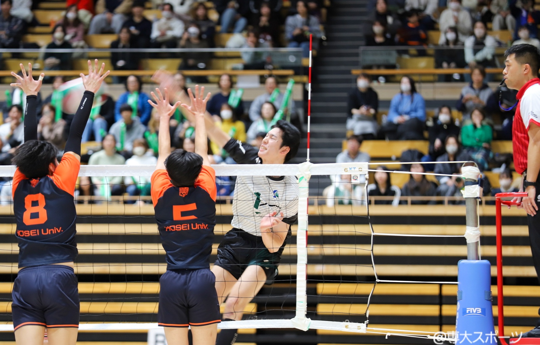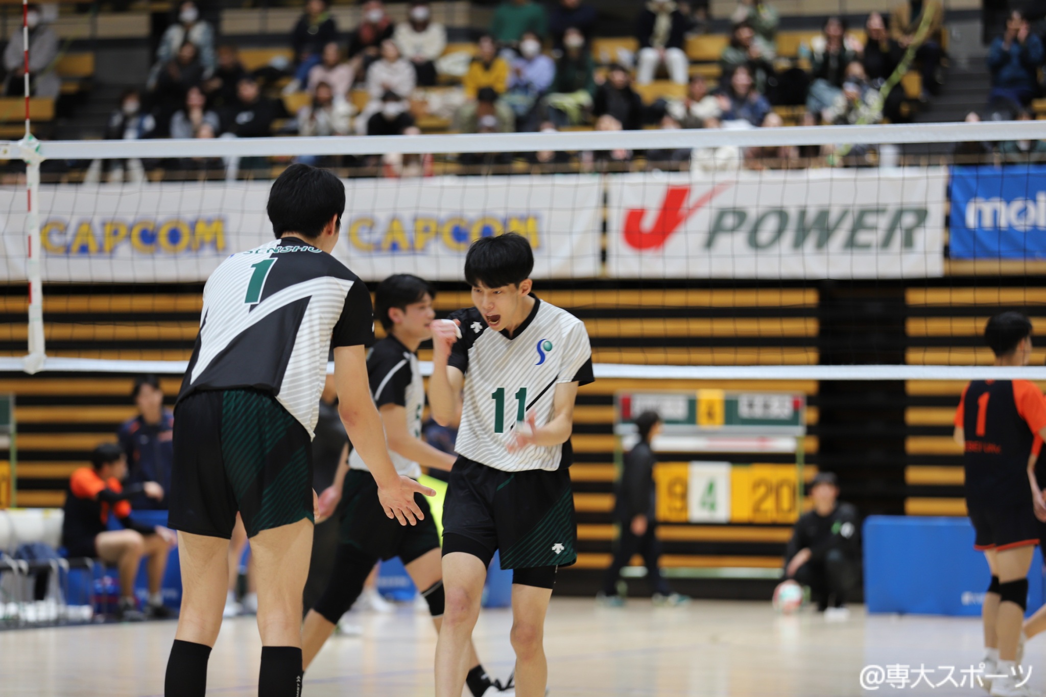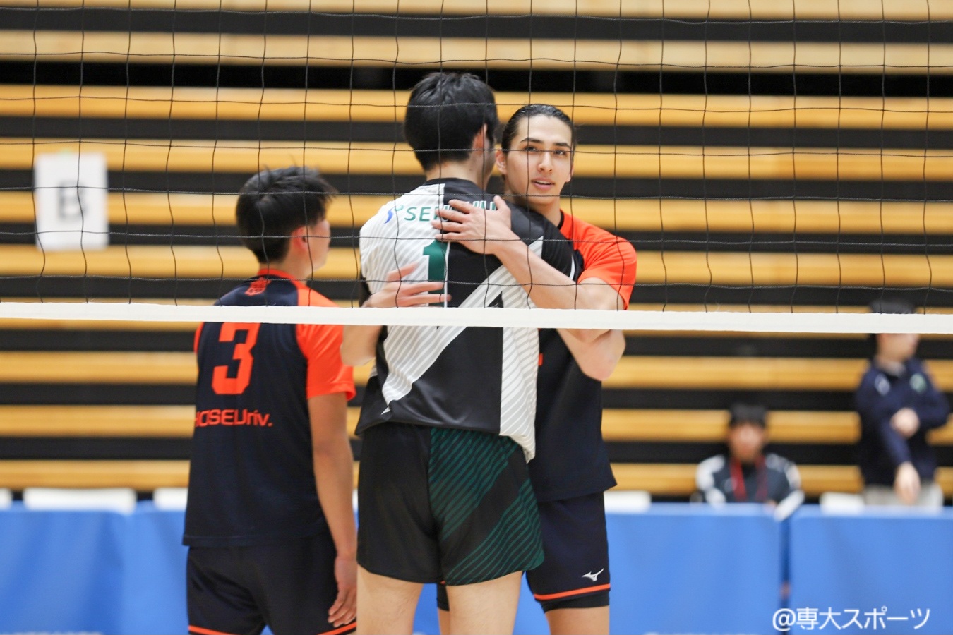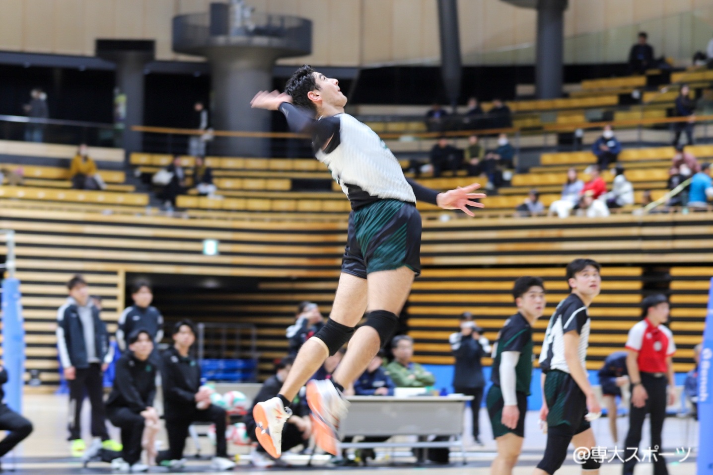 第1・第2セットは高橋慶帆選手を筆頭とする法大の鋭い攻撃に手が出ず、アタックとブロックが決まらない場面が続いた。勢いに乗れないまま、それぞれ23-25、16-25で落とした。後がない専大は第3・第4セット、甲斐とマサジェディ翔蓮(文1・福大大濠高)を中心に果敢に攻撃を仕掛けていく。水野永登(商4・岡谷工業高)の好レシーブ、そして専大の強みであるブロックで相手の猛攻を止めると25-22、25-23と連続でセットを獲得し、同点に追いつく。運命の第5セットは取っては取り返されるシーソーゲームとなった。しかし、専大の勢いは止まることはなかった。会場中の”専大コール”を背に受け、甲斐が土壇場でサーブ面で勝負強さを発揮し、それにマサジェディがスパイクで応え、レシーブ、ブロックと総力戦で法大に挑んだ。勢いそのままにセットカウント3-2で逆転勝利。ベスト8進出を果たした。
