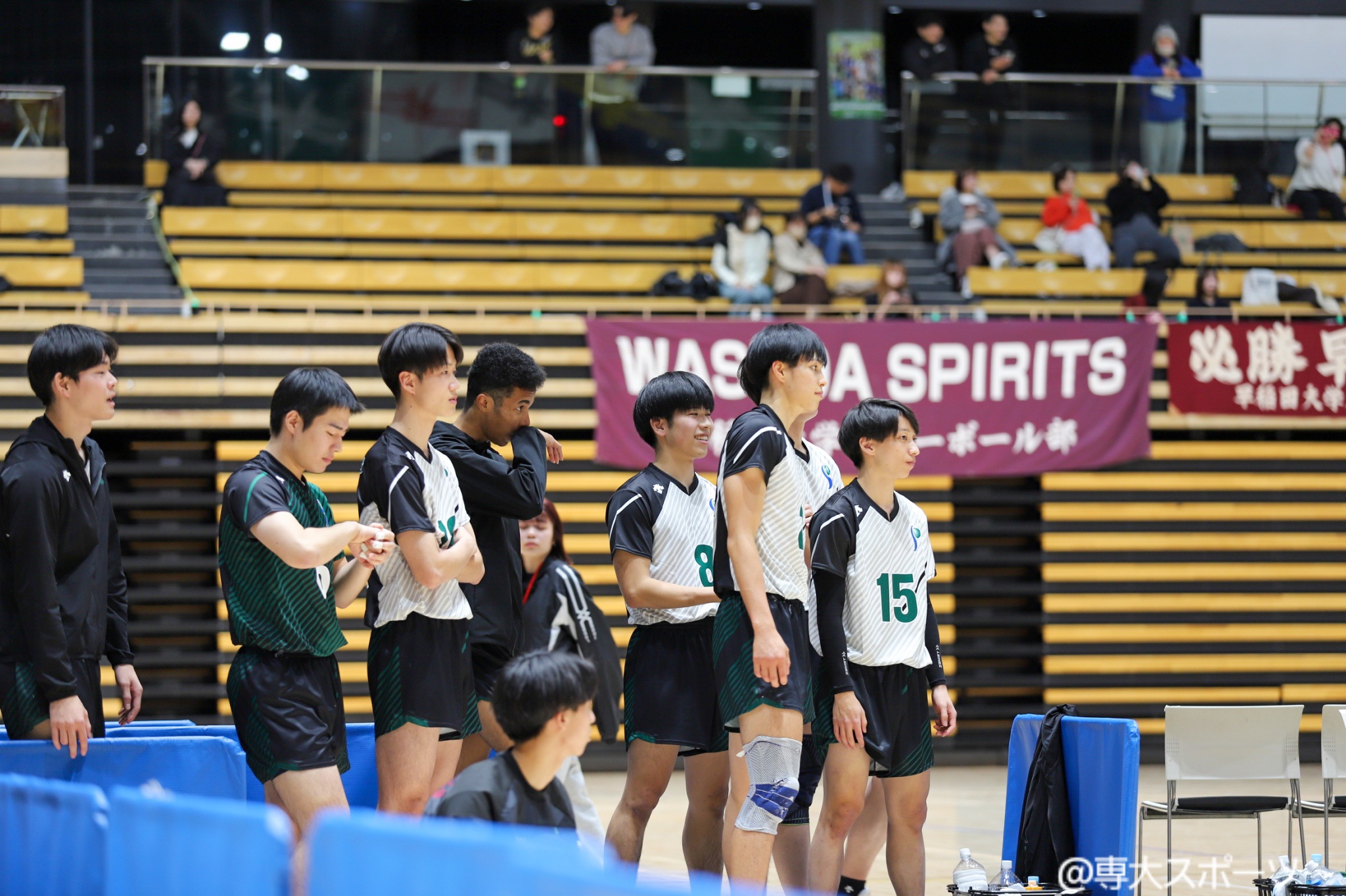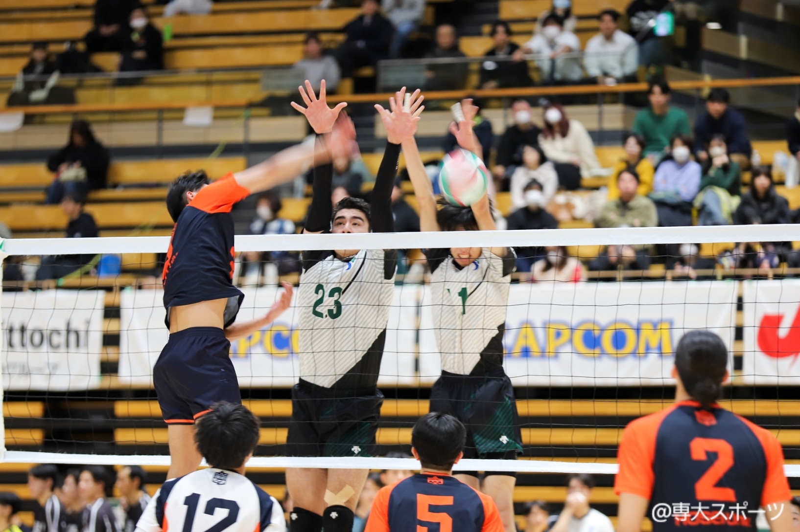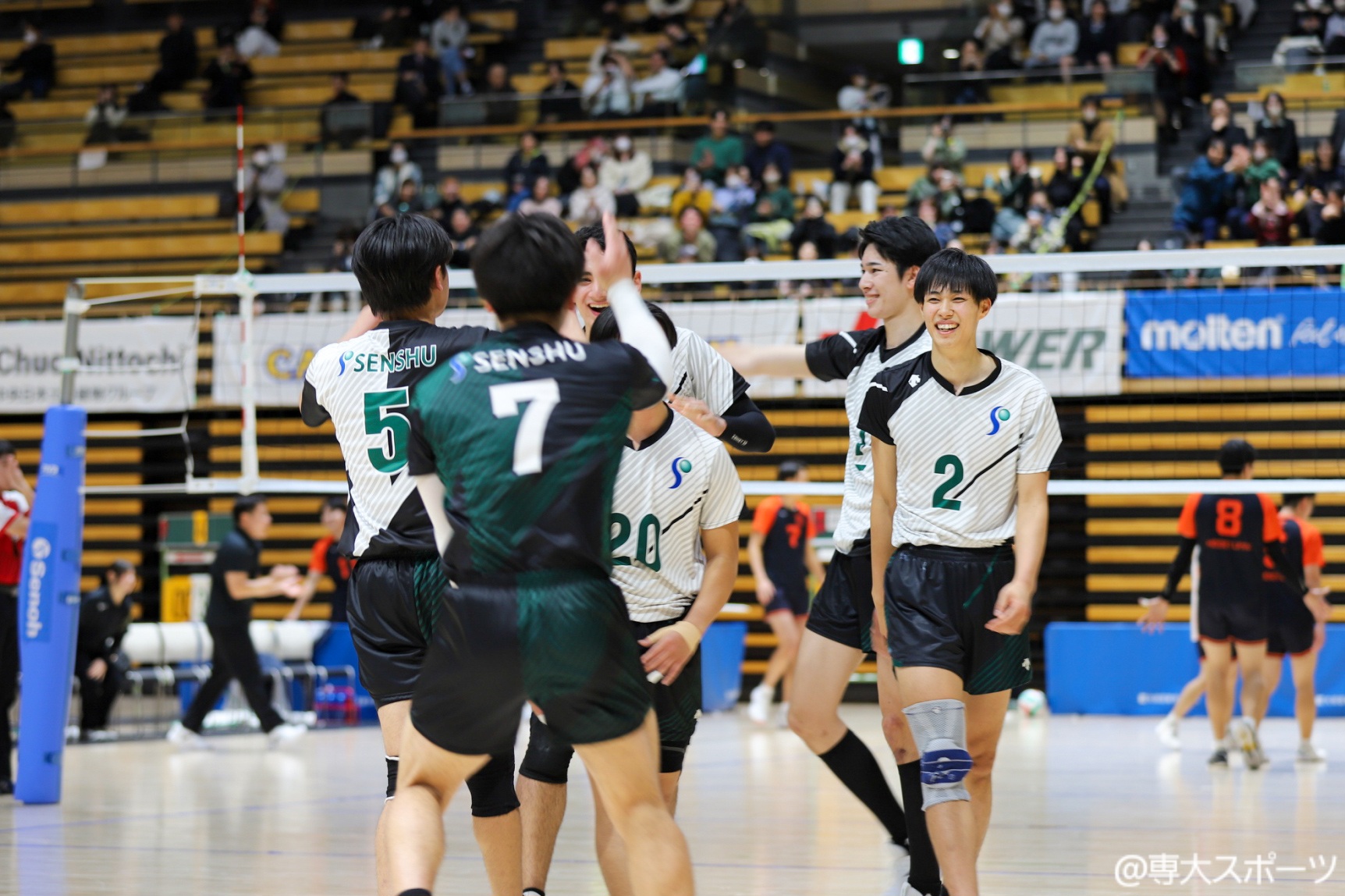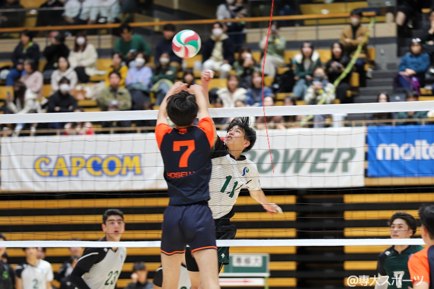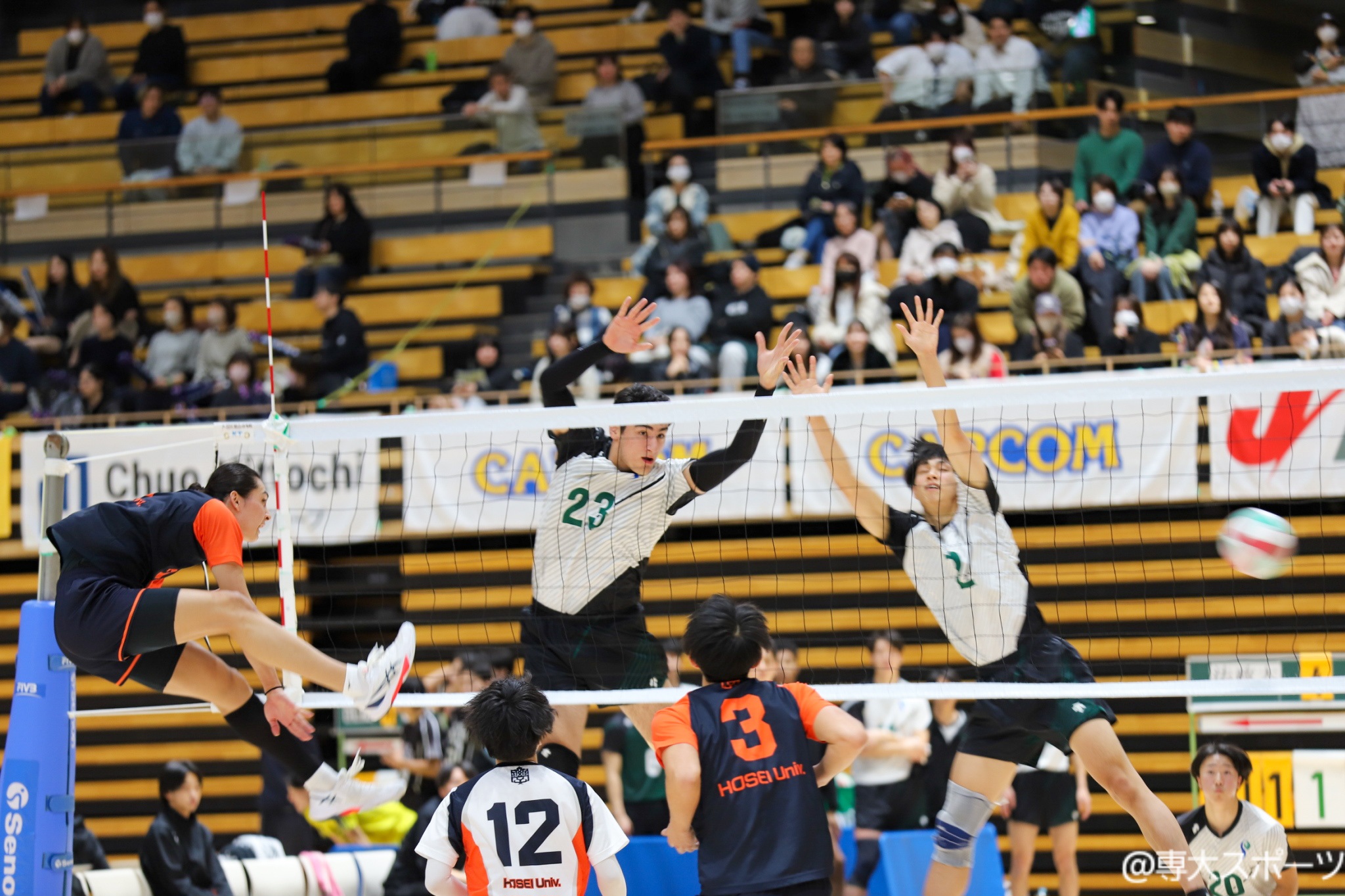 第1・第2セットは高橋慶帆選手を筆頭とする法大の鋭い攻撃に手が出ず、アタックとブロックが決まらない場面が続いた。勢いに乗れないまま、それぞれ23-25、16-25で落とした。後がない専大は第3・第4セット、甲斐とマサジェディ翔蓮(文1・福大大濠高)を中心に果敢に攻撃を仕掛けていく。水野永登(商4・岡谷工業高)の好レシーブ、そして専大の強みであるブロックで相手の猛攻を止めると25-22、25-23と連続でセットを獲得し、同点に追いつく。運命の第5セットは取っては取り返されるシーソーゲームとなった。しかし、専大の勢いは止まることはなかった。会場中の”専大コール”を背に受け、甲斐が土壇場でサーブ面で勝負強さを発揮し、それにマサジェディがスパイクで応え、レシーブ、ブロックと総力戦で法大に挑んだ。勢いそのままにセットカウント3-2で逆転勝利。ベスト8進出を果たした。