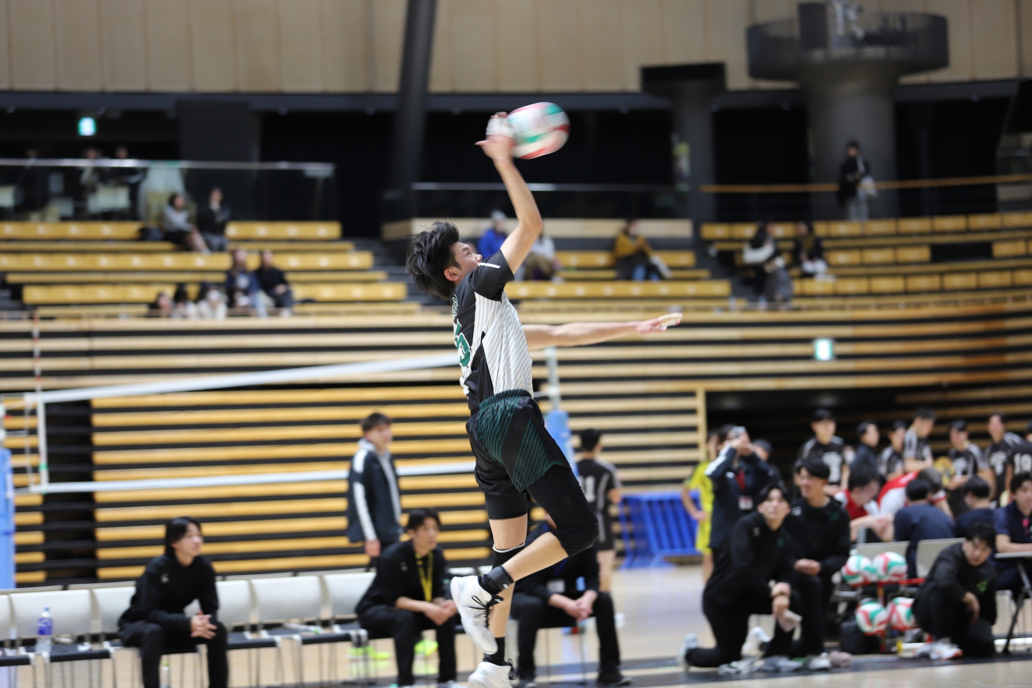 第1セットは、序盤から相手の鋭い攻撃が立て続けに決まる。悪い流れを切ろうとマサジェディが攻撃を仕掛けるも相手の高さのある3枚ブロックに阻まれる。それでも新居良太(経済3・開智高)の緩急のあるプレーや堀内大志(文4・日南振徳高)の相手のブロックを避けるアタックで必死に食らいつく。中盤で相手の猛攻が牙を向く。相手の高さのあるスパイクをレシーブで拾えない場面が続き、13-18と5点差をつけられる。そんな状況でも甲斐がエースとしての意地を見せ、サービスエースを決める。その後も新居がダイレクトアタックで得点し、20-20の同点に追いつく。終盤は取っては取り返されるシーソーゲームとなった。しかし、相手の粘り強いレシーブと上からの攻撃に苦戦し、23-25で惜しくも第1セットを落とした。