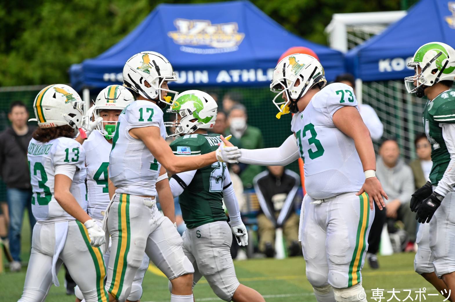 運命の第4Q。専大ディフェンスが相手をパントに追い込み、攻撃へのリズムを作る。オフェンスでは#22原のランで前進すると、3rd downで#17佐藤が見事なパスキャッチを見せ敵陣20ydへ。その後もフレッシュを獲得してゴール前残り2yd、4th downの場面。FGで同点を狙う選択肢もある中、専大ベンチは逆転へのギャンブルを選択した。 託されたボールを持って走ったのは#22原。ディフェンスをこじ開けエンドゾーンに飛び込み、土壇場で21-17と逆転に成功した。試合時間残りわずか、再逆転を狙う芝工大のロングパスに対し、専大ディフェンスが集中力を切らさず守り切り試合終了。昨年の雪辱を果たす大きな1勝となった。