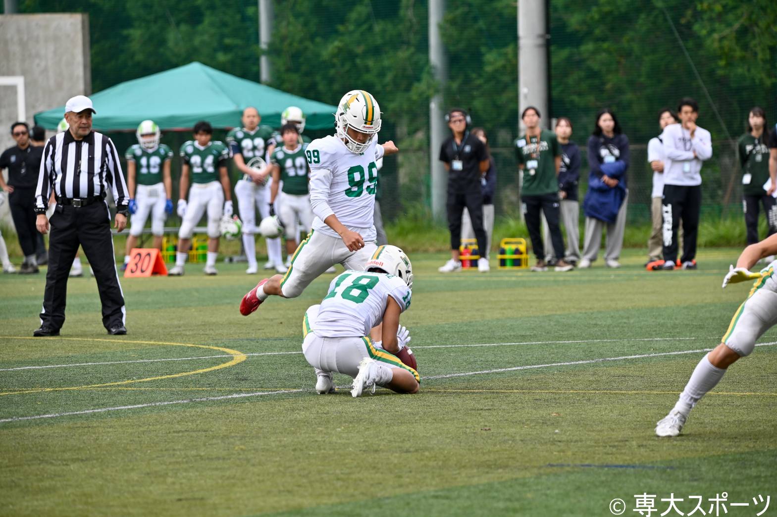 試合は芝工大のキックオフで開始された。第1Q、専大は#22 原のランプレーを中心に敵陣へ攻め込むと、ゴール前残り2ydから#35金田遼平(文2・専大北上高)がエンドゾーンへ飛び込み先制のTD。#99奥山春輝(経済3・東海大相模高)のキックも安定して決まり、7-0と好調な滑り出しを見せた。しかしその後、ディフェンス陣が相手のロングランを許し、FGで3点を返された。