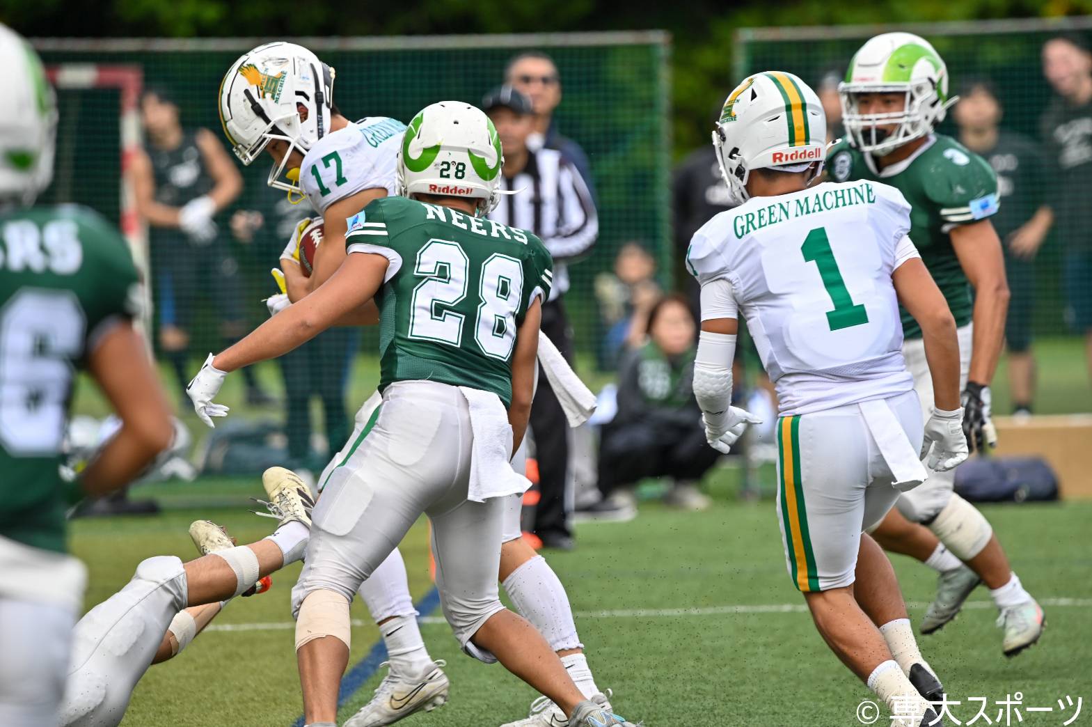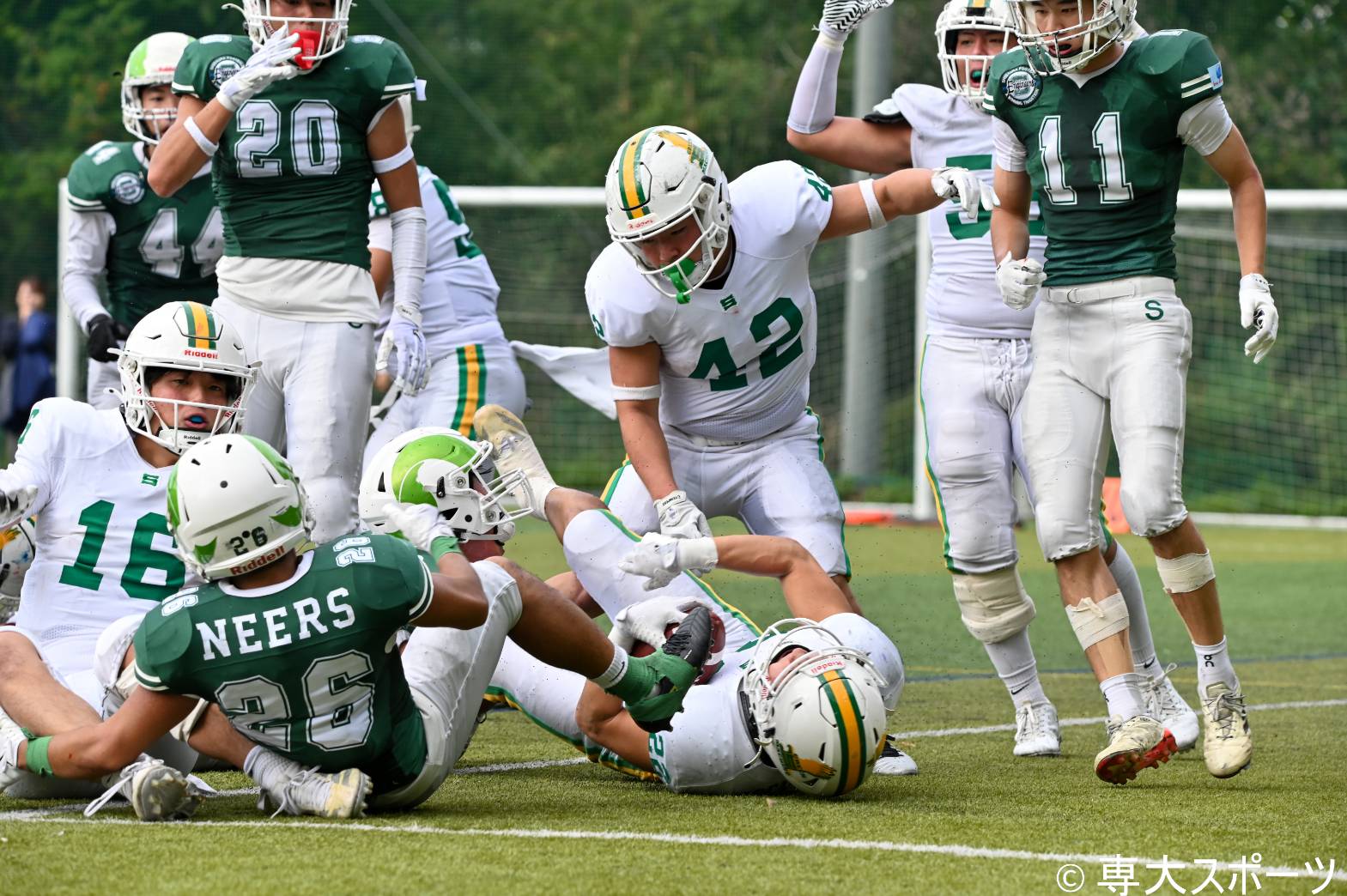 ここまで3勝1敗でBブロック1次リーグ最終戦を迎えた専大GREEN MACHINEは、昨年のリーグ戦で敗北を喫した因縁の相手、芝浦工業大学と対戦した。試合は前半にリードを許す苦しい展開となったが、第4Q終盤、#22原遼介(法2・日工大駒場高)が勝負を決定づける逆転TDを決め、21-17で勝利した。この勝利で専大は昨年のリベンジを見事に果たすとともに、2次上位リーグへの進出を決めた。