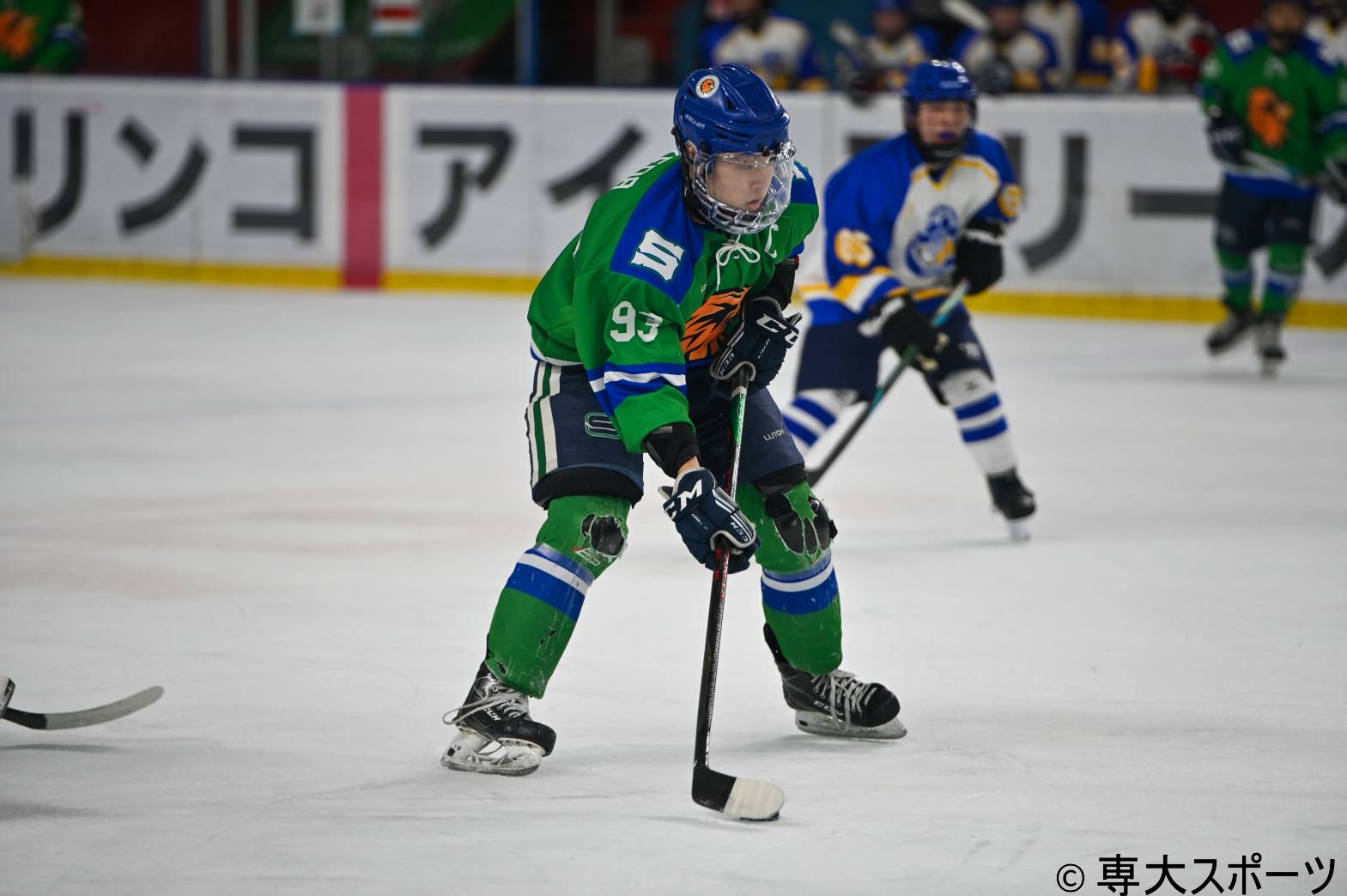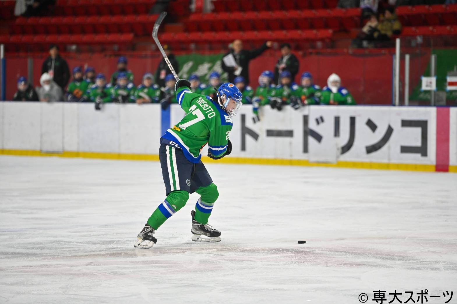 第1ピリオド、開始早々に主導権を握ったのは専大だった。2分12秒、#15塩原陸生(法3・日光明峰高)が放ったシュートは相手GKに阻まれるも、こぼれたパックを#21高橋宙来(法3・八戸工大一高)が押し込み先制点を挙げる。これで流れを掴むと、その後も#27金本怜恩(法3・八戸工大一高)がブルーライン付近からのロングシュートを突き刺しリードを広げた。18分40秒にはパワープレーのチャンスを得ると、#27金本のアシストから主将の#93池田洋貴(商4・釧路工業高)が鮮やかなミドルシュートを決め、4-0と大きく突き放して最初の20分を終えた。