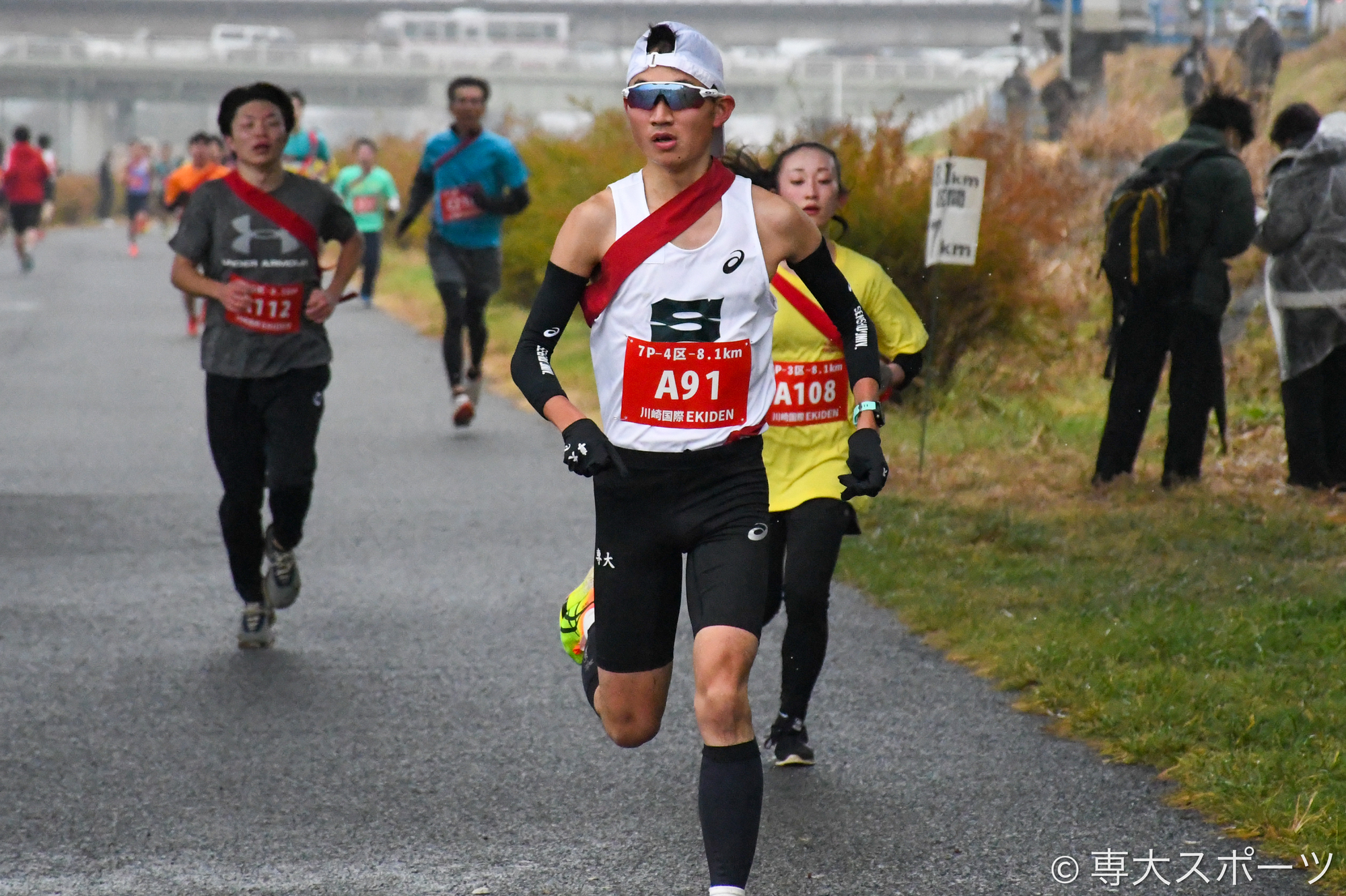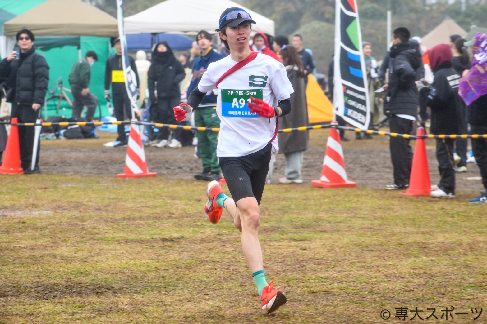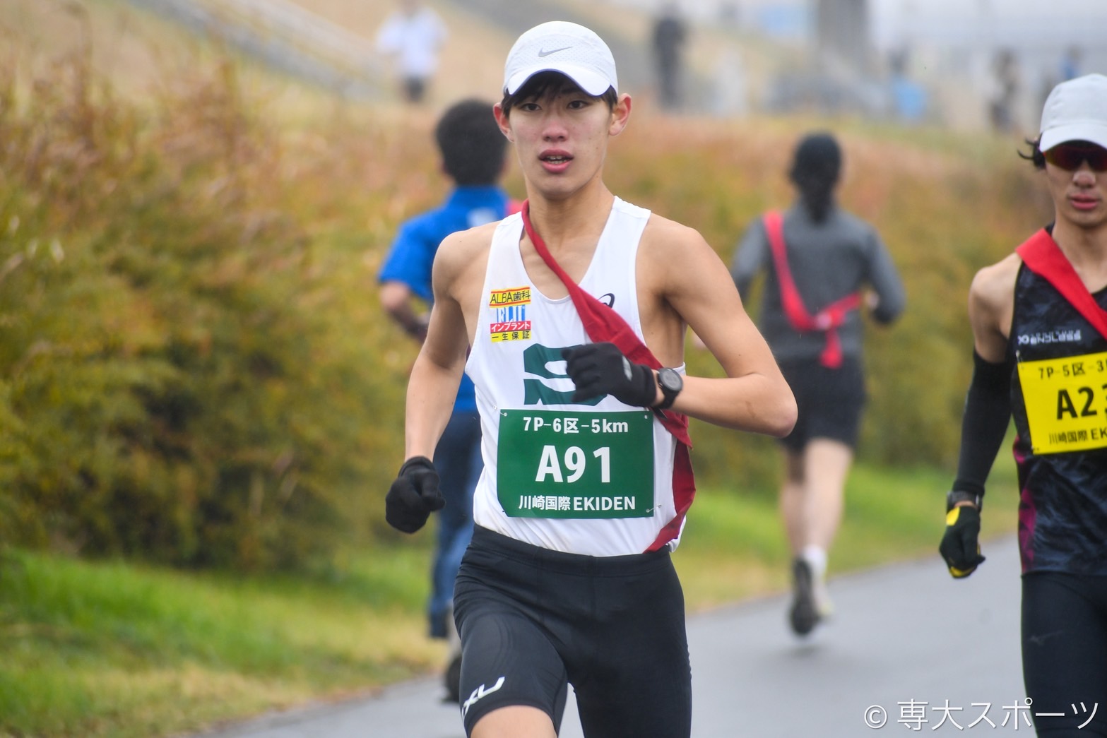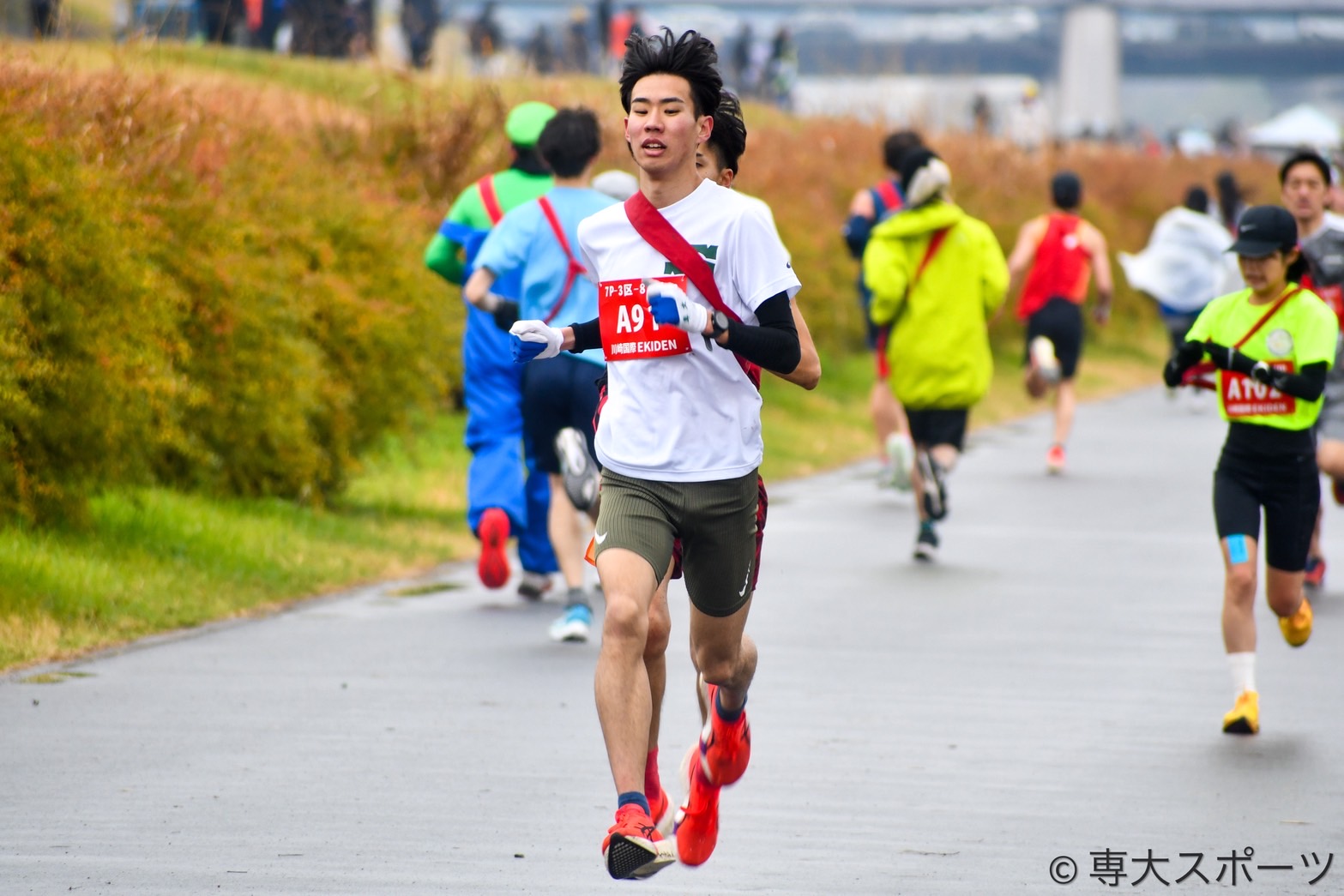 その後も3区8.0975kmで数々の公式戦で力闘してきた手塚太一(経営4・那須拓陽高)が順位を3つ上げ、3位に浮上。4区8.0975kmには再び専大のユニフォームに袖を通したOBの大田和一斗さん(令7卒・文)が登場し、1人を抜き2位で通過した。