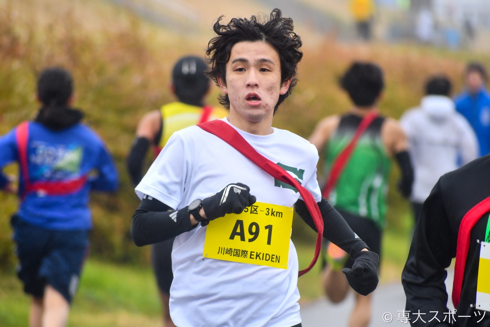 雨が降りしきる中、多摩川河川敷で都大路と同じ構成のコースを7人でつなぐ今大会。最長区間1区10kmを任されたのは前回の箱根駅伝で8区を出走した犬塚知宏(文4・美濃加茂高)だった。寒冷な気温で足元のコンディションが良好ではない中「今まで経験したことのない寒さで、本当に寒かった。きついよりも寒さが勝つくらい。1.6kmの折り返し地点が(水たまりで)沼になっていて、そこで水を肩から下にザバっと浴びてしまって、そこから体が動かなくなってしまった」と苦戦。先頭集団から離れ、区間11位でたすきを渡した。