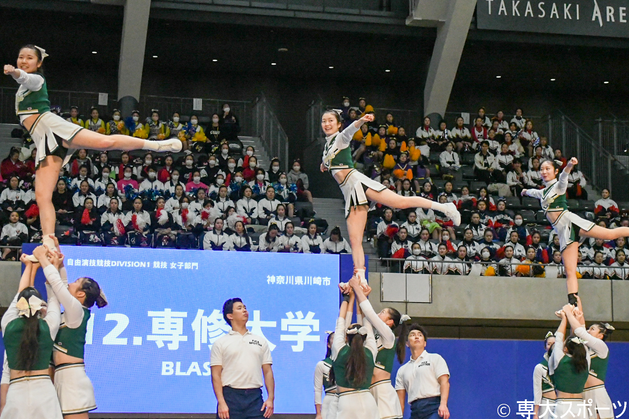 野球部やアメリカンフットボール部などの体育会部活の試合に駆け付け、エールを送り続けている全學應援團チアリーダー部「BLASTS」。彼女たちには応援する以外に、“競技チアリーディング”の選手としての顔がある。組体操のような協力技である「スタンツ」やバク宙などの個人技を指す「ダンブリング」、キレのある動きの「モーション」、「ダンス」等を組み合わせて競う、2分30秒に迫った。