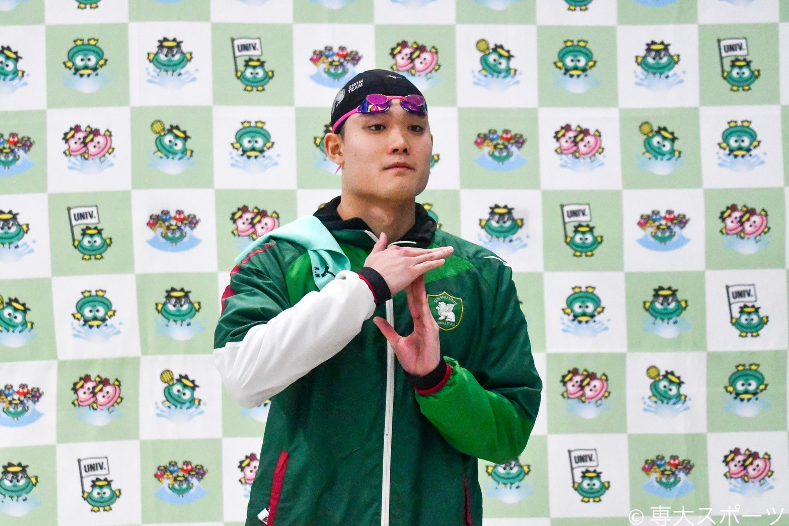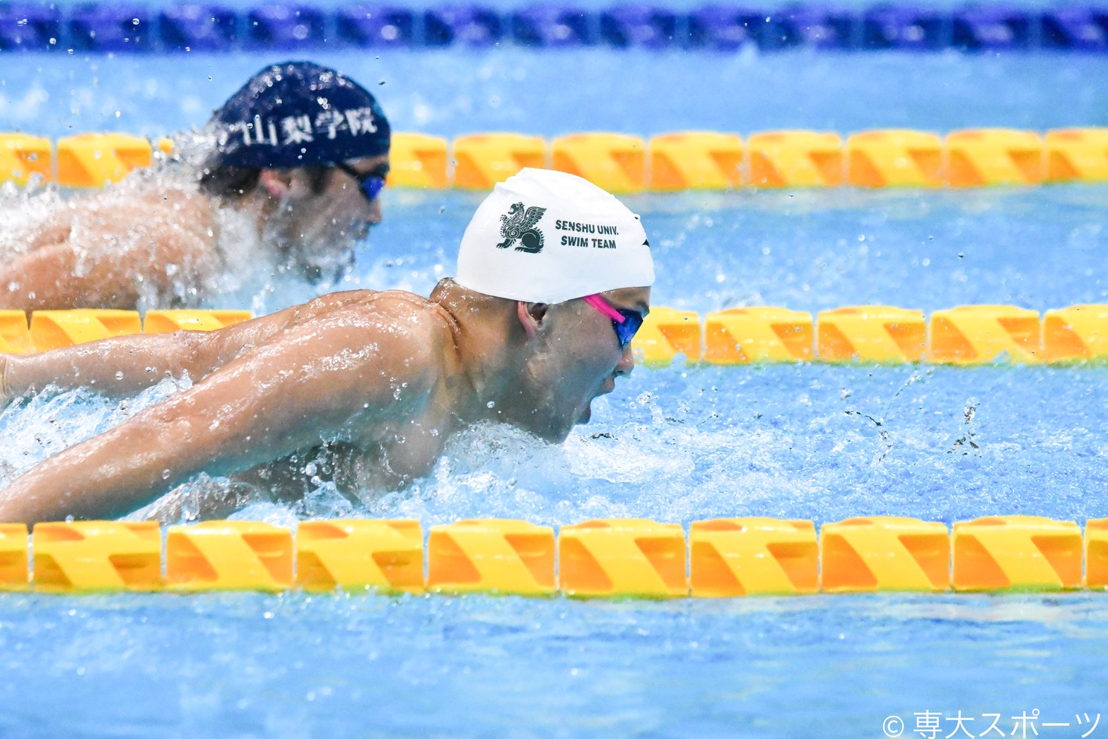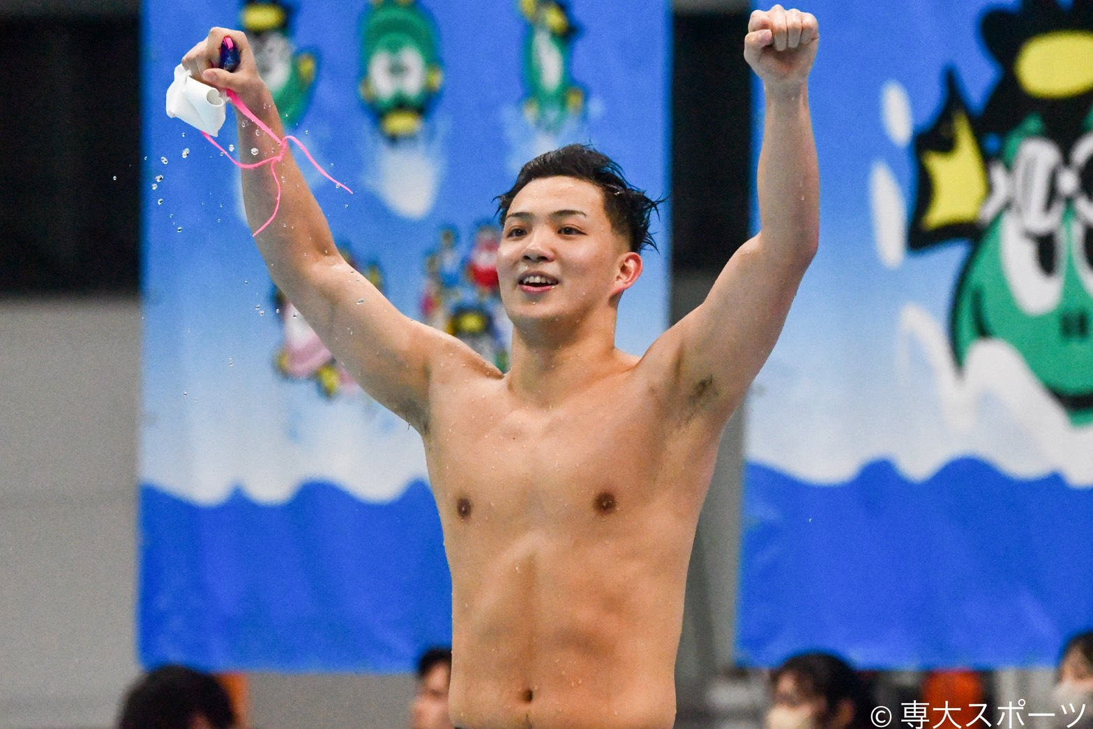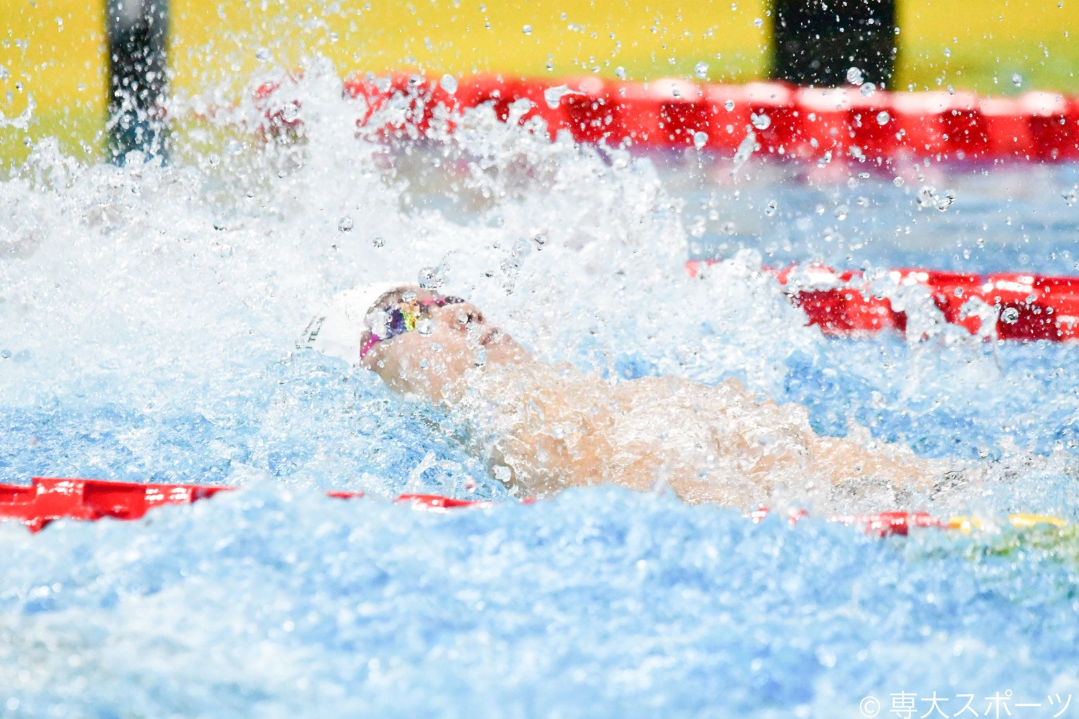 岩永は予選をタイム1:55.19秒の2位で終えて決勝に進んだ。迎えた大一番では中盤まで先行を許す展開に。それでも「周りに置いていかれても焦らず、落ち着いて自分のレースを貫けたのが良かった」と自分の泳ぎに集中した。残り50mで加速し、見事に自己ベストの更新と優勝を収めた。直前の男子100m背泳ぎ決勝では中嶌が同じ日大豊山高出身の後輩に惜しくも敗れた。岩永は「(先輩の)悔しさを晴らしたかった。自分よりベストタイムが速い格上の選手が数多くいたが、絶対に勝ってやるという強い気持ちで挑んだ」と強い絆を力に変えて逆転優勝を収めた。1日目を振り返り、「チーム戦なので、優勝することで専大に良い流れを作りたかった。今回の結果でモチベーションも上がった。夏のインカレに向けて、さらに調整を重ねていきたい」と意気込んだ。