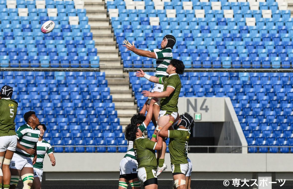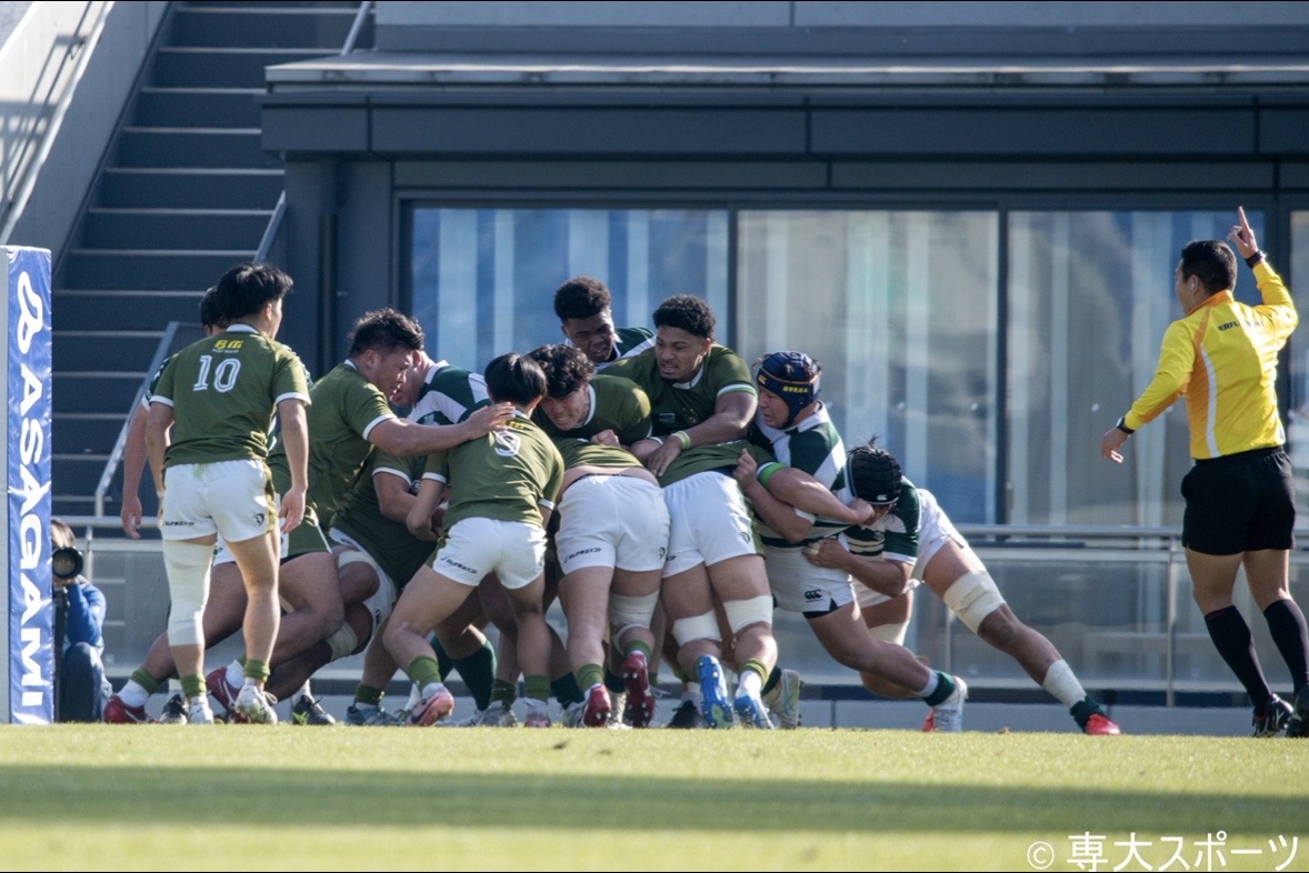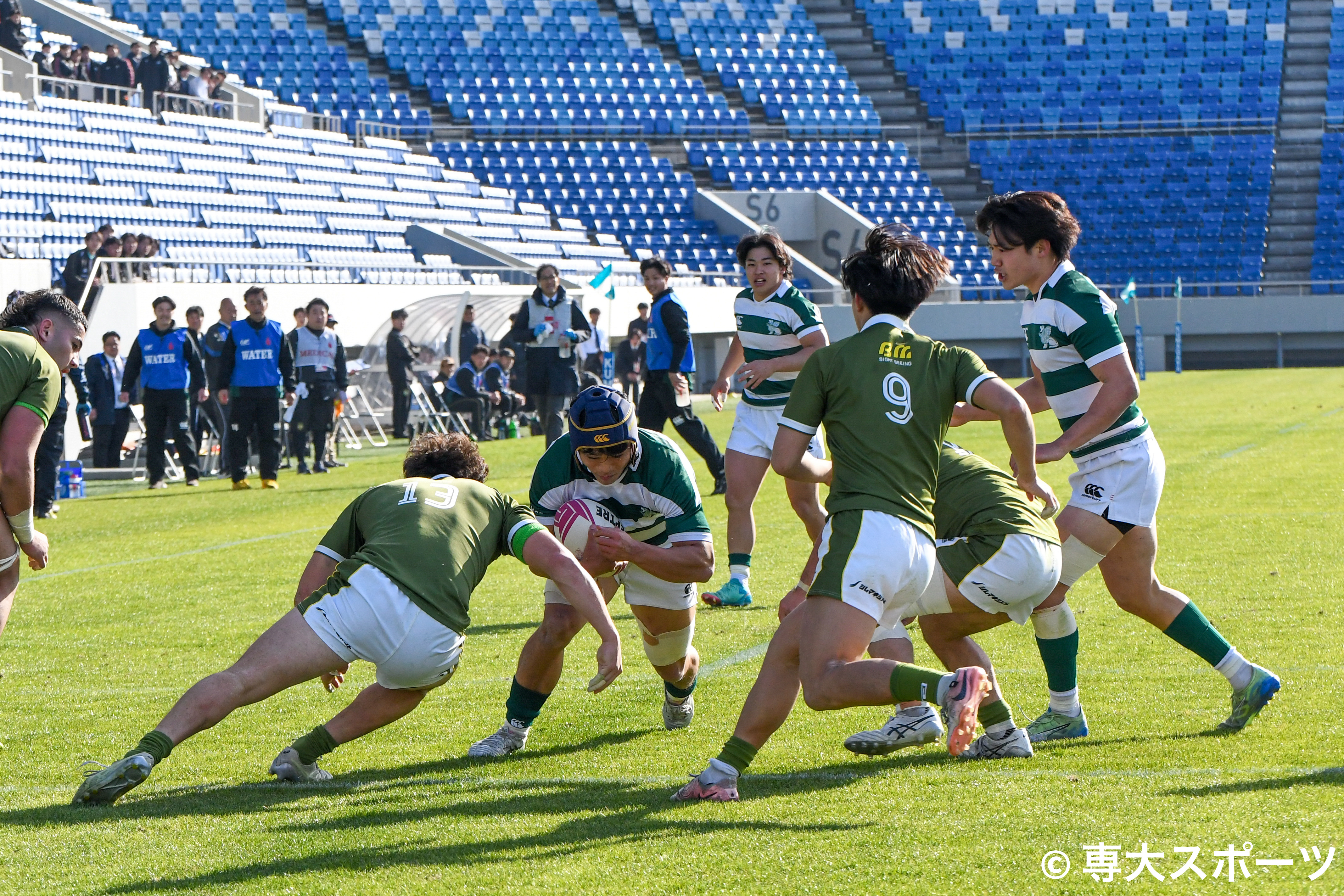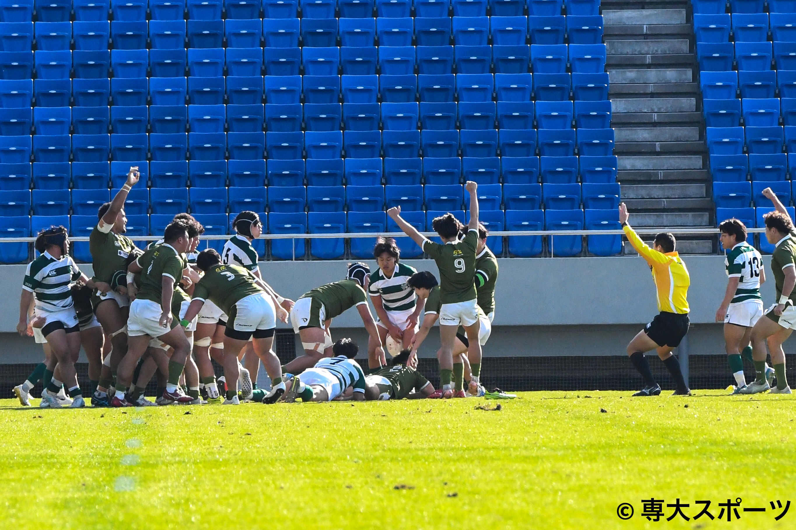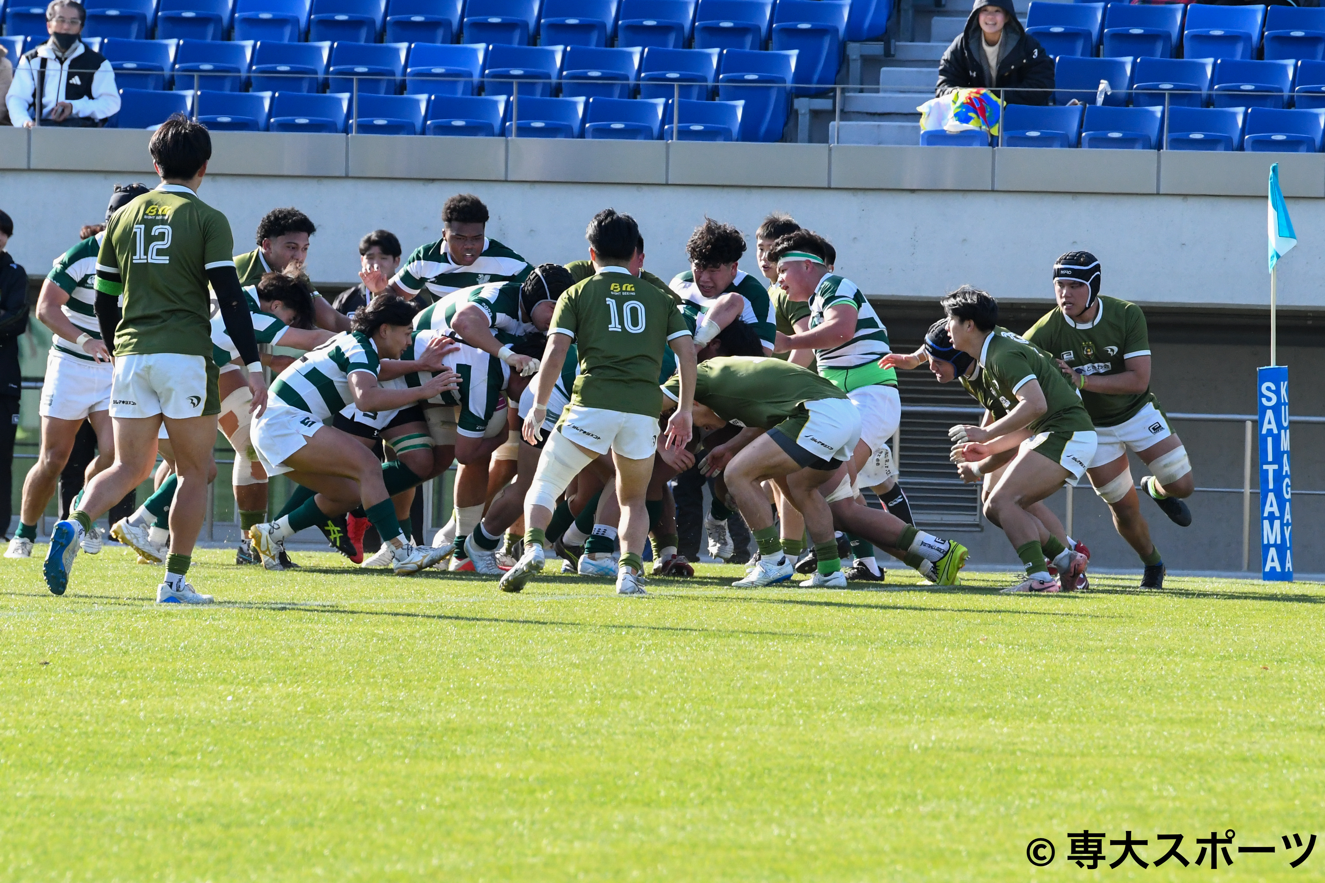以降は両チームともに反則が重なり得点が入らない。攻めきれない時間帯でも、LOヴィリ・ムナ、FLノア・トファエオノ擁する大東大の強力な攻撃を持ち前の堅いディフェンスで抑え込む。しかし、30分台に突入すると自陣でのペナルティが続き、大東大にリードを奪われる。31分には相手のラインアウト起点で素早いランを食い止めるが、専大のペナルティ。その3分後、自陣トライライン目前でペナルティを与えると、タップキックから一瞬の隙を突かれて逆転される。専大は4点を追いかける状況になっても攻め続け、人数をかけてトライライン付近に押し込む。しかし、得点には至らず3-7で試合を折り返す。