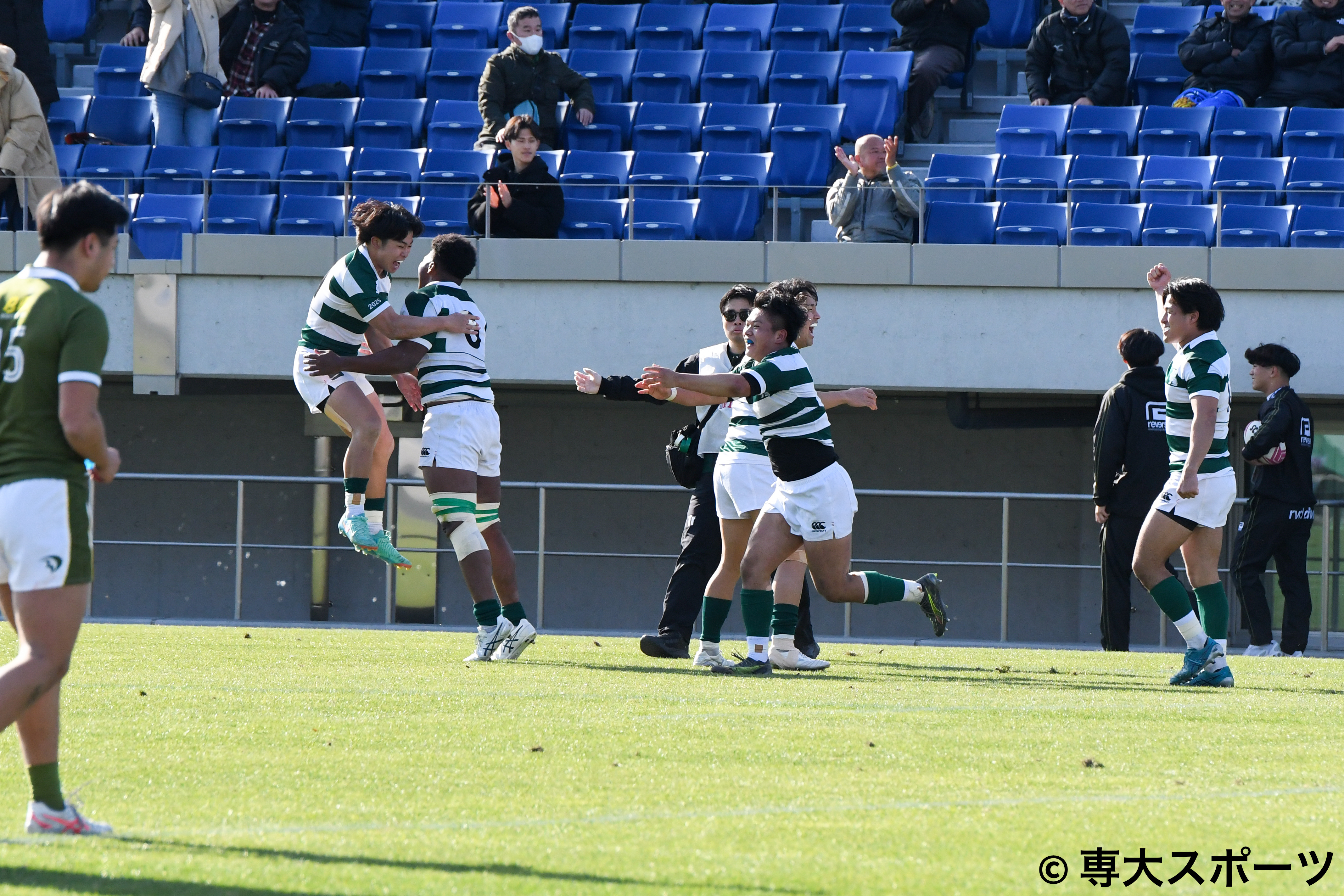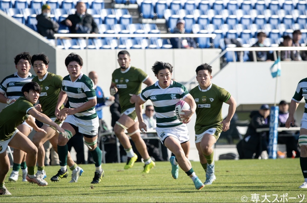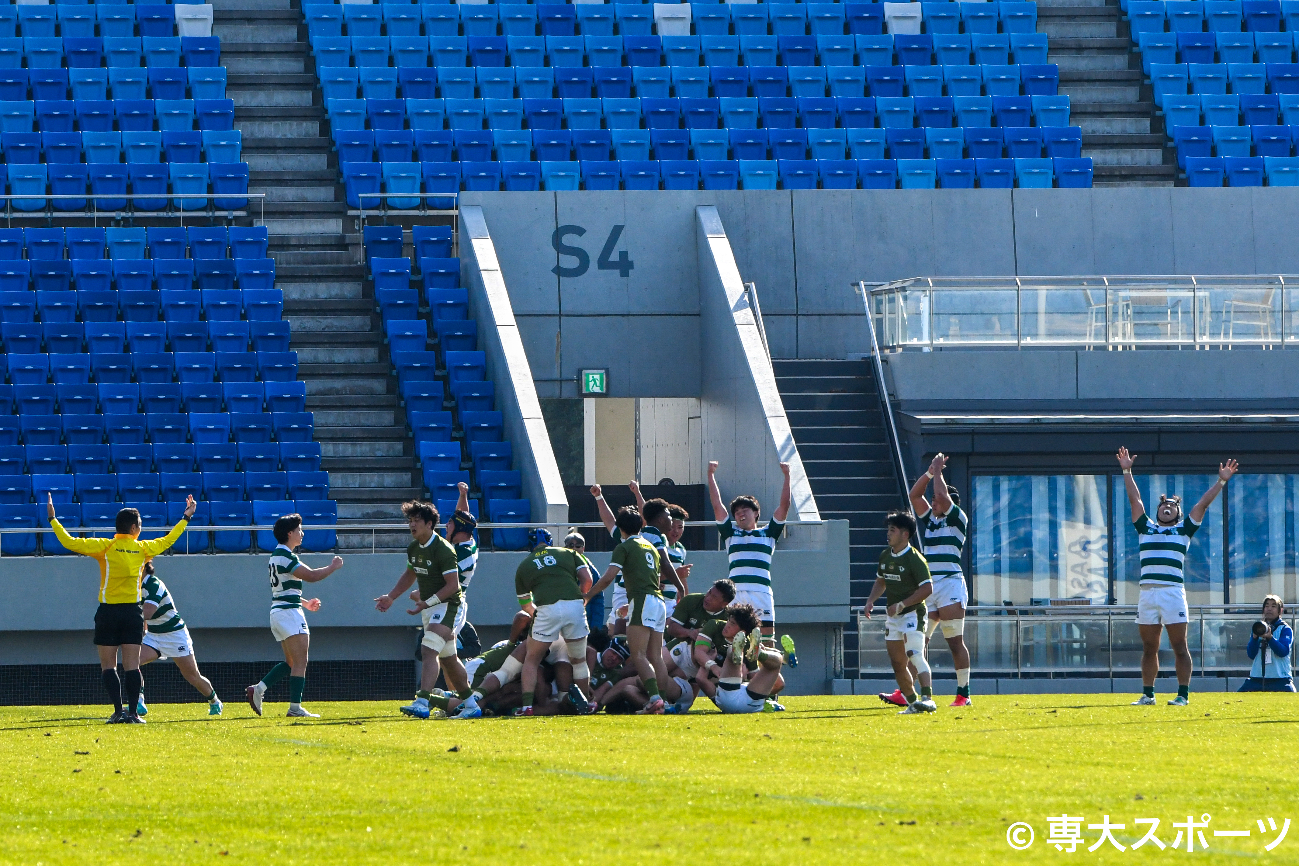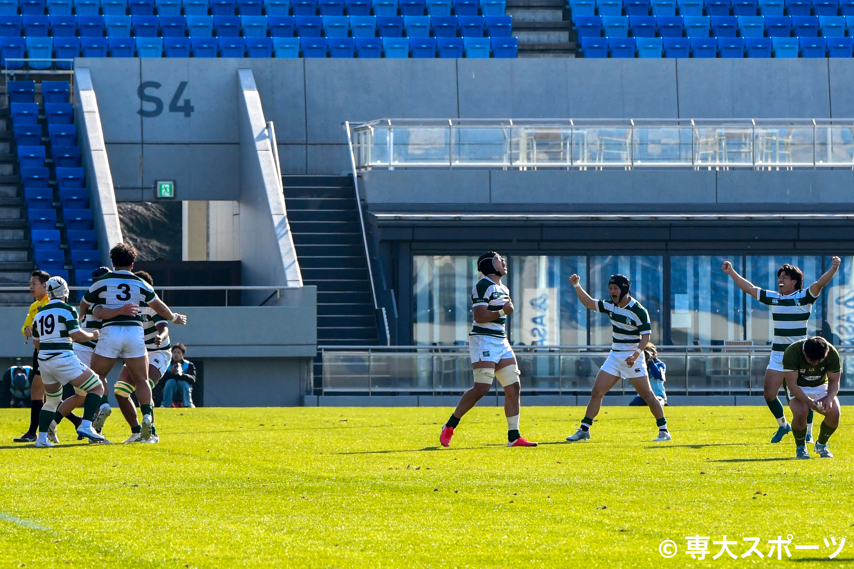 後半立ち上がりから攻める専大は、6分に再び永井のPGで1点差に詰める。以降は点の取り合いが続き、16―19で迎えた後半33分にはモールを押し込み、LO髙橋尚大(文3・東海大相模高)のトライで逆転。ロスタイムにはCTB池田太陽(経済1・長崎南山高)とFL今村琉慈(経済3・國學院大學栃木高)の連続トライで勝負を決定付ける。