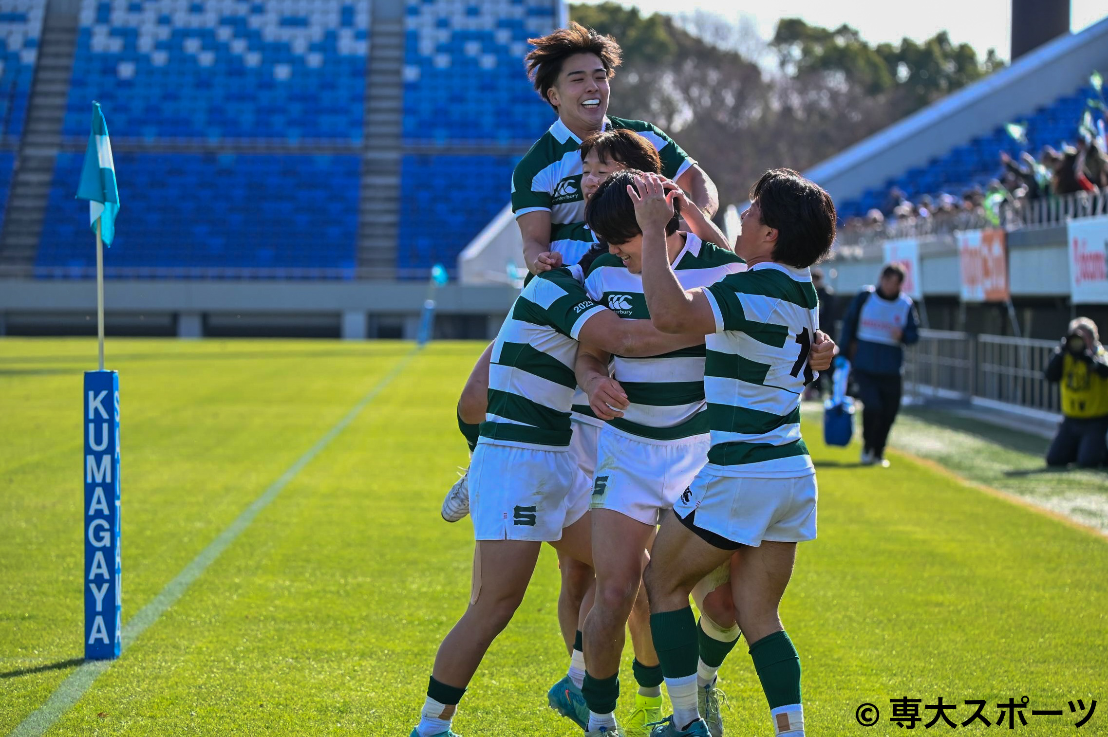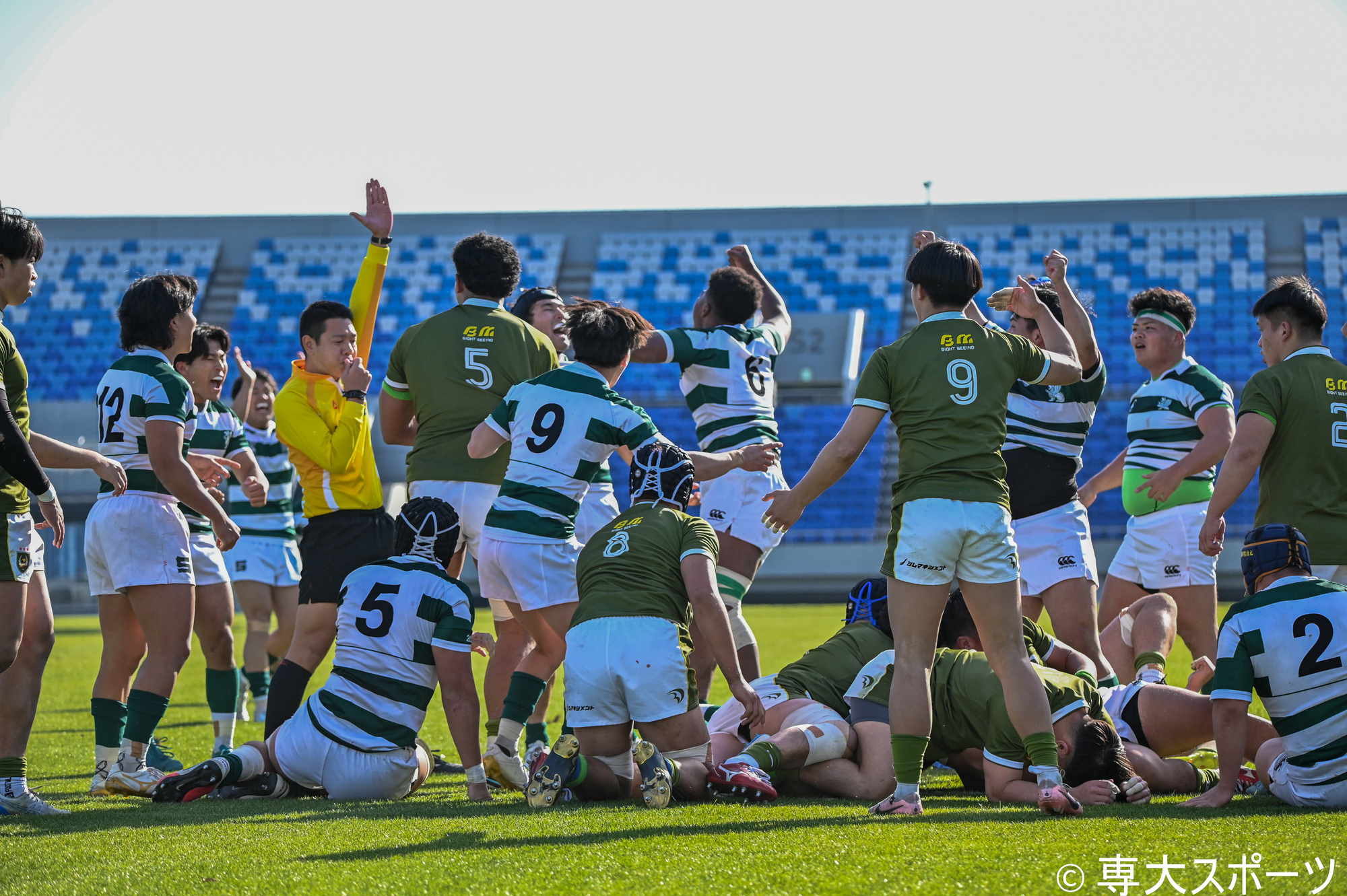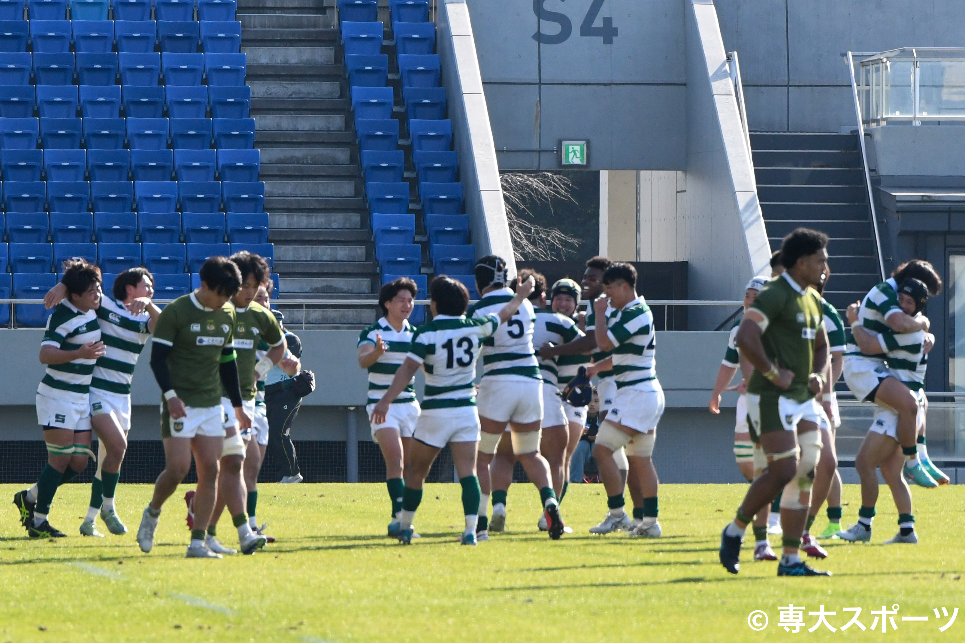 後半立ち上がりから攻める専大は、6分に再び永井のPGで1点差に詰める。以降は点の取り合いが続き、16―19で迎えた後半33分にはモールを押し込み、LO髙橋尚大(文3・東海大相模高)のトライで逆転。ロスタイムにはCTB池田太陽(経済1・長崎南山高)とFL今村琉慈(経済3・國學院大學栃木高)の連続トライで勝負を決定付ける。