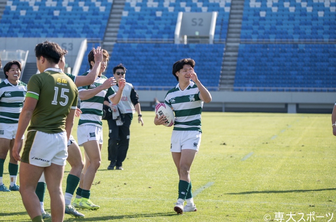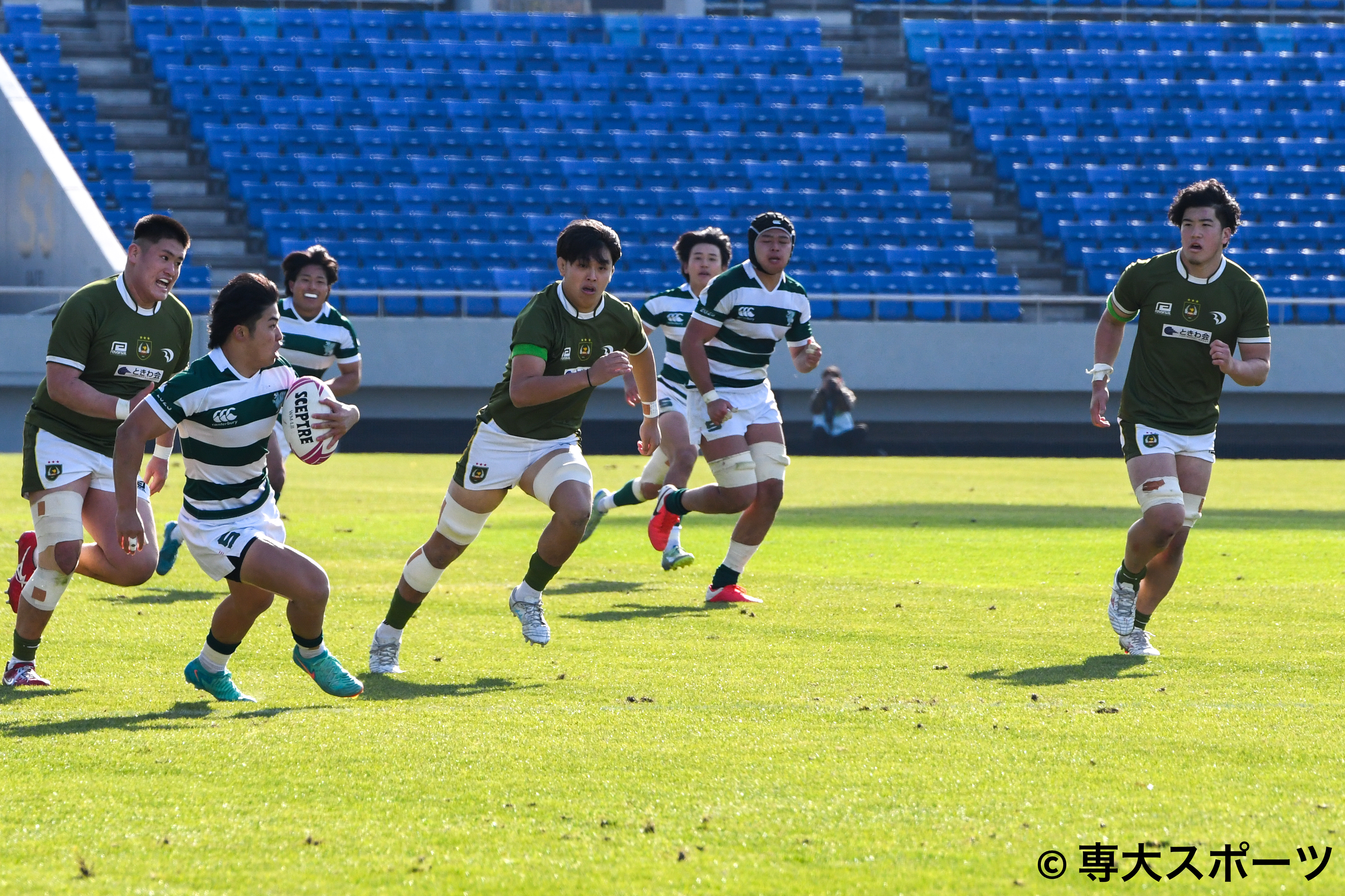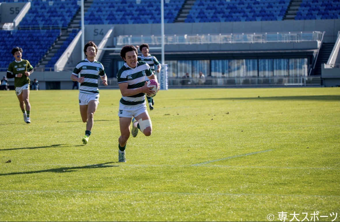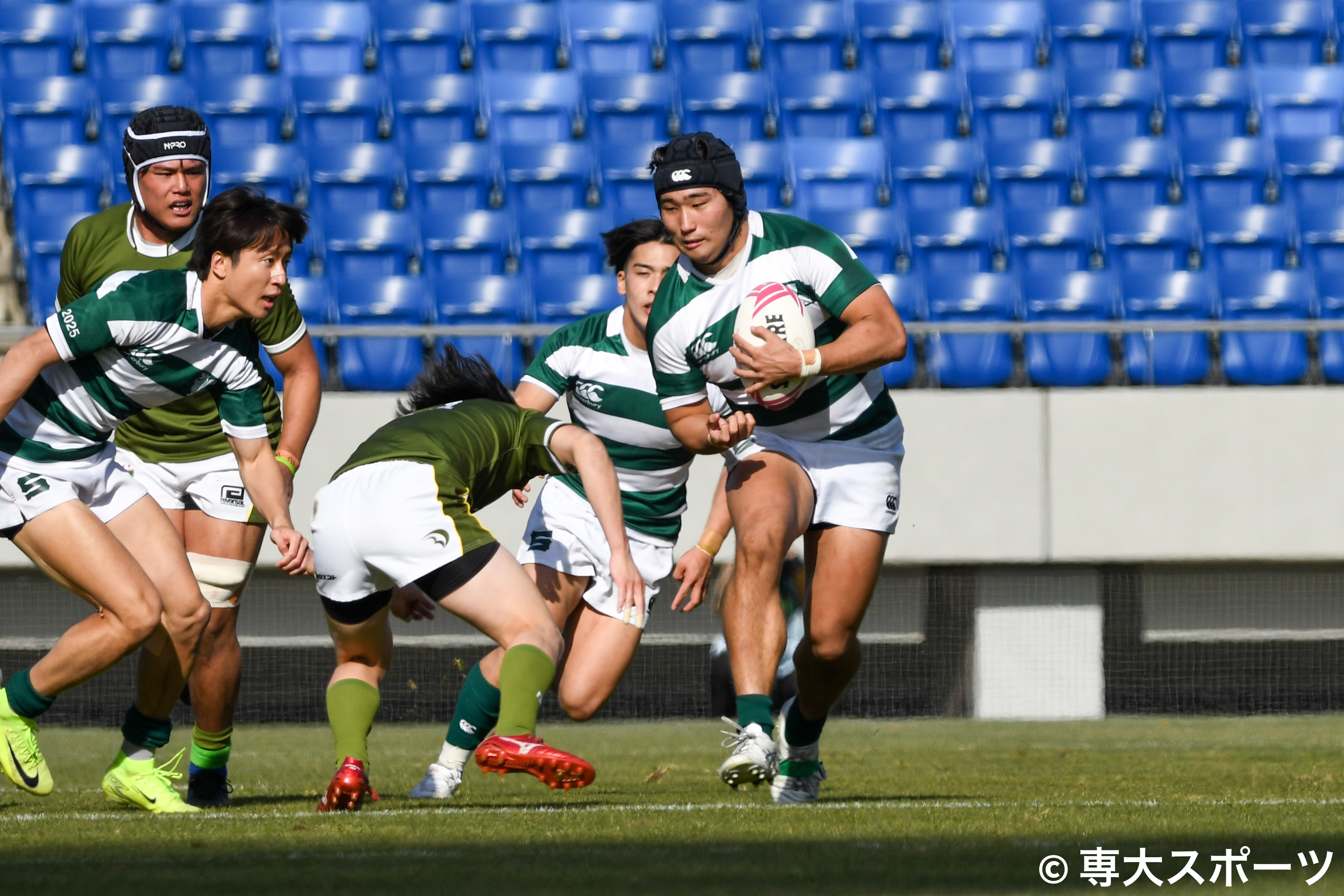 ロスタイムは7分、猛攻を抑えると監督の言葉通りに好機が訪れる。43分に相手のオーバーザトップ(相手側に倒れ込み、ボールを出させないようにする反則)で得たPGは失敗に終わると、大東大はすかさず攻撃を再開。しかし、専大は素早い守備からターンオーバーで攻撃側に移ると、SH神園然(経済2・東福岡高)のキックパスに応えたCTB池田太陽(経済1・長崎南山高)のトライで28-19と点差を広げる。