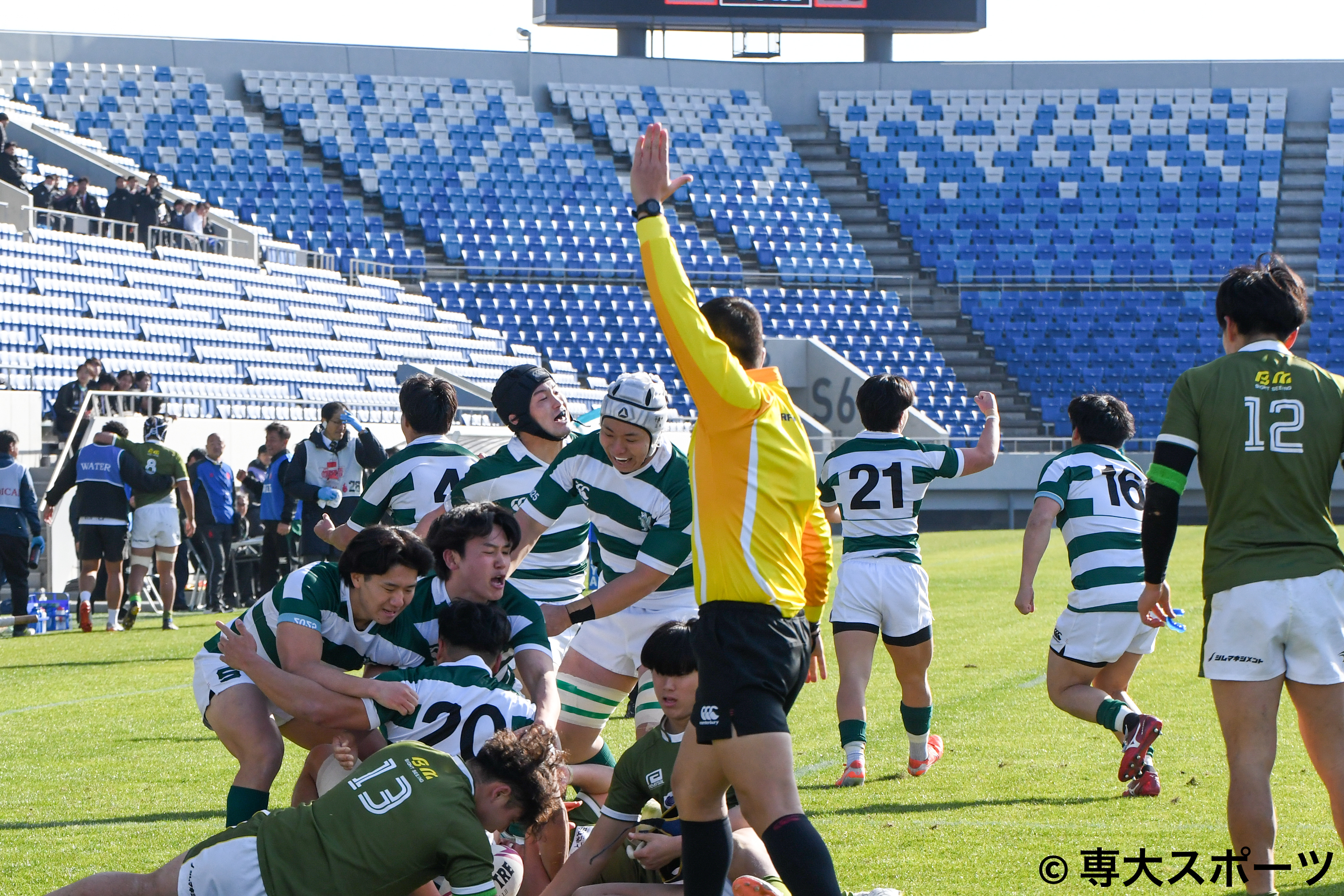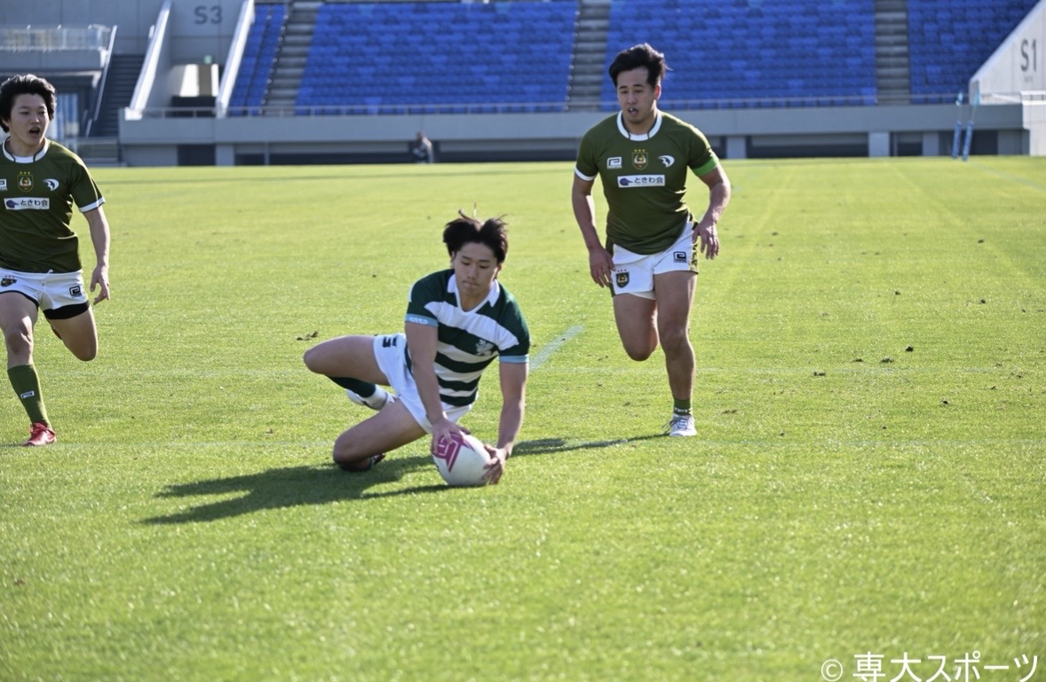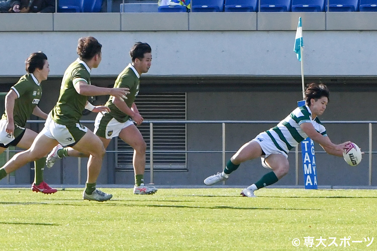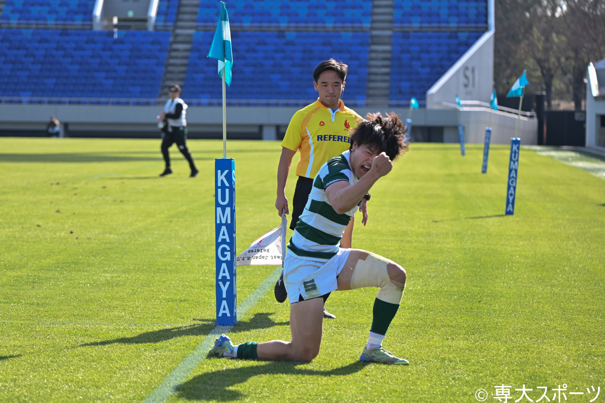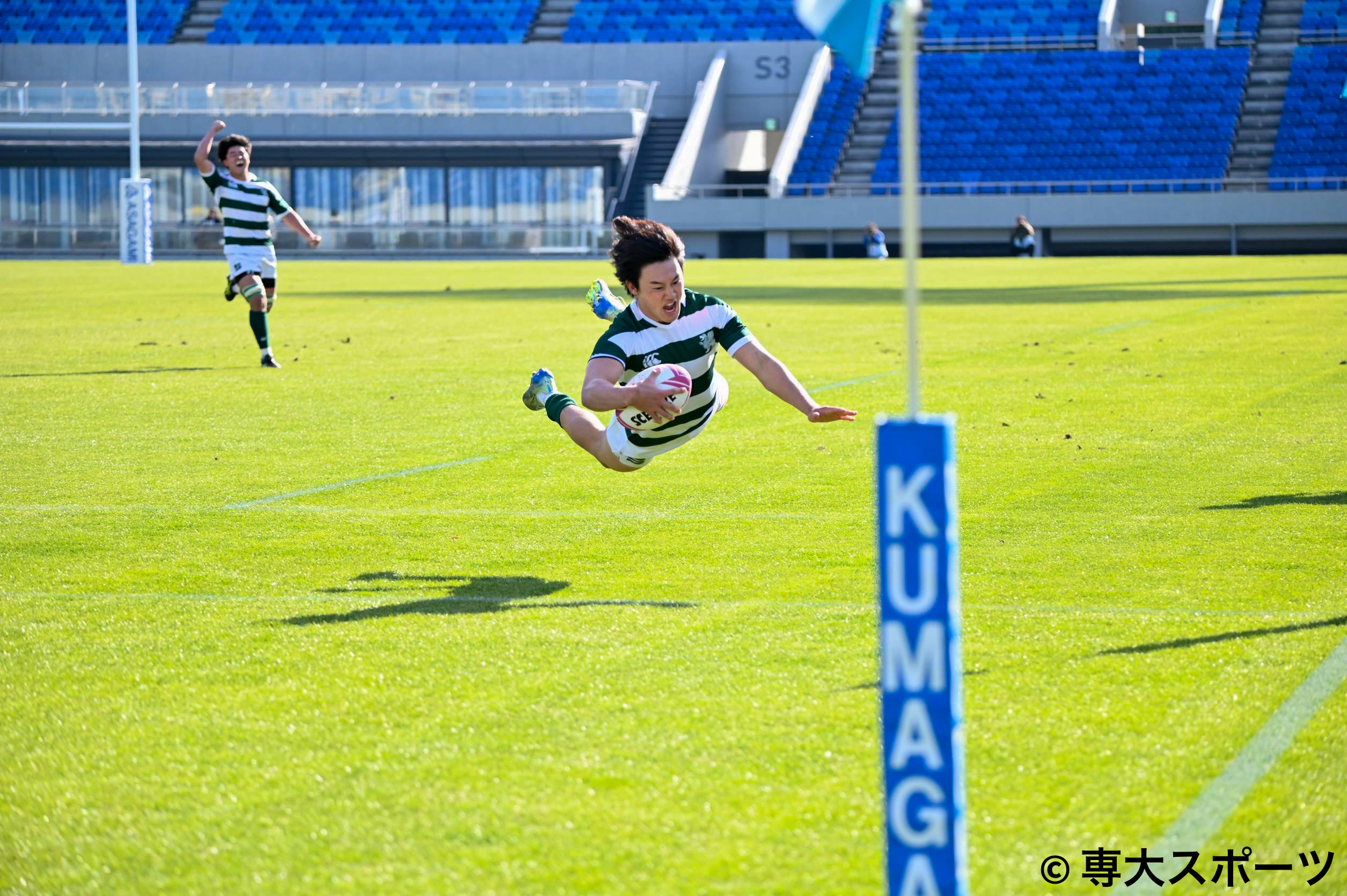 試合終了間際には再びトライを奪い、勝利を手中に収める。敵陣でWTB佐藤瑛斗(経済2・日川高)のビッグゲインで22mライン以内まで持ち運ぶ。佐藤瑛斗のチャンスメイクからフォワードの連続アタックで攻め込み、最後は神園からパスを受けたFL今村琉慈(経済3・國學院大學栃木高)のトライで14点差をつける。