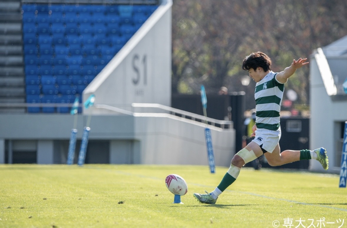 2022年以来の再戦となる大東大との一戦。前半は、早い時間帯で専大が先制すると、拮抗した展開が続く。専大は前半序盤、敵陣22m左サイドでのラインアウトから中央にボールを繋いで攻め込み、相手のオフサイド(ボール保持側のチームの選手が、ボールを保持する選手よりも前方にいる反則)を誘発。永井はショットを選択し、前半3分にPGで早くも先制に成功。